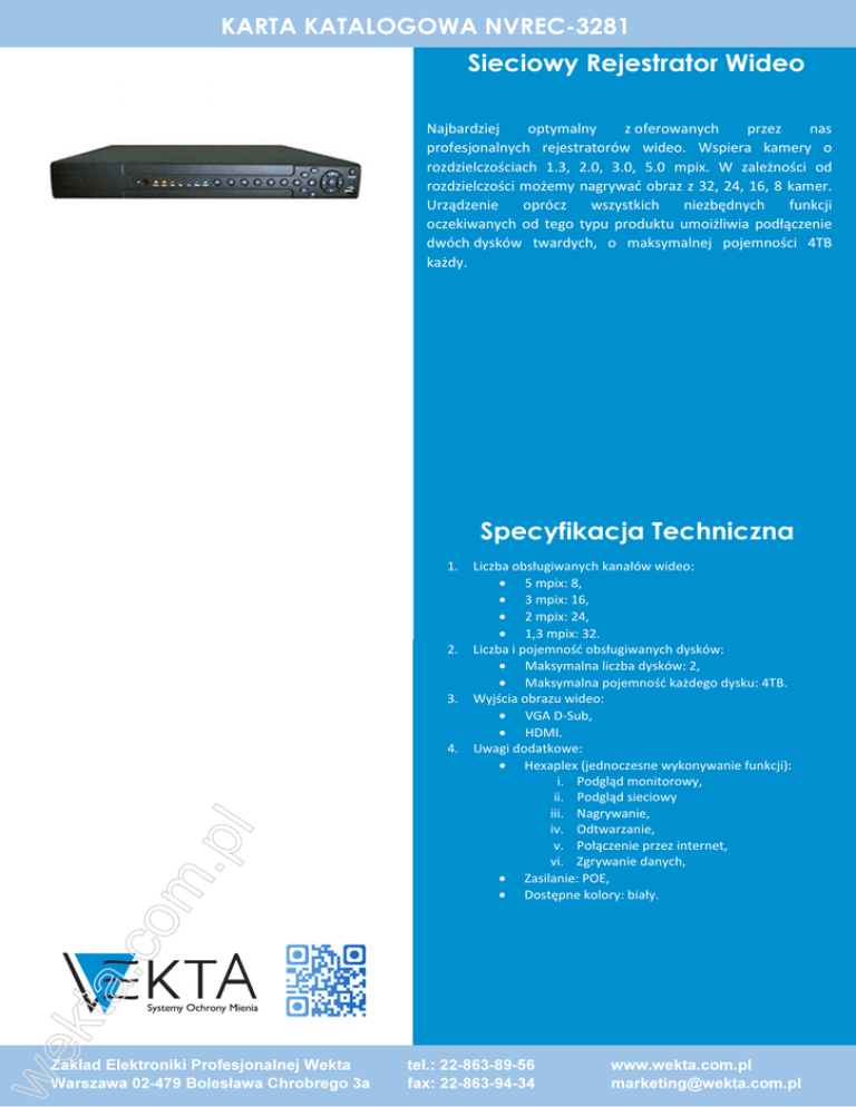 KARTA KATALOGOWA NVREC-3281 Sieciowy Rejestrator Wideo Najbardziej optymalny z oferowanych przez nas profesjonalnych rejestratorów wideo. Wspiera kamery o rozdzielczościach 1.3, 2.0, 3.0, 5.0 mpix. W zależności od rozdzielczości możemy nagrywać obraz z 32, 24, 16, 8 kamer. Urządzenie oprócz wszystkich niezbędnych funkcji oczekiwanych od tego typu produktu umoiżliwia podłączenie dwóch dysków twardych, o maksymalnej pojemności 4TB każdy. Specyfikacja Techniczna 1. 2. 3. 4. Zakład Elektroniki Profesjonalnej Wekta Warszawa 02-479 Bolesława Chrobrego 3a Liczba obsługiwanych kanałów wideo: • 5 mpix: 8, • 3 mpix: 16, • 2 mpix: 24, • 1,3 mpix: 32. Liczba i pojemność obsługiwanych dysków: • Maksymalna liczba dysków: 2, • Maksymalna pojemność każdego dysku: 4TB. Wyjścia obrazu wideo: • VGA D-Sub, • HDMI. Uwagi dodatkowe: • Hexaplex (jednoczesne wykonywanie funkcji): i. Podgląd monitorowy, ii. Podgląd sieciowy iii. Nagrywanie, iv. Odtwarzanie, v. Połączenie przez internet, vi. Zgrywanie danych, • Zasilanie: POE, • Dostępne kolory: biały. tel.: 22-863-89-56 fax: 22-863-94-34 www.wekta.com.pl [email protected]