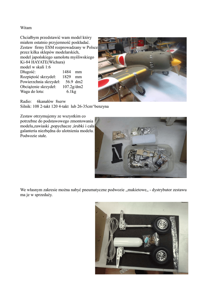 Witam Chciałbym przedstawić wam model który miałem ostatnio przyjemność poskładać. Zestaw firmy ESM rozprowadzany w Polsce przez kilka sklepów modelarskich, model japońskiego samolotu myśliwskiego Ki-84 HAYATE(Wichura) model w skali 1:6 Długość: 1484 mm Rozpiętość skrzydeł: 1829 mm Powierzchnia skrzydeł: 56.9 dm2 Obciążenie skrzydeł: 107.2g/dm2 Waga do lotu: 6.1kg Radio: 6kanałów 8serw Silnik: 108 2-takt 120 4-takt lub 26-35cm^benzyna Zestaw otrzymujemy ze wszystkim co potrzebne do podstawowego zmontowania modelu,zawiaski ,popychacze ,śrubki i cała galanteria niezbędna do ulotnienia modelu. Podwozie stałe. We własnym zakresie można nabyć pneumatyczne podwozie ,,makietowe,, - dystrybutor zestawu ma je w sprzedaży. Silnik i wyposażenie RC, to niestety musimy mieć lub nabyć, żeby cieszyć się naszym nowym nabytkiem, jako modelem latającym, ale nikt nie zabroni nam wykonać makiety wystawowej. Sam zestaw otrzymujemy w solidnym kartonie,wszystko zgrabnie opakowane w woreczki foliowe i gąbkę .Jednym słowem do transportu solidnie zapakowane. Model to skorupa laminatowa z wklejonymi wręgami i półką pod serwa,dość lekko wykonana, tu muszę zwrócić uwagę na wklejone wręgi, są bardzo dobrze wpasowane w bryłę kadłuba , jak na zestaw, wzorowo wklejone. Zdarzają się w tego typu produktach niedoklejenia, i wszystko wypada z modelu przy próbie montażu .Skrzydła i stateczniki to klasyczna modelarska konstrukcja z balsy i sklejki wielowarstwowej, wykończona i pomalowana . Można się czepiać że nity są wklęsłe,linie podziału nie zbyt idealne, ale model jest elegancko pomalowany matowymi farbami, i ma ładny makietowy wygląd. Może się podobać i podoba się. Jedyne elementy do których można mieć zastrzeżenia (ocena subiektywna nie umniejsza w żadnym stopniu wartości modelu), to wytłoczka kabiny i maskownice wnęk podwozia. Nie chodzi o to że są źle zrobione, ale o materiał z którego są wykonane, ten materiał zachowuje się jak szkło,łatwo pęka przy punktowym nacisku, i słabo się klei. Przy cięciu najlepiej korzystać z piłki obrotowej ,,DREMEL,, a nie z nożyczek bo one kruszą ten materiał. Oznacza to że wypadku uszkodzenia , mamy kłopot. Można zamówić detal, ale łatwiej zrobić sobie odlew z gipsu i na takim kopytku wykonać zapasowy element. Montaż zaczynamy od wklejenia statecznika poziomego, korzystając z załączonego szablonu należy nawiercić otwory pod rurę i kołek ustalający, w miejscu wklejenia statecznika poziomego, powierzchnie pod klej należy trochę przetrzeć, żeby nie kleić do lakieru ale do modelu. Wytłoczka na kadłubie ma już zadany kąt natarcia statecznika,ale przed sklejeniem dobrze jest upewnić się że statecznik ma zerowy kąt do osi podłużnej modelu. Oczywiście dobrze jest postarać się o zachowanie kąta prostego , między statecznikiem pionowym a poziomym. Zawiasy proponowane przez producenta są bardzo dobre. W sterach poziomym jak i pionowym, lotkach i klapach są wywiercone otworki pod zawiasy .Tu producent daje nam możliwość wyboru typu zawiasu, w zestawie u mnie, były przygotowane otwory pod płytkowe zawiasy jak i pod bolcowe ;-) Są otwory pod łącznik połówek steru wysokości. Na tym etapie montażu należy przygotować linki napędu sterów . Ważne żeby przymocować linki napędu steru wysokości, kiedy mamy jeszcze łatwy dostęp do dźwigni. Potem można spokojnie montować resztę sterowania ogona w postaci cięgien steru kierunku, i sterowania kółka ogonowego, które w zestawie jest sterowane przez popychacz od steru kierunku. Kółko ogonowe jest mocowane do ostatniej wręgi w kadłubie - proste mocowanie z tworzywa, i oś odpowiednio ukształtowana, oraz orczyk do sterowania. Ja w zestawie wbudowałem chowane kółko ogonowe. To zwiększa masę ogona, ale bez przesady, i tak trzeba akumulator umieścić max: z przodu ze względu na wyważenie. W trakcie montażu zdarza się że mamy palce poplamione farbą lub klejem itd.:-) Dlatego polecam zasłonić sobie na ten czas trochę kadłub papierem, żeby spokojnie można było przy modelu manipulować. Model ma matowy kolor, bardzo ładny zresztą ale bardzo łatwo się brudzi tłuszczami czy klejem. Ciekawe jak przetrwa paliwa w trakcie eksploatacji? - podobno nieźle. Dalszy etap to montaż serw napędzających stery. Zbiornika paliwa i powietrza Przymiarka i montaż silnika. W montowanym egzemplarzu zastosowałem silnik benzynowy o poj35cm. MT 35 dane silnika moc ok 3,5hp masa 1100gram z wyposażeniem śmigła 16/8-20/8 Ten silnik montuje się w klasycznym łożu silnikowym, które pasuje pod silniki 120-180 metanol. Pod maską sporo miejsca można poszaleć . Przy odrobinie pomysłowości można uzbroić model w napęd elektryczny i moduł symulujący odpowiedni dźwięk. Ogonek modelu ciężki, powstała konieczność wykonania półki na akumulatory, żeby uniknąć ołowiu. W ogóle polecam sprawdzać w trakcie montażu wyważenie, producent w instrukcji trochę za bardzo z tyłu sugeruje umieścić wyposażenie, to może sprawić kłopot z wyważeniem modelu. Chyba że zamocowaliśmy bardzo ciężki silnik;-))) Trzeba się zastanowić czy mamy możliwości transportowe żeby podróżować z prawie 2metrowym skrzydłem;-) jak tak to korzystając z szablonu możemy skleić obie połówki skrzydła, można zamocować serwa lotek i klap, oraz popychaczy, korzystając z zamieszczonej instrukcji. Montaż nie stanowi większego problemu, mocując podwozie należy się przyjrzeć czy wszystko jest wklejone solidnie. Producent wzmocnił mocowanie podwozia płytkami laminatowymi, ale pod mechanizmy pneumatyczne potrzeba podłożyć 1mm kawałki sklejki i odrobinę jest za płytka komora. Ale to nie problem. Teraz można zasłonić wnęki plastikami dodanymi przez producenta, ale ja osobiście z nich zrezygnowałem. Nic nie wnoszą a tylko komplikują montaż, zabezpieczyłem komory podwozia lakie
