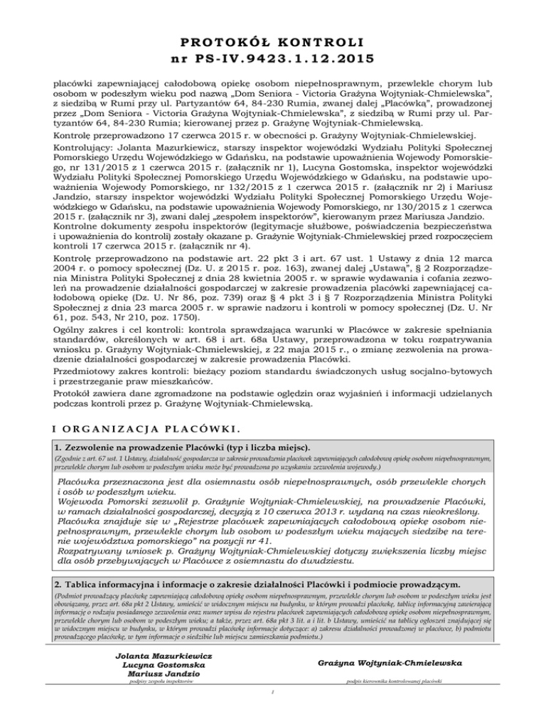 PROTOKÓŁ KONTROLI n r P S - I V . 9 4 2 3 . 1 . 1 2 . 2015 placówki zapewniającej całodobową opiekę osobom niepełnosprawnym, przewlekle chorym lub osobom w podeszłym wieku pod nazwą „Dom Seniora - Victoria Grażyna Wojtyniak-Chmielewska”, z siedzibą w Rumi przy ul. Partyzantów 64, 84-230 Rumia, zwanej dalej „Placówką”, prowadzonej przez „Dom Seniora - Victoria Grażyna Wojtyniak-Chmielewska”, z siedzibą w Rumi przy ul. Partyzantów 64, 84-230 Rumia; kierowanej przez p. Grażynę Wojtyniak-Chmielewską. Kontrolę przeprowadzono 17 czerwca 2015 r. w obecności p. Grażyny Wojtyniak-Chmielewskiej. Kontrolujący: Jolanta Mazurkiewicz, starszy inspektor wojewódzki Wydziału Polityki Społecznej Pomorskiego Urzędu Wojewódzkiego w Gdańsku, na podstawie upoważnienia Wojewody Pomorskiego, nr 131/2015 z 1 czerwca 2015 r. (załącznik nr 1), Lucyna Gostomska, inspektor wojewódzki Wydziału Polityki Społecznej Pomorskiego Urzędu Wojewódzkiego w Gdańsku, na podstawie upoważnienia Wojewody Pomorskiego, nr 132/2015 z 1 czerwca 2015 r. (załącznik nr 2) i Mariusz Jandzio, starszy inspektor wojewódzki Wydziału Polityki Społecznej Pomorskiego Urzędu Wojewódzkiego w Gdańsku, na podstawie upoważnienia Wojewody Pomorskiego, nr 130/2015 z 1 czerwca 2015 r. (załącznik nr 3), zwani dalej „zespołem inspektorów”, kierowanym przez Mariusza Jandzio. Kontrolne dokumenty zespołu inspektorów (legitymacje służbowe, poświadczenia bezpieczeństwa i upoważnienia do kontroli) zostały okazane p. Grażynie Wojtyniak-Chmielewskiej przed rozpoczęciem kontroli 17 czerwca 2015 r. (załącznik nr 4). Kontrolę przeprowadzono na podstawie art. 22 pkt 3 i art. 67 ust. 1 Ustawy z dnia 12 marca 2004 r. o pomocy społecznej (Dz. U. z 2015 r. poz. 163), zwanej dalej „Ustawą”, § 2 Rozporządzenia Ministra Polityki Społecznej z dnia 28 kwietnia 2005 r. w sprawie wydawania i cofania zezwoleń na prowadzenie działalności gospodarczej w zakresie prowadzenia placówki zapewniającej całodobową opiekę (Dz. U. Nr 86, poz. 739) oraz § 4 pkt 3 i § 7 Rozporządzenia Ministra Polityki Społecznej z dnia 23 marca 2005 r. w sprawie nadzoru i kontroli w pomocy społecznej (Dz. U. Nr 61, poz. 543, Nr 210, poz. 1750). Ogólny zakres i cel kontroli: kontrola sprawdzająca warunki w Placówce w zakresie spełniania standardów, określonych w art. 68 i art. 68a Ustawy, przeprowadzona w toku rozpatrywania wniosku p. Grażyny Wojtyniak-Chmielewskiej, z 22 maja 2015 r., o zmianę zezwolenia na prowadzenie działalności gospodarczej w zakresie prowadzenia Placówki. Przedmiotowy zakres kontroli: bieżący poziom standardu świadczonych usług socjalno-bytowych i przestrzeganie praw mieszkańców. Protokół zawiera dane zgromadzone na podstawie oględzin oraz wyjaśnień i informacji udzielanych podczas kontroli przez p. Grażynę Wojtyniak-Chmielewską. I ORGANIZACJA PLACÓWKI. 1. Zezwolenie na prowadzenie Placówki (typ i liczba miejsc). (Zgodnie z art. 67 ust. 1 Ustawy, działalność gospodarcza w zakresie prowadzenia placówek zapewniających całodobową opiekę osobom niepełnosprawnym, przewlekle chorym lub osobom w podeszłym wieku może być prowadzona po uzyskaniu zezwolenia wojewody.) Placówka przeznaczona jest dla osiemnastu osób niepełnosprawnych, osób przewlekle chorych i osób w podeszłym wieku. Wojewoda Pomorski zezwolił p. Grażynie Wojtyniak-Chmielewskiej, na prowadzenie Placówki, w ramach działalności gospodarczej, decyzją z 10 czerwca 2013 r. wydaną na czas nieokreślony. Placówka znajduje się w „Rejestrze placówek zapewniających całodobową opiekę osobom niepełnosprawnym, przewlekle chorym lub osobom w podeszłym wieku mających siedzibę na terenie województwa pomorskiego” na pozycji nr 41. Rozpatrywany wniosek p. Grażyny Wojtyniak-Chmielewskiej dotyczy zwiększenia liczby miejsc dla osób przebywających w Placówce z osiemnastu do dwudziestu. 2. Tablica informacyjna i informacje o zakresie działalności Placówki i podmiocie prowadzącym. (Podmiot prowadzący placówkę zapewniającą całodobową opiekę osobom niepełnosprawnym, przewlekle chorym lub osobom w podeszłym wieku jest obowiązany, przez art. 68a pkt 2 Ustawy, umieścić w widocznym miejscu na budynku, w którym prowadzi placówkę, tablicę informacyjną zawierającą informację o rodzaju posiadanego zezwolenia oraz numer wpisu do rejestru placówek zapewniających całodobową opiekę osobom niepełnosprawnym, przewlekle chorym lub osobom w podeszłym wieku; a także, przez art. 68a pkt 3 lit. a i lit. b Ustawy, umieścić na tablicy ogłoszeń znajdującej się w widocznym miejscu w budynku, w którym prowadzi placówkę informacje dotyczące: a) zakresu działalności prowadzonej w placówce, b) podmiotu prowadzącego placówkę, w tym informacje o siedzibie lub miejscu zamieszkania podmiotu.) Jolanta Mazurkiewicz Lucyna Gostomska Mariusz Jandzio Grażyna Wojtyniak-Chmielewska podpisy zespołu inspektorów podpis kierownika kontrolowanej placówki 1 Protokół nr PS-IV.9423.1.12.2015 z przeprowadzonej w dniu 17 czerwca 2015 r. kontroli standardu świadczonych usług oraz przestrzegania praw mieszkańców przez placówkę zapewniającą całodobową opiekę osobom niepełnosprawnym, przewlekle chorym lub osobom w podeszłym wieku pod nazwą „Dom Seniora – Victoria Grażyna Wojtyniak-Chmielewska”, z siedzibą w Rumi przy ul. Partyzantów 64, 84-230 Rumia. Na zewnątrz budynku Placówki znajduje się tablica zawierająca nazwę, rodzaj posiadanego zezwolenia oraz numer wpisu Placówki do prowadzonego przez Wojewodę Pomorskiego, „Rejestru placówek zapewniających całodobową opiekę osobom niepełnosprawnym, przewlekle chorym lub osobom w podeszłym wieku mających siedzibę na terenie województwa pomorskiego” (41). W budynku Placówki umieszczono, na tablicy ogłoszeń, informacje dotyczące zakresu działalności prowadzonej w Placówce i podmiotu prowa