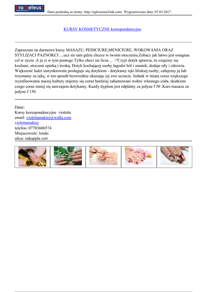 Dane pochodzą ze strony: http://ogloszenia24uk.com/. Wygenerowano dnia: 07-03-2017. KURSY KOSMETYCZNE korespondencyjne Zapraszam na darmowe kursy MASAZU, PEDICIURE,MENICIURE, WOKOWANIA ORAZ STYLIZACI PAZNOKCI ....ucz sie tam gdzie chcesz w twoim otoczeniu.Zobacz jak latwo jest osiagnac cel w zyciu .A ja ci w tym pomoge Tylko checi sie licza ... \"Czyjś dotyk sprawia, że czujemy się kochani, otoczeni opieką i troską. Dotyk kochającej osoby łagodzi ból i smutek, dodaje siły i zdrowia. Większość ludzi instynktownie posługuje się dotykiem - dotykamy ręki bliskiej osoby, całujemy ją lub trzymamy za rękę, w ten sposób bezwiednie okazując jej swe uczucie. Jednak w miarę coraz większego wyrafinowania naszej kultury stajemy się coraz bardziej zahamowani wobec własnego ciała, skutkiem czego coraz mniej się nawzajem dotykamy. Kazdy dyplom jest odplatny za jedyne f 50 .Kurs masazu za jedyne f 150 Dane: Kursy korespondencyjne violetta email: [email protected] violettamakiej telefon: 07703606574 Miejscowość: londo ulica: oakappla cort