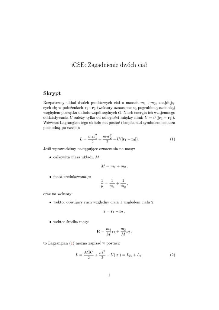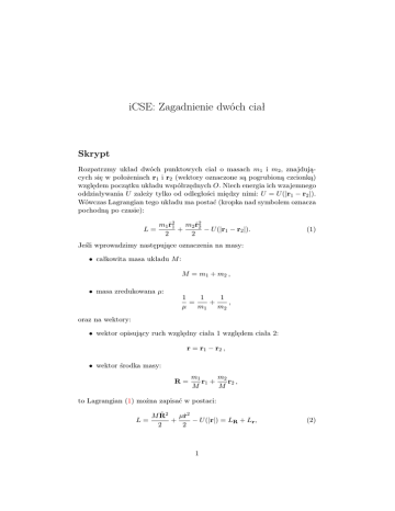 iCSE: Zagadnienie dwóch ciał Skrypt Rozpatrzmy układ dwóch punktowych ciał o masach m1 i m2 , znajdujących się w położeniach r1 i r2 (wektory oznaczone są pogrubioną czcionką) względem początku układu współrzędnych O. Niech energia ich wzajemnego oddziaływania U zależy tylko od odległości między nimi: U = U (|r1 − r2 |). Wówczas Lagrangian tego układu ma postać (kropka nad symbolem oznacza pochodną po czasie): L= m1 ṙ21 m2 ṙ22 + − U (|r1 − r2 |). 2 2 (1) Jeśli wprowadzimy następujące oznaczenia na masy: • całkowita masa układu M : M = m1 + m2 , • masa zredukowana µ: 1 1 1 = + , µ m1 m2 oraz na wektory: • wektor opisujący ruch względny ciała 1 względem ciała 2: r = r1 − r2 , • wektor środka masy: R= m1 m2 r1 + r2 , M M to Lagrangian (1) można zapisać w postaci: L= M Ṙ2 µṙ2 + − U (|r|) = LR + Lr , 2 2 1 (2) m1 r R r1 m2 r2 O Rysunek 1: Przykładowy układ wektorów r1 i r2 oraz mas m1 < m2 . Rozpatrzmy następnie rzeczywisty układ: m1 = mZ oraz m2 = mS , gdzie mZ to masa Ziemi, a mS to masa Słońca. Zakładając, że orbita Ziemska jest okręgiem o promieniu wielkości jednej jednostki asronomiczej (1 AU), którego środek leży w środku Słońca oraz przyjmując ten środek za początek układu współrzędnych (tj. r = r1 , |r| = 1AU, r2 = 0), otrzymamy: µ ≈ mZ , M ≈ mS oraz |R| < RS , gdzie RS to promień Słońca (środek masy rozpatrywanego układu leży wewnątrz Słońca). Przystąpmy następnie do analizy równań ruchu Lagrange’a: M Ṙ2 (3) 2 opisuje ruch środka masy układu dwóch ciał – jest to ruch cząstki swobodnej o masie M – ruch prostoliniowy i jednostajny, LR = µṙ2 − U (|r|) (4) 2 opisuje ruch względny jednego ciała względem drugiego – jest to ruch cząstki o masie µ w polu zewnętrznym U (|r|). Lr = Zatem ruch dwóch ciał możemy sprowadzić do ruchu układu jako całości oraz ruchu względnego. Jeżeli wybierzemy układ odniesienia związany ze środkiem masy układu dwóch ciał to wówczas R = 0. Układ dwóch ciał jako całość spoczywa w tym układzie odniesienia i to w początku tego układu. Początek układu współrzędnych znajduje się zatem w środku masy układu ciał. Zajmijmy się zatem ruchem opisanym Lagrangianem Lr – jest to ruch ciała w polu o symetrii sferycznej. Jeżeli energia potencjalna punktu U materialnego zależy tylko od odległości od pewnego nieruchomego punktu w 2 przestrzeni, jak w naszym przypadku, to pole takie nazywa się polem centralnym. Siła działająca na ten punkt materialny wynosi: F = −grad U (r) = − ∂U (r) ∂U (r) ∂U (r) ex − ey − ez , ∂x ∂y ∂z gdzie: r = xex + yey + zez , r = |r| = p x2 + y 2 + z 2 . Obliczając odpowiednie pochodne: ∂U (r) ∂r ∂U (r) x ∂U (r) = = , ∂x ∂r ∂x ∂r r podobnie dla y i z, otrzymujemy, że F ma taki sam kierunek jak r : F=− ∂U (r) r . ∂r r Użyjmy następnie powyższych obliczeń do pokazania, że w polu centralnym zachowany jest moment pędu J = r × p względem centrum (źródła pola): J̇ = ṙ × p + r × ṗ = v × mv + r × F ∂U (r) r = 0, = 0+r× − ∂r r przy czym w naszym przypadku m = µ. Ponieważ J jest stały i prostopadły do promienia wodzącego r i prędkości cząstki v, więc ruch odbywa się w płaszczyźnie prostopadłej do J, czyli jest to ruch płaski. Dalszą dyskusję będziemy prowadzili w układzie sferycznym – przepiszmy zatem Lagrangian Lr w tym układzie: 1 Lr = µ(ṙ2 + r2 θ̇2 + r2 sin2 θφ̇2 ) − U (r) . 2 (5) Zgodnie z naszymi poprzednimi rozważaniami (rozpatrywany ruch jest ruchem płaskim) z r, θ, φ trzeba wybrać dwie współrzędne. Jeżeli ustalimy θ = π/2 to ruch będzie odbywać się w płaszczyźnie (x, y), a J będzie skierowany wzdłuż osi z : J = Jez . wówczas Lagrangian Lr uprości się do (θ̇ = 0, sin θ = 1): 1 Lr = µ(ṙ2 + r2 φ̇2 ) − U (r) . (6) 2 Równanie ruchu cząstki r = r(φ) otrzymamy rozwiązując układ równań Lagrange’a: ∂Lr d ∂Lr − = 0 ∂r dt ∂ ṙ (7) ∂L d ∂L r r − = 0 ∂φ dt ∂ φ̇ 3 Drugie z równań (7) daje nam J˙ = 0 : µr2 φ̇ = J . (8) Z pierwszego z równań (7) otrzymamy: µ(r̈ − rφ̇2 ) = Fr , (9) gdzie: Fr = −∂U (r)/∂r to radialna składowa siły. Obliczmy następnie (φ̇ = J/µr2 ): J ∂ 1 dr ∂r ∂r J =− , ṙ = = φ̇ = dt ∂φ ∂φ µr2 µ ∂φ r podobnie, korzystając z powyższego wyniku, obliczamy: r̈ = dṙ J 2 ∂2 =− 2 2 2 dt µ r ∂φ 1 r . Stosując wyniki powyższych obliczeń do (9) otrzymujemy wzór Bineta: ∂2 ∂φ2 1 r + 1 µr2 = − 2 Fr . r J (10) Z równania (10), zakładając U (r) = −α/r (wtedy Fr = −α/r2 ), znajdujemy tor cząstki r = r(φ) (krzywe stożkowe): p =r 1 + e cos(φ − φ0 ) gdzie: p = J 2 /(µα), e = √ (11) 1 + 2Ep to mimośród: e = 0 okrąg, e < 1 elipsa, e = 1 parabola, e > 1 hiperbola. Występujący w definicji e symbol E oznacza całkowitą energię układu: E = = = ∂Lr ∂Lr ṙ + φ̇ − Lr ∂ ṙ ∂ φ̇ 1 µ(ṙ2 + r2 φ̇2 ) + U (r) 2 1 2 J2 µṙ + + U (r) . 2 2µr2 Rozpatrywany przez nas układ ma dwie całki ruchu: J˙ = 0 oraz Ė = 0. 4 Zadania Zadanie 1. Sprawdź przejście i ) z (1) do (2), a następnie ii ) z (4) do (5). Zadanie 2. Oblicz składowe wektora momentu pędu J w układzie sferycznym, porównaj uzyskany wynik z (8). Zadanie 3. Sprawdź, że (11) jest faktycznie rozwiązaniem (10) dla dowol√ nego e (tzn. niekoniecznie dla e = 1 + 2Ep). 5