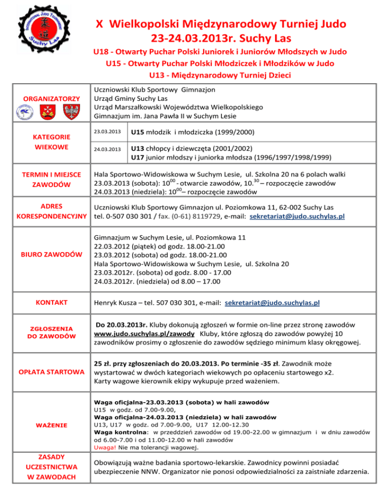 X Wielkopolski Międzynarodowy Turniej Judo 23-24.03.2013r. Suchy Las U18 - Otwarty Puchar Polski Juniorek i Juniorów Młodszych w Judo U15 - Otwarty Puchar Polski Młodziczek i Młodzików w Judo U13 - Międzynarodowy Turniej Dzieci ORGANIZATORZY KATEGORIE WIEKOWE TERMIN I MIEJSCE ZAWODÓW Uczniowski Klub Sportowy Gimnazjon Urząd Gminy Suchy Las Urząd Marszałkowski Województwa Wielkopolskiego Gimnazjum im. Jana Pawła II w Suchym Lesie 23.03.2013 U15 młodzik i młodziczka (1999/2000) 24.03.2013 U13 chłopcy i dziewczęta (2001/2002) U17 junior młodszy i juniorka młodsza (1996/1997/1998/1999) Hala Sportowo-Widowiskowa w Suchym Lesie, ul. Szkolna 20 na 6 polach walki 23.03.2013 (sobota): 1000 - otwarcie zawodów, 10.30 – rozpoczęcie zawodów 24.03.2013 (niedziela): 1000– rozpoczęcie zawodów ADRES Uczniowski Klub Sportowy Gimnazjon ul. Poziomkowa 11, 62-002 Suchy Las KORESPONDENCYJNY tel. 0-507 030 301 / fax. (0-61) 8119729, e-mail: [email protected] BIURO ZAWODÓW KONTAKT ZGŁOSZENIA DO ZAWODÓW OPŁATA STARTOWA Gimnazjum w Suchym Lesie, ul. Poziomkowa 11 22.03.2012 (piątek) od godz. 18.00-21.00 23.03.2012 (sobota) od godz. 18.00-21.00 Hala Sportowo-Widowiskowa w Suchym Lesie, ul. Szkolna 20 23.03.2012r. (sobota) od godz. 8.00 - 17.00 24.03.2012r. (niedziela) od 8.00 – 17.00 Henryk Kusza – tel. 507 030 301, e-mail: [email protected] Do 20.03.2013r. Kluby dokonują zgłoszeń w formie on-line przez stronę zawodów www.judo.suchylas.pl/zawody Kluby, które zgłoszą do zawodów powyżej 10 zawodników prosimy o zgłoszenie do zawodów sędziego minimum klasy okręgowej. 25 zł. przy zgłoszeniach do 20.03.2013. Po terminie -35 zł. Zawodnik może wystartować w dwóch kategoriach wiekowych po opłaceniu startowego x2. Karty wagowe kierownik ekipy wykupuje przed ważeniem. WAŻENIE Waga oficjalna-23.03.2013 (sobota) w hali zawodów U15 w godz. od 7.00-9.00, Waga oficjalna-24.03.2013 (niedziela) w hali zawodów U13, U17 w godz. od 7.00-9.00, U17 12.00-12.30 Waga kontrolna: w przeddzień zawodów od 19.00-22.00 w gimnazjum i w dniu zawodów od 6.00-7.00 i od 11.00-12.00 w hali zawodów Uwaga! Nie ma tolerancji wagowej. ZASADY UCZESTNICTWA W ZAWODACH Obowiązują ważne badania sportowo-lekarskie. Zawodnicy powinni posiadać ubezpieczenie NNW. Organizator nie ponosi odpowiedzialności za zaistniałe zdarzenia. 23.03.2013r./sobota/ Kategorie U15 chłopcy U15 dziewczęta Waga 00 00 7 -9 Start 30 10 Rocznik 1999/00 1999/00 Kategorie wagowe -38,-42,-46,-50,-55,-60,- 66,-73,-81,+81 -36,-40,-44,-48,-52,-57,-63,-70,+70 Czas 3 min 3 min 24.03.2013r./niedziela/ PROGRAM ZAWODÓW LOSOWANIE Kategorie U13 chłopcy U13 dziewczęta U18 chłopcy U18 dziewczęta Waga 00 00 7 -9 00 00 7 -9 lub 00 30 12 -12 Start 00 10 00 13 Rocznik 2001/2 2001/2 1996/7/8/9 1996/7/8/9 Kategorie wagowe -27,-30,-33,-36,-39,-42,-46,-50,-55,-60,+60 -28,-32,-36,-40,-44,-48,-52,+52 -46,-50,-55,-60,-66,-73,-81,-90,+90 -40,-44,-48,-52,-57,-63,-70,+70 Czas 3 min 3 min 4 min 4 min Losowanie komputerowo pół godziny po zakończeniu ważenia. W klasyfikacji indywidualnej za miejsca 1 nagroda rzeczowa, 1-3 medale, 1-5 dyplomy. W klasyfikacji klubowej za miejsca 1-5 puchary i dyplomy na zakończenie turnieju. Dekoracja w trakcie zawodów po zakończeniu danej kategorii wagowej. Zawodnicy/czki wychodzą do dekoracji w białych judogach. NAGRODY SYSTEM PRZEPROWADZENIA ZAWODÓW PUNKTACJA KLUBOWA Zawody zostaną przeprowadzone zgodnie z obowiązującymi przepisami, System walk: 2 zawodników - do dwóch wygranych, 3-5 każdy z każdym, 6-8 brukselski, powyżej 8 system francuski z podwójnym repasażem. Dogrywki w formie GS z otwartym limitem czasu. Walki repasażowe odbędą się w pełnym czasie walki. W U13 zakaz stosowania kansetsu-waza i shime-waza. Punktacja: 1m-9pkt, 2m-7pkt, 3m-5,5pkt, 5m-3,5pkt, 7m-1,5pkt lub w przypadku systemu „każdy z każdym” – 1m-ilość zawodników+1, 2m o 2pkt mniej, kolejne po 1pkt mniej (zgodnie z §20, pkt 2 Regulaminu sportowego PZ Judo) ZAKWATEROWANIE Nocleg w sali judo – 10 zł/os (własny śpiwór), 100 miejsc Schronisko Młodzieżowe HANKA – 40 zł/os, 100 miejsc Hotel pod Kasztanem – 50 zł/os, 46 miejsc Pałac Biedrusko – 70 zł/os, 90 miejsc Hotel Ilonn – 70 zł/os w pokoju dwuosobowym, 130 zł za pokój jednoosobowy zgłoszenie u organizatora na karcie zamówień najpóźniej do 15.03.2013 [email protected] WYŻYWIENIE Gimnazjum: śniadania, kolacje – 10 zł/os, obiad – 15 zł/os, Pałac Biedrusko: śniadanie -10 zł/os obiad od 20,00 zł/os, Hotel Ilonn: śniadanie -15 zł/os, zgłoszenie u organizatora na karcie zamówień najpóźniej do 15.03.2013 [email protected] INFORMACJE DODATKOWE Na miejscu zawodów: sala rozgrzewkowa, bufet, restauracja, stoiska sportowe. Organizatorzy życzą miłego pobytu w Suchym Lesie