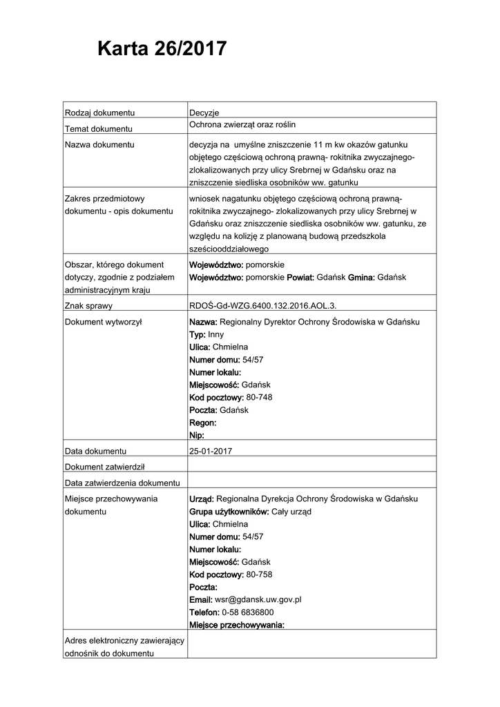 Karta 26/2017 Rodzaj dokumentu Decyzje Ochrona zwierząt oraz roślin Temat dokumentu Nazwa dokumentu decyzja na umyślne zniszczenie 11 m kw okazów gatunku objętego częściową ochroną prawną- rokitnika zwyczajnegozlokalizowanych przy ulicy Srebrnej w Gdańsku oraz na zniszczenie siedliska osobników ww. gatunku Zakres przedmiotowy dokumentu - opis dokumentu wniosek nagatunku objętego częściową ochroną prawnąrokitnika zwyczajnego- zlokalizowanych przy ulicy Srebrnej w Gdańsku oraz zniszczenie siedliska osobników ww. gatunku, ze względu na kolizję z planowaną budową przedszkola sześciooddziałowego Obszar, którego dokument dotyczy, zgodnie z podziałem administracyjnym kraju Województwo: pomorskie Województwo: pomorskie Powiat: Gdańsk Gmina: Gdańsk Znak sprawy RDOŚ-Gd-WZG.6400.132.2016.AOL.3. Dokument wytworzył Nazwa: Regionalny Dyrektor Ochrony Środowiska w Gdańsku Typ: Inny Ulica: Chmielna Numer domu: 54/57 Numer lokalu: Miejscowość: Gdańsk Kod pocztowy: 80-748 Poczta: Gdańsk Regon: Nip: Data dokumentu 25-01-2017 Dokument zatwierdził Data zatwierdzenia dokumentu Miejsce przechowywania dokumentu Adres elektroniczny zawierający odnośnik do dokumentu Urząd: Regionalna Dyrekcja Ochrony Środowiska w Gdańsku Grupa użytkowników: Cały urząd Ulica: Chmielna Numer domu: 54/57 Numer lokalu: Miejscowość: Gdańsk Kod pocztowy: 80-758 Poczta: Email: [email protected] Telefon: 0-58 6836800 Miejsce przechowywania: Czy dokument jest ostateczny tak/nie TAK Czy dokument jest zniszczony Numery kart innych dokumentów w sprawie Zastrzeżenia dotyczące nieudostępniania informacji Uwagi NIE