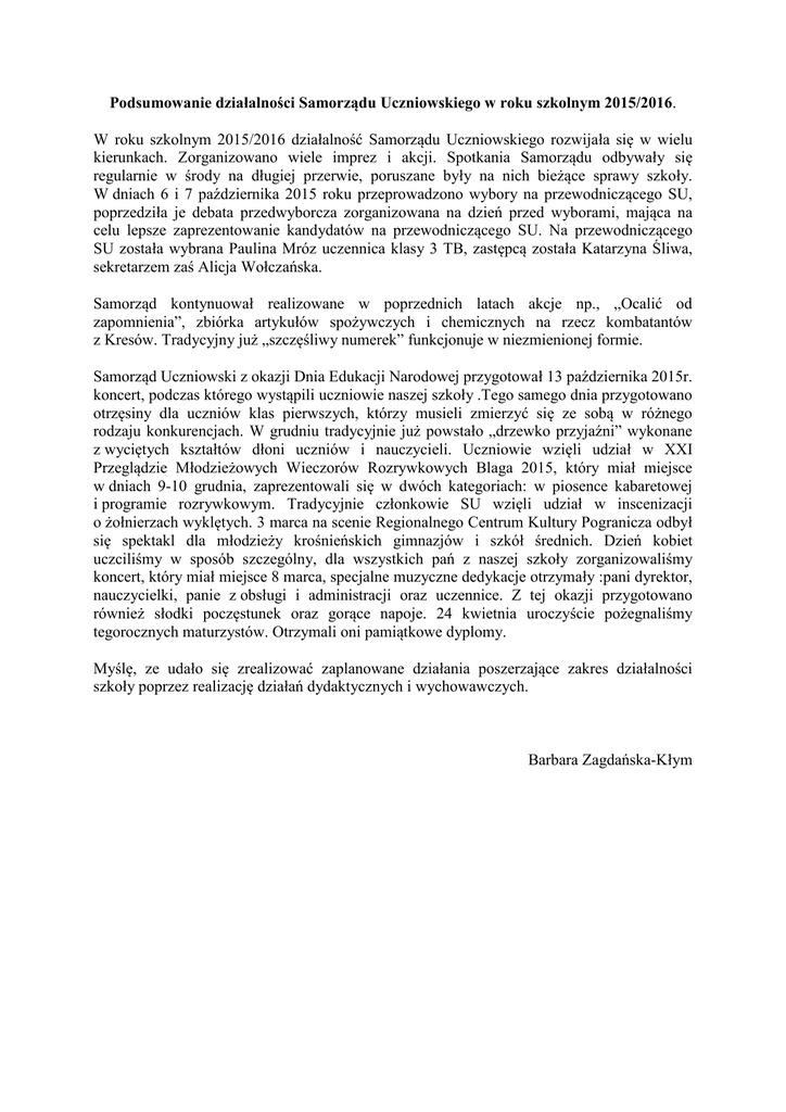 Podsumowanie działalności Samorządu Uczniowskiego w roku szkolnym 2015/2016. W roku szkolnym 2015/2016 działalność Samorządu Uczniowskiego rozwijała się w wielu kierunkach. Zorganizowano wiele imprez i akcji. Spotkania Samorządu odbywały się regularnie w środy na długiej przerwie, poruszane były na nich bieżące sprawy szkoły. W dniach 6 i 7 października 2015 roku przeprowadzono wybory na przewodniczącego SU, poprzedziła je debata przedwyborcza zorganizowana na dzień przed wyborami, mająca na celu lepsze zaprezentowanie kandydatów na przewodniczącego SU. Na przewodniczącego SU została wybrana Paulina Mróz uczennica klasy 3 TB, zastępcą została Katarzyna Śliwa, sekretarzem zaś Alicja Wołczańska. Samorząd kontynuował realizowane w poprzednich latach akcje np., „Ocalić od zapomnienia”, zbiórka artykułów spożywczych i chemicznych na rzecz kombatantów z Kresów. Tradycyjny już „szczęśliwy numerek” funkcjonuje w niezmienionej formie. Samorząd Uczniowski z okazji Dnia Edukacji Narodowej przygotował 13 października 2015r. koncert, podczas którego wystąpili uczniowie naszej szkoły .Tego samego dnia przygotowano otrzęsiny dla uczniów klas pierwszych, którzy musieli zmierzyć się ze sobą w różnego rodzaju konkurencjach. W grudniu tradycyjnie już powstało „drzewko przyjaźni” wykonane z wyciętych kształtów dłoni uczniów i nauczycieli. Uczniowie wzięli udział w XXI Przeglądzie Młodzieżowych Wieczorów Rozrywkowych Blaga 2015, który miał miejsce w dniach 9-10 grudnia, zaprezentowali się w dwóch kategoriach: w piosence kabaretowej i programie rozrywkowym. Tradycyjnie członkowie SU wzięli udział w inscenizacji o żołnierzach wyklętych. 3 marca na scenie Regionalnego Centrum Kultury Pogranicza odbył się spektakl dla młodzieży krośnieńskich gimnazjów i szkół średnich. Dzień kobiet uczciliśmy w sposób szczególny, dla wszystkich pań z naszej szkoły zorganizowaliśmy koncert, który miał miejsce 8 marca, specjalne muzyczne dedykacje otrzymały :pani dyrektor, nauczycielki, panie z obsługi i administracji oraz uczennice. Z tej okazji przygotowano również słodki poczęstunek oraz gorące napoje. 24 kwietnia uroczyście pożegnaliśmy tegorocznych maturzystów. Otrzymali oni pamiątkowe dyplomy. Myślę, ze udało się zrealizować zaplanowane działania poszerzające zakres działalności szkoły poprzez realizację działań dydaktycznych i wychowawczych. Barbara Zagdańska-Kłym