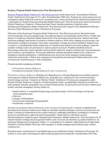 Krajowy Program Badań Naukowych i Prac Rozwojowych Krajowy Program Badań Naukowych i Prac Rozwojowych został ustanowiony Komunikatem Ministra Nauki i Szkolnictwa Wyższego Nr 22 z dnia 30 października 2008 roku. Program ten został ustanowiony po zasięgnięciu opinii środowisk naukowych, gospodarczych, a także przedstawicieli administracji państwowej i samorządowej. Projekt Krajowego Programu Badań Naukowych i Prac Rozwojowych opracował Komitet Polityki Naukowej i Naukowo-Technicznej Rady Nauki, Interdyscyplinarny Zespół do spraw Strategicznych Programów Badań Naukowych i Prac Rozwojowych, eksperci oraz Departament Strategii i Rozwoju Nauki Ministerstwa Nauki i Szkolnictwa Wyższego. Głównym celem Krajowego Programu Badań Naukowych i Prac Rozwojowych jest zdynamizowanie zrównoważonego rozwoju gospodarczego oraz poprawa jakości życia polskiego społeczeństwa. Dzięki okre ślonym w Krajowym Programie Badań Naukowych i Prac Rozwojowych priorytetom, finansowaniu bud żetowemu podlegać będą przede wszystkim te badania naukowe, które służą osiągnięciu powyższego celu. Zacieśnienie współpracy pomiędzy sferą nauki i gospodarki wymaga poważnych nakładów budżetowych, co sprawia, że problematyka badań naukowych we współczesnym państwie nie może podlegać wyłącznie zasadom wolnego rynku ani pozostawać w rękach samych uczonych. Współuczestnikami procesu decyzyjnego muszą być zatem rząd jako twórca polityki naukowej, naukowo-technicznej i innowacyjnej pa ństwa, badacze i przedsiębiorcy. Precyzyjnie dobierana tematyka projektów badawczych, zwłaszcza o charakterze interdyscyplinarnym i wielodziedzinowym, przyczyni się do integracji rozproszonego środowiska naukowego w Polsce oraz osiągnięcia nowej jakości prowadzonych badań naukowych i prac rozwojowych, konkurencyjnej w skali europejskiej. Program posiada następującą strukturę: Priorytetowe obszary badawcze, Strategiczne programy badań naukowych i prac rozwojowych. Priorytetowe obszary badawcze obejmują cele długookresowe, realizują długookresową politykę państwa zmierzającą do nadania działaniom badawczym, gospodarczym i społecznym cech zrównoważonego i skorelowanego rozwoju. Ustanawia je Minister Nauki i Szkolnictwa Wyższego po zasięgnięciu opinii Komitet Polityki Naukowej i Naukowo-Technicznej Rady Nauki, uwzględniając obiektywne możliwości nauki polskiej, potrzeby gospodarki oraz wysokość finansowania. Do priorytetowych obszarów badawczych zostały zaliczone następujące obszary badawcze: Społeczeństwo w warunkach bezpiecznego, przyspieszonego i zrównoważonego rozwoju spo łeczno-gospodarczego, Zdrowie, Energia i infrastruktura, Nowoczesne technologie dla gospodarki, Środowisko i rolnictwo. Strategiczne programy badań naukowych i prac rozwojowych mieszczą się w ramach wyodrębnionych priorytetowych obszarów badawczych. Mają one charakter interdyscyplinarny, chociaż są tematycznie zaw ężone. Cechują się średniookresowym czasem realizacji i podlegają modyfikacji wynikającej ze zmieniaj ących się uwarunkowań, zadań oraz potrzeb gospodarki i społeczeństwa. Określane są przez Interdyscyplinarny Zespół do spraw Strategicznych Programów Badań Naukowych i Prac Rozwojowych. W ramach tematów strategicznych programów badań i prac rozwojowych określane są zadania badawcze. Za realizację Strategicznych programów badań, a w szczególności za ustalenie zadań badawczych odpowiada Narodowe Centrum Badań i Rozwoju, które następnie w drodze postępowania konkursowego wyłania wykonawców. Koordynowanie wymienionych wyżej działań spoczywa na Ministrze Nauki i Szkolnictwa Wyższego. Po wejściu w życie ustaw reformujących sektor nauki przyjętych przez Sejm RP w październiku 2010 roku Koordynowanie wymienionych wyżej działań spoczywa na Ministrze Nauki i Szkolnictwa Wyższego. Po wejściu w życie ustaw reformujących sektor nauki przyjętych przez Sejm RP w październiku 2010 roku opracowany zostanie nowy Krajowy Program Badań.