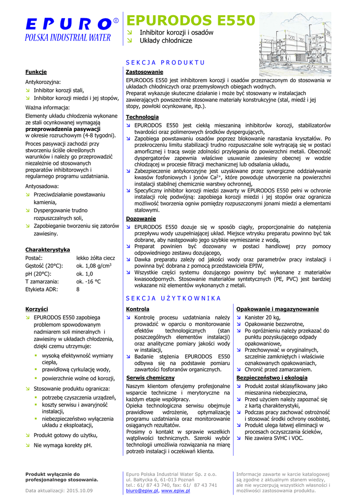 EPURODOS E550 Inhibitor korozji i osadów Układy chłodnicze SEKCJA PRODUKTU Funkcje Zastosowanie Antykorozyjna: EPURODOS E550 jest inhibitorem korozji i osadów przeznaczonym do stosowania w układach chłodniczych oraz przemysłowych obiegach wodnych. Preparat wykazuje skuteczne działanie i może być stosowany w instalacjach zawierających powszechnie stosowane materiały konstrukcyjne (stal, miedź i jej stopy, powłoki ocynkowane, itp.). Inhibitor korozji stali, Inhibitor korozji miedzi i jej stopów, Ważna informacja: Elementy układu chłodzenia wykonane ze stali ocynkowanej wymagają przeprowadzenia pasywacji w okresie rozruchowym (4-8 tygodni). Proces pasywacji zachodzi przy stworzeniu ściśle określonych warunków i należy go przeprowadzić niezależnie od stosowanych preparatów inhibitorowych i regularnego programu uzdatniania. Antyosadowa: Przeciwdziałanie powstawaniu kamienia, Dyspergowanie trudno rozpuszczalnych soli, Zapobieganie tworzeniu się zatorów zawiesiny. Charakterystyka Postać: Gęstość (20°C): pH (20°C): T zamarzania: Etykieta ADR: lekko żółta ciecz ok. 1,08 g/cm3 ok. 1,0 ok. -16 °C 8 Technologia EPURODOS E550 jest ciekłą mieszaniną inhibitorów korozji, stabilizatorów twardości oraz polimerowych środków dyspergujących, Zapobiega powstawaniu osadów poprzez blokowanie narastania kryształów. Po przekroczeniu limitu stabilizacji trudno rozpuszczalne sole wytrącają się w postaci amorficznej i tracą swoje zdolności przylegania do powierzchni metali. Obecność dyspergatorów zapewnia właściwe usuwanie zawiesiny obecnej w wodzie chłodzącej w procesie filtracji mechanicznej lub odsalania układu, Zabezpieczenie antykorozyjne jest uzyskiwane przez synergiczne oddziaływanie kwasów fosfoniowych i jonów Ca2+, które powoduje utworzenie na powierzchni instalacji stabilnej chemicznie warstwy ochronnej, Specyficzny inhibitor korozji miedzi zawarty w EPURODOS E550 pełni w ochronie instalacji rolę podwójną: zapobiega korozji miedzi i jej stopów oraz ogranicza możliwość tworzenia ogniw pomiędzy rozpuszczonymi jonami miedzi a elementami stalowymi. Dozowanie EPURODOS E550 dozuje się w sposób ciągły, proporcjonalnie do natężenia przepływu wody uzupełniającej układ. Miejsce wtrysku preparatu powinno być tak dobrane, aby następowało jego szybkie wymieszanie z wodą, Preparat powinien być dozowany w postaci handlowej przy pomocy odpowiedniego zestawu dozującego, Dawka preparatu zależy od jakości wody oraz parametrów pracy instalacji i powinna być dobrana z pomocą przedstawiciela EPIW, Wszystkie części systemu dozującego powinny być wykonane z materiałów kwasoodpornych. Stosowanie materiałów syntetycznych (PE, PVC) jest bardziej wskazane niż elementów wykonanych z metali. SEKCJA UŻYTKOWNIKA Korzyści Kontrola Opakowanie i magazynowanie EPURODOS E550 zapobiega problemom spowodowanym nadmiarem soli mineralnych i zawiesiny w układach chłodzenia, dzięki czemu utrzymuje: Kontrolę procesu uzdatniania należy prowadzić w oparciu o monitorowanie efektów technologicznych (stan poszczególnych elementów instalacji) oraz analityczne pomiary jakości wody w instalacji, Badanie stężenia EPURODOS E550 odbywa się na podstawie pomiaru zawartości fosforanów organicznych. Kanister 20 kg, Opakowanie bezzwrotne, Po opróżnieniu należy przekazać do punktu pozyskującego odpady opakowaniowe, Przechowywać w oryginalnych, szczelnie zamkniętych i właściwie oznakowanych opakowaniach, Chronić przed zamarzaniem. Serwis chemiczny Bezpieczeństwo i ekologia Naszym klientom oferujemy profesjonalne wsparcie techniczne i merytoryczne na każdym etapie współpracy. Opieka technologiczna serwisu obejmuje prawidłowe wdrożenie, optymalizację programu uzdatniania oraz monitorowanie osiąganych rezultatów. Prosimy o kontakt w sprawie wszelkich wątpliwości technicznych. Szeroki wybór technologii umożliwia rozwiązania na miarę potrzeb instalacji i oczekiwań klienta. Produkt został sklasyfikowany jako mieszanina niebezpieczna, Przed użyciem należy zapoznać się z kartą charakterystyki, Podczas pracy zachować ostrożność i stosować środki ochrony osobistej, Produkt ulega łatwej eliminacji w procesach oczyszczania ścieków, Nie zawiera SVHC i VOC. Epuro Polska Industrial Water Sp. z o.o. ul. Bałtycka 6, 61-013 Poznań tel.: 61/ 87 43 740, fax: 61/ 87 43 741 [email protected], www.epiw.pl Informacje zawarte w karcie katalogowej są zgodne z aktualnym stanem wiedzy, ale nie wyczerpują wszystkich własności i możliwości zastosowania produktu. wysoką efektywność wymiany ciepła, prawidłową cyrkulację wody, powierzchnie wolne od korozji, Stosowanie produktu ogranicza: potrzebę czyszczenia urządzeń, koszty serwisu i awaryjność instalacji, niebezpieczeństwo wyłączenia układu z eksploatacji, Produkt gotowy do użytku, Nie wymaga korekty pH. Produkt wyłącznie do profesjonalnego stosowania. Data aktualizacji: 2015.10.09