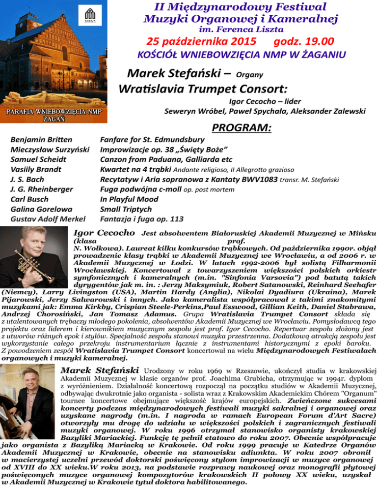 II Międzynarodowy Festiwal Muzyki Organowej i Kameralnej im. Ferenca Liszta 25 października 2015 godz. 19.00 KOŚCIÓŁ WNIEBOWZIĘCIA NMP W ŻAGANIU Marek Stefański – Organy Wratislavia Trumpet Consort: Igor Cecocho – lider Seweryn Wróbel, Paweł Spychała, Aleksander Zalewski PROGRAM: Benjamin Britten Mieczysław Surzyński Samuel Scheidt Vasiily Brandt J. S. Bach J. G. Rheinberger Carl Busch Galina Gorelowa Gustav Adolf Merkel Fanfare for St. Edmundsbury Improwizacje op. 38 „Święty Boże” Canzon from Paduana, Galliarda etc Kwartet na 4 trąbki Andante religioso, II Allegrotto grazioso Recytatyw i Aria sopranowa z Kantaty BWV1083 transr. M. Stefański Fuga podwójna c-moll op. post mortem In Playful Mood Small Triptych Fantazja i fuga op. 113 Igor Cecocho Jest absolwentem Białoruskiej Akademii Muzycznej w Mińsku (klasa prof. N. Wołkowa). Laureat kilku konkursów trąbkowych. Od października 1990r. objął prowadzenie klasy trąbki w Akademii Muzycznej we Wrocławiu, a od 2006 r. w Akademii Muzycznej w Łodzi. W latach 1992-2006 był solistą Filharmonii Wrocławskiej. Koncertował z towarzyszeniem większości polskich orkiestr symfonicznych i kameralnych (m.in. "Sinfonia Varsovia") pod batutą takich dyrygentów jak m. in. : Jerzy Maksymiuk, Robert Satanowski, Reinhard Seehafer (Niemcy), Larry Livingston (USA), Martin Hardy (Anglia), Nikolai Dyadiura (Ukraina), Marek Pijarowski, Jerzy Salwarowski i innych. Jako kameralista współpracował z takimi znakomitymi muzykami jak: Emma Kirkby, Crispian Steele-Perkins,Paul Esswood, Gillian Keith, Daniel Stabrawa, Andrzej Chorosiński, Jan Tomasz Adamus. Grupa Wratislavia Trumpet Consort składa się z utalentowanych trębaczy młodego pokolenia, absolwentów Akademii Muzycznej we Wrocławiu. Pomysłodawcą tego projektu oraz liderem i kierownikiem muzycznym zespołu jest prof. Igor Cecocho. Repertuar zespołu złożony jest z utworów różnych epok i stylów. Specjalność zespołu stanowi muzyka przestrzenna. Dodatkową atrakcją zespołu jest wykorzystanie całego przekroju instrumentarium łącznie z instrumentami historycznymi z epoki baroku. Z powodzeniem zespół Wratislavia Trumpet Consort koncertował na wielu Międzynarodowych Festiwalach organowych i muzyki kameralnej. Marek Stefański Urodzony w roku 1969 w Rzeszowie, ukończył studia w krakowskiej Akademii Muzycznej w klasie organów prof. Joachima Grubicha, otrzymując w 1994r. dyplom z wyróżnieniem. Działalność koncertową rozpoczął na początku studiów w Akademii Muzycznej, odbywając dwukrotnie jako organista - solista wraz z Krakowskim Akademickim Chórem "Organum" tournee koncertowe obejmujące większość krajów europejskich. Zwieńczone sukcesami koncerty podczas międzynarodowych festiwali muzyki sakralnej i organowej oraz uzyskane nagrody (m.in. I nagroda w ramach European Forum d’Art Sacre) otworzyły mu drogę do udziału w większości polskich i zagranicznych festiwali muzyki organowej. W roku 1996 otrzymał stanowisko organisty krakowskiej Bazyliki Mariackiej. Funkcję tę pełnił etatowo do roku 2007. Obecnie współpracuje jako organista z Bazyliką Mariacką w Krakowie. Od roku 1999 pracuje w Katedrze Organów Akademii Muzycznej w Krakowie, obecnie na stanowisku adiunkta. W roku 2007 obronił w macierzystej uczelni przewód doktorski poświęcony stylom improwizacji w muzyce organowej od XVIII do XX wieku.W roku 2013, na podstawie rozprawy naukowej oraz monografii płytowej poświęconych muzyce organowej kompozytorów krakowskich II połowy XX wieku, uzyskał w Akademii Muzycznej w Krakowie tytuł doktora habilitowanego.