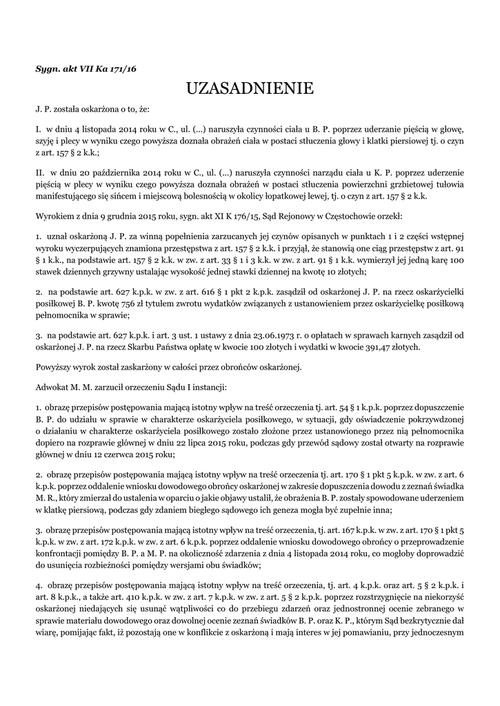 Sygn. akt VII Ka 171/16 UZASADNIENIE J. P. została oskarżona o to, że: I. w dniu 4 listopada 2014 roku w C., ul. (...) naruszyła czynności ciała u B. P. poprzez uderzanie pięścią w głowę, szyję i plecy w wyniku czego powyższa doznała obrażeń ciała w postaci stłuczenia głowy i klatki piersiowej tj. o czyn z art. 157 § 2 k.k.; II. w dniu 20 października 2014 roku w C., ul. (...) naruszyła czynności narządu ciała u K. P. poprzez uderzenie pięścią w plecy w wyniku czego powyższa doznała obrażeń w postaci stłuczenia powierzchni grzbietowej tułowia manifestującego się sińcem i miejscową bolesnością w okolicy łopatkowej lewej, tj. o czyn z art. 157 § 2 k.k. Wyrokiem z dnia 9 grudnia 2015 roku, sygn. akt XI K 176/15, Sąd Rejonowy w Częstochowie orzekł: 1. uznał oskarżoną J. P. za winną popełnienia zarzucanych jej czynów opisanych w punktach 1 i 2 części wstępnej wyroku wyczerpujących znamiona przestępstwa z art. 157 § 2 k.k. i przyjął, że stanowią one ciąg przestępstw z art. 91 § 1 k.k., na podstawie art. 157 § 2 k.k. w zw. z art. 33 § 1 i 3 k.k. w zw. z art. 91 § 1 k.k. wymierzył jej jedną karę 100 stawek dziennych grzywny ustalając wysokość jednej stawki dziennej na kwotę 10 złotych; 2. na podstawie art. 627 k.p.k. w zw. z art. 616 § 1 pkt 2 k.p.k. zasądził od oskarżonej J. P. na rzecz oskarżycielki posiłkowej B. P. kwotę 756 zł tytułem zwrotu wydatków związanych z ustanowieniem przez oskarżycielkę posiłkową pełnomocnika w sprawie; 3. na podstawie art. 627 k.p.k. i art. 3 ust. 1 ustawy z dnia 23.06.1973 r. o opłatach w sprawach karnych zasądził od oskarżonej J. P. na rzecz Skarbu Państwa opłatę w kwocie 100 złotych i wydatki w kwocie 391,47 złotych. Powyższy wyrok został zaskarżony w całości przez obrońców oskarżonej. Adwokat M. M. zarzucił orzeczeniu Sądu I instancji: 1. obrazę przepisów postępowania mającą istotny wpływ na treść orzeczenia tj. art. 54 § 1 k.p.k. poprzez dopuszczenie B. P. do udziału w sprawie w charakterze oskarżyciela posiłkowego, w sytuacji, gdy oświadczenie pokrzywdzonej o działaniu w charakterze oskarżyciela posiłkowego zostało złożone przez ustanowionego przez nią pełnomocnika dopiero na rozprawie głównej w dniu 22 lipca 2015 roku, podczas gdy przewód sądowy został otwarty na rozprawie głównej w dniu 12 czerwca 2015 roku; 2. obrazę przepisów postępowania mającą istotny wpływ na treść orzeczenia tj. art. 170 § 1 pkt 5 k.p.k. w zw. z art. 6 k.p.k. poprzez oddalenie wniosku dowodowego obrońcy oskarżonej w zakresie dopuszczenia dowodu z zeznań świadka M. R., który zmierzał do ustalenia w oparciu o jakie objawy ustalił, że obrażenia B. P. zostały spowodowane uderzeniem w klatkę piersiową, podczas gdy zdaniem biegłego sądowego ich geneza mogła być zupełnie inna; 3. obrazę przepisów postępowania mającą istotny wpływ na treść orzeczenia, tj. art. 167 k.p.k. w zw. z art. 170 § 1 pkt 5 k.p.k. w zw. z art. 172 k.p.k. w zw. z art. 6 k.p.k. poprzez oddalenie wniosku dowodowego obrońcy o przeprowadzenie konfrontacji pomiędzy B. P. a M. P. na okoliczność zdarzenia z dnia 4 listopada 2014 roku, co mogłoby doprowadzić do usunięcia rozbieżności pomiędzy wersjami obu świadków; 4. obrazę przepisów postępowania mającą istotny wpływ na treść orzeczenia, tj. art. 4 k.p.k. oraz art. 5 § 2 k.p.k. i art. 8 k.p.k., a także art. 410 k.p.k. w zw. z art. 7 k.p.k. w zw. z art. 5 § 2 k.p.k. poprzez rozstrzygnięcie na niekorzyść oskarżonej niedających się usunąć wątpliwości co do przebiegu zdarzeń oraz jednostronnej ocenie zebranego w sprawie materiału dowodowego oraz dowolnej ocenie zeznań świadków B. P. oraz K. P., którym Sąd bezkrytycznie dał wiarę, pomijając fakt, iż pozostają one w konflikcie z oskarżoną i mają interes w jej pomawianiu, przy jednoczesnym odrzuceniu dowodów, które podważały podawane przez nie wersje, w tym zeznań świadków M. P. oraz M. C. – funkcjonariusza Policji, która podkreśliła, iż gdyby było pobicie to byłaby sporządzona notatka”, a także wyjaśnień oskarżonej, pisma Laboratorium Kryminalistycznego w K. z dnia 19 stycznia 2015 roku, z którego treści wynika, iż bliżej nieokreślone obrażenia B. P. nie mogą stanowić podstawy do wydania opinii sądowo – lekarskiej, albowiem na ich podstawie nie można się wypowiedzieć co do rodzaju i charakteru odniesionych przez pokrzywdzoną obrażeń, mechanizmu ich powstania, działającego narzędzia oraz czasookresu naruszenia przez nie narządu ciała (k. 22), opinii Laboratorium Kryminalistycznego w K. z dnia 19 stycznia 2015 roku, która nie potwierdziła jednoznacznie, że obrażenia pokrzywdzonej K. P. powstały w okolicznościach przez nią opisywanych, a także opinii biegłego sądowego, który podał, iż obrażenia, których doznała pokrzywdzona B. P., mogły powstać w innych okolicznościach, również w wyniku upadku na pojemnik na liście niesiony przez sobą; 5. rażącą niewspółmierność kary wymierzonej oskarżonej w stosunku do stopnia społecznej szkodliwości czynu poprzez wymierzenie grzywny w wysokości 100 stawek dziennych z ustaloną stawką w wysokości 10 zł, podczas gdy okoliczności zdarzeń oraz postawa życiowa oskarżonej przemawiałyby za warunkowym umorzeniem postępowania. Podnosząc powyższe zarzuty skarżący wniósł o zmianę zaskarżonego orzeczenia i uniewinnienie J. P. od stawianych jej w akcie oskarżenia zarzutów, ewentualnie o warunkowe umorzenie wobec niej postępowania. Wniósł również o zasądzenie na rzecz oskarżonej kosztów obrony za postępowaniu w obu instancjach. Drugi z obrońców oskarżonej adwokat A. M. przyłączając się do zarzutów podniesionych przez adwokata M. M., zaskarżonemu wyrokowi zarzucił: I. błąd w ustaleniach faktycznych, przyjętych za podstawę skazania za popełnienie obydwu czynów opisanych w zarzut