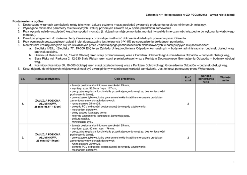 Załącznik Nr 1 do ogłoszenia nr ZO-PGO/21/2012 – Wykaz rolet i żaluzji Postanowienia ogólne: 1. Dostarczone w ramach zamówienia rolety tekstylne i żaluzje poziome muszą posiadać gwarancję producenta na okres minimum 24 miesięcy. 2. Wymagane minimalne parametry rolet tekstylnych i żaluzji poziomych zawarte są w opisie przedmiotu zamówienia. 3. Przy wycenie należy uwzględnić koszt transportu i montażu (tj. dojazd na miejsce montażu, montaż i wszelkie inne czynności niezbędne do wykonania właściwego montażu). 4. Przed przystąpieniem do złożenia oferty Zamawiający przewiduje możliwość dokonania dokładnych pomiarów przez Oferenta. 5. Przy wymiarach poszczególnych żaluzji i rolet dopuszczalna jest tolerancja (-/+) 5% po sporządzeniu dokładnych pomiarów. 6. Montaż rolet i żaluzji odbędzie się we wskazanych przez Zamawiającego pomieszczeniach zlokalizowanych w następujących miejscowościach: a. Siedliska k/Ełku (Siedliska 77, 19-300 Ełk) teren Zakładu Unieszkodliwiania Odpadów komunalnych – budynek administracyjny, budynek obsługi wag, budynek socjalny, b. Olecko (ul. Kościuszki 57, 19-400 Olecko) teren stacji przeładunkowej wraz z Punktem Dobrowolnego Gromadzenia Odpadów – budynek obsługi wag, c. Biała Piska (ul. Parkowa 2, 12-230 Biała Piska) teren stacji przeładunkowej wraz z Punktem Dobrowolnego Gromadzenia Odpadów – budynek obsługi wag, d. Kośmidry (Kośmidry 50, 19-500 Gołdap) teren stacji przeładunkowej wraz z Punktem Dobrowolnego Gromadzenia Odpadów – budynek obsługi wag. 7. Koszt dojazdu do niniejszych miejscowości musi być uwzględniony w całościowej wartości zamówienia. Jest to koszt ponoszony przez Wykonawcę. Lp. Nazwa asortymentu 1. ŻALUZJA POZIOMA ALUMINIOWA 25 mm (96,5 * 117cm) 2. ŻALUZJA POZIOMA ALUMINIOWA 25 mm (82*176cm) Opis przedmiotu - żaluzja pozioma aluminiowa o szerokości 25 mm, - wymiary: szer. 96,5 cm * wys. 117 cm, - precyzyjna regulacja ilości światła przenikającego do wnętrza, bez konieczności podnoszenia żaluzji, - prowadzenie żyłkowe, które gwarantuje lekkie i stabilne sterowanie produktem zamontowanym w oknach dachowych, - rynna stalowa 25mm/25, - pokrętło PCV o długości dostosowanej do wygody użytkowania, - mechanizm obrotowy, - dolny zaczep i zaczepy górne, - kolor do uzgodnienia i akceptacji Zamawiającego, - politura gładka, - mini fiksacja żyłki. - żaluzja pozioma aluminiowa o szerokości 25 mm, - wymiary: szer. 82 cm * wys. 176 cm, - precyzyjna regulacja ilości światła przenikającego do wnętrza, bez konieczności podnoszenia żaluzji, - prowadzenie żyłkowe, które gwarantuje lekkie i stabilne sterowanie produktem zamontowanym w oknach dachowych, - rynna stalowa 25mm/25, - pokrętło PCV o długości dostosowanej do wygody użytkowania, - mechanizm obrotowy, Ilość sztuk Wartość jednostkowa netto Wartość netto 2 2 1 3. ŻALUZJA POZIOMA ALUMINIOWA 25 mm (37*82cm) 4. ŻALUZJA POZIOMA ALUMINIOWA 25 mm (187*187cm) 5. ŻALUZJA POZIOMA ALUMINIOWA, DACHOWA 25 mm (60*90cm) - dolny zaczep i zaczepy górne, - kolor do uzgodnienia i akceptacji Zamawiającego, - politura gładka, - mini fiksacja żyłki. - żaluzja pozioma aluminiowa o szerokości 25 mm, - wymiary: szer. 37 cm * wys. 82 cm, - precyzyjna regulacja ilości światła przenikającego do wnętrza, bez konieczności podnoszenia żaluzji, - prowadzenie żyłkowe, które gwarantuje lekkie i stabilne sterowanie produktem zamontowanym w oknach dachowych, - rynna stalowa 25mm/25, - pokrętło PCV o długości dostosowanej do wygody użytkowania, - mechanizm obrotowy, - dolny zaczep i zaczepy górne, - kolor do uzgodnienia i akceptacji Zamawiającego, - politura gładka, - mini fiksacja żyłki. - żaluzja pozioma aluminiowa o szerokości 25 mm, - wymiary: szer. 187 cm * wys. 187 cm, - precyzyjna regulacja ilości światła przenikającego do wnętrza, bez konieczności podnoszenia żaluzji, - prowadzenie żyłkowe, które gwarantuje lekkie i stabilne sterowanie produktem zamontowanym w oknach dachowych, - rynna stalowa 25mm/25, - pokrętło PCV o długości dostosowanej do wygody użytkowania, - mechanizm obrotowy, - dolny zaczep i zaczepy górne, - kolor do uzgodnienia i akceptacji Zamawiającego, - politura gładka, - mini fiksacja żyłki. - żaluzja pozioma aluminiowa, dachowa o szerokości 25 mm, - wymiary: szer. 60 cm * wys. 90 cm, - precyzyjna regulacja ilości światła przenikającego do wnętrza, bez konieczności podnoszenia żaluzji, - prowadzenie żyłkowe, które gwarantuje lekkie i stabilne sterowanie produktem zamontowanym w oknach dachowych, - rynna stalowa 25mm/25, - pokrętło PCV o długości dostosowanej do wygody użytkowania, - mechanizm obrotowy, - dolny zaczep i zaczepy górne, - kolor do uzgodnienia i akceptacji Zamawiającego, - politura gładka, - mini fiksacja żyłki. 2 1 18 2 6. ŻALUZJA POZIOMA ALUMINIOWA 25 mm (98*176cm) 7. ROLETA TEKSTYLNA JEDNOBARWNA (44*140 cm) 8. ROLETA TEKSTYLNA JEDNOBARWNA (98*200cm) - żaluzja pozioma aluminiowa o szerokości 25 mm, - wymiary: szer. 98 cm * wys. 176 cm, - precyzyjna regulacja ilości światła przenikającego do wnętrza, bez konieczności podnoszenia żaluzji, - prowadzenie żyłkowe, które gwarantuje lekkie i stabilne sterowanie produktem zamontowanym w oknach dachowych, - rynna stalowa 25mm/25, - pokrętło PCV o długości dostosowanej do wygody użytkowania, - mechanizm obrotowy, - dolny zaczep i zaczepy górne, - kolor do uzgodnienia i akceptacji Zamawiającego, - politura gładka, - mini fiksacja żyłki. - roleta tekstylna jednobarwna w rozmiarze: szer. 44 cm * wys. 140 cm, - skład: 100% PES, - gramatura: 170g/m, - KW: grubość 0,40 mm, - UV: test> 6, - rura aluminiowa 19, - belka stalowa obciążeniowa, - zaślepka belki, - łańcuszek napędowy o długości dostosowanej do wygody użytkowania, - łącznik łańcuszka, - obciążnik łańcuszka, - taśma stalowa samoprzylepna, - sworzeń zaślepki, - wieszak sprę