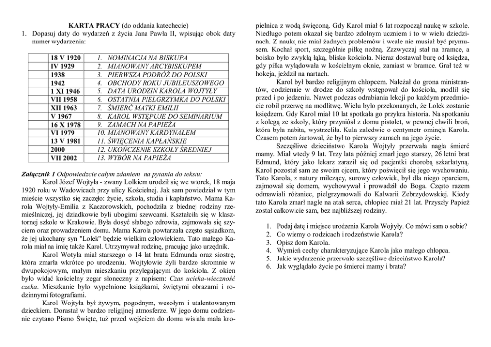 KARTA PRACY (do oddania katechecie) 1. Dopasuj daty do wydarzeń z życia Jana Pawła II, wpisując obok daty numer wydarzenia: 18 V 1920 IV 1929 1938 1942 1 XI 1946 VII 1958 XII 1963 V 1967 16 X 1978 VI 1979 13 V 1981 2000 VII 2002 1. NOMINACJA NA BISKUPA 2. MIANOWANY ARCYBISKUPEM 3. PIERWSZA PODRÓŻ DO POLSKI 4. OBCHODY ROKU JUBILEUSZOWEGO 5. DATA URODZIN KAROLA WOJTYŁY 6. OSTATNIA PIELGRZYMKA DO POLSKI 7. ŚMIERĆ MATKI EMILII 8. KAROL WSTĘPUJE DO SEMINARIUM 9. ZAMACH NA PAPIEŻA 10. MIANOWANY KARDYNAŁEM 11. ŚWIĘCENIA KAPŁAŃSKIE 12. UKOŃCZENIE SZKOŁY ŚREDNIEJ 13. WYBÓR NA PAPIEŻA Załącznik 1 Odpowiedzcie całym zdaniem na pytania do tekstu: Karol Józef Wojtyła - zwany Lolkiem urodził się we wtorek, 18 maja 1920 roku w Wadowicach przy ulicy Kościelnej. Jak sam powiedział w tym mieście wszystko się zaczęło: życie, szkoła, studia i kapłaństwo. Mama Karola Wojtyły-Emilia z Kaczorowskich, pochodziła z biednej rodziny rzemieślniczej, jej dziadkowie byli ubogimi szewcami. Kształciła się w klasztornej szkole w Krakowie. Była dosyć słabego zdrowia, zajmowała się szyciem oraz prowadzeniem domu. Mama Karola powtarzała często sąsiadkom, że jej ukochany syn "Lolek" będzie wielkim człowiekiem. Tato małego Karola miał na imię także Karol. Utrzymywał rodzinę, pracując jako urzędnik. Karol Wotyła miał starszego o 14 lat brata Edmunda oraz siostrę, która zmarła wkrótce po urodzeniu. Wojtyłowie żyli bardzo skromnie w dwupokojowym, małym mieszkaniu przylegającym do kościoła. Z okien było widać kościelny zegar słoneczny z napisem: Czas ucieka-wieczność czeka. Mieszkanie było wypełnione książkami, świętymi obrazami i rodzinnymi fotografiami. Karol Wojtyła był żywym, pogodnym, wesołym i utalentowanym dzieckiem. Dorastał w bardzo religijnej atmosferze. W jego domu codziennie czytano Pismo Święte, tuż przed wejściem do domu wisiała mała kro- pielnica z wodą święconą. Gdy Karol miał 6 lat rozpoczął naukę w szkole. Niedługo potem okazał się bardzo zdolnym uczniem i to w wielu dziedzinach. Z nauką nie miał żadnych problemów i wcale nie musiał być prymusem. Kochał sport, szczególnie piłkę nożną. Zazwyczaj stał na bramce, a boisko było zwykłą łąką, blisko kościoła. Nieraz dostawał burę od księdza, gdy piłka wylądowała w kościelnym oknie, zamiast w bramce. Grał też w hokeja, jeździł na nartach. Karol był bardzo religijnym chłopcem. Należał do grona ministrantów, codziennie w drodze do szkoły wstępował do kościoła, modlił się przed i po jedzeniu. Nawet podczas odrabiania lekcji po każdym przedmiocie robił przerwę na modlitwę. Wielu było przekonanych, że Lolek zostanie księdzem. Gdy Karol miał 10 lat spotkała go przykra historia. Na spotkaniu z kolegą ze szkoły, który przyniósł z domu pistolet, w pewnej chwili broń, która była nabita, wystrzeliła. Kula zaledwie o centymetr ominęła Karola. Czasem potem żartował, że był to pierwszy zamach na jego życie. Szczęśliwe dzieciństwo Karola Wojtyły przerwała nagła śmierć mamy. Miał wtedy 9 lat. Trzy lata później zmarł jego starszy, 26 letni brat Edmund, który jako lekarz zaraził się od pacjentki chorobą szkarlatyną. Karol pozostał sam ze swoim ojcem, który poświęcił się jego wychowaniu. Tato Karola, z natury milczący, surowy człowiek, był dla niego oparciem, zajmował się domem, wychowywał i prowadził do Boga. Często razem odmawiali różaniec, pielgrzymowali do Kalwarii Zebrzydowskiej. Kiedy tato Karola zmarł nagle na atak serca, chłopiec miał 21 lat. Przyszły Papież został całkowicie sam, bez najbliższej rodziny. 1. 2. 3. 4. 5. 6. Podaj datę i miejsce urodzenia Karola Wojtyły. Co mówi sam o sobie? Co wiemy o rodzicach i rodzeństwie Karola? Opisz dom Karola. Wymień cechy charakteryzujące Karola jako małego chłopca. Jakie wydarzenie przerwało szczęśliwe dzieciństwo Karola? Jak wyglądało życie po śmierci mamy i brata? KARTA PRACY (do oddania katechecie). 1. Dopasuj daty do wydarzeń z życia Jana Pawła II, wpisując obok daty numer wydarzenia: 18 V 1920 IV 1929 1938 1942 1 XI 1946 VII 1958 XII 1963 V 1967 16 X 1978 VI 1979 13 V 1981 2000 VII 2002 1. NOMINACJA NA BISKUPA 2. MIANOWANY ARCYBISKUPEM 3. PIERWSZA PODRÓŻ DO POLSKI 4. OBCHODY ROKU JUBILEUSZOWEGO 5. DATA URODZIN KAROLA WOJTYŁY 6. OSTATNIA PIELGRZYMKA DO POLSKI 7. ŚMIERĆ MATKI EMILII 8. KAROL WSTĘPUJE DO SEMINARIUM 9. ZAMACH NA PAPIEŻA 10. MIANOWANY KARDYNAŁEM 11. ŚWIĘCENIA KAPŁAŃSKIE 12. UKOŃCZENIE SZKOŁY ŚREDNIEJ 13. WYBÓR NA PAPIEŻA Załącznik 2 Odpowiedzcie całym zdaniem na pytania do tekstu: Karol Wojtyła był zdolnym uczniem. Koledzy mówili często: Cenzurki Lolka były nudne, same piątki... Poznawał już w gimnazjum język grecki, łaciński, niemiecki, interesował się teatrem. Często grał role w kółku teatralnym. Wystawiano przede wszystkim lektury szkolne tj.: Antygona, Kordian. Karol grał w spektaklach główne role, nawet wcielał się w dwie postacie naraz, np.: w Balladynie grał Kostryna i Kirkora. Po zdaniu matury wybrał studia polonistyczne. Myśl o powołaniu kapłańskim była skryta gdzieś w głębi jego serca. Latem 1938 roku, Karol Wojtyła razem ze swoim ojcem przeprowadzili się z Wadowic do Krakowa i zamieszkali w suterenie przy ulicy Tynieckiej. Karol zaczął uczęszczać na studia, zaprzyjaźnił się z grupą studentów. Pewnego dnia ktoś z jego grupy przyczepił na drzwiach kartkę z napisem: Karol Wojtyła - początkujący święty. Czy nie były to prorocze słowa? Nadejście II wojny światowej zmieniło życie Karola. Nagła śmierć ojca, przerwane studia polonistyczne, praca w ciężkich kamieniołomach, gdzie rozłupywał i ładował na wagony bloki wapienne, to wszystko miało wpływ na jego decyzje i na życie. Wstąpił do Seminarium Duchownego w Krakowie, gdzie zgłębiał Bożą naukę, aby zostać dobrym kapłanem. 1 li- stopad