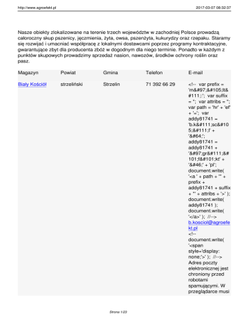 5;ol' + '@'; addy81741 = addy81741 + 'agro&# 101;fekt' + '.' + 'pl'; document.write( '<a ' + path + ''' + prefix + addy81741 + suffix + ''' + attribs + '>' ); document.write( addy81741 ); document.write( '</a>' ); //--> b.kosciol@agroefe kt.pl <!-document.write( '<span style='display: none;'>' ); //--> Adres poczty elektronicznej jest chroniony przed robotami spamującymi. W przeglądarce musi Strona 1/23 http://www.agroefekt.pl 2017-03-07 08:32:37 być włączona obsługa JavaScript, żeby go zobaczyć. <!-document.write( '</' ); document.write( 'span>' ); //--> Bolechów oławski Oława Strona 2/23 71 301 66 58 <!-- var prefix = 'mailt& #111;:'; var suffix = ''; var attribs = ''; var path = 'hr' + 'ef' + '='; var addy21609 = 'bolech ow' + '@'; addy21609 = addy21609 + 'agro&# 101;fekt' + '.' + 'pl'; document.write( '<a ' + path + ''' + prefix + addy21609 + suffix + ''' + attribs + '>' ); document.write( addy21609 ); document.write( '</a>' ); //--> bolechow@agroef ekt.pl <!-document.write( '<span style='display: none;'>' ); //--> Adres poczty elektronicznej jest chroniony przed robotami spamującymi. W http://www.agroefekt.pl 2017-03-07 08:32:37 przeglądarce musi być włączona obsługa JavaScript, żeby go zobaczyć. <!-document.write( '</' ); document.write( 'span>' ); //--> Częstocice strzeliński Wiązów Strona 3/23 71 394 21 09 <!-- var prefix = 'mailt& #111;:'; var suffix = ''; var attribs = ''; var path = 'hr' + 'ef' + '='; var addy57306 = 'czesto cice' + '@'; addy57306 = addy57306 + 'agro&# 101;fekt' + '.' + 'pl'; document.write( '<a ' + path + ''' + prefix + addy57306 + suffix + ''' + attribs + '>' ); document.write( addy57306 ); document.write( '</a>' ); //--> czestocice@agroe fekt.pl <!-document.write( '<span style='display: none;'>' ); //--> Adres poczty elektronicznej jest chroniony przed robotami http://www.agroefekt.pl 2017-03-07 08:32:37 spamującymi. W przeglądarce musi być włączona obsługa JavaScript, żeby go zobaczyć. <!-document.write( '</' ); document.write( 'span>' ); //--> Głubczyce głubczycki Głubczyce Strona 4/23 77 485 66 87 <!-- var prefix = 'mailt& #111;:'; var suffix = ''; var attribs = ''; var path = 'hr' + 'ef' + '='; var addy66414 = 'glubczyc&# 101;' + '@'; addy66414 = addy66414 + 'agro&# 101;fekt' + '.' + 'pl'; document.write( '<a ' + path + ''' + prefix + addy66414 + suffix + ''' + attribs + '>' ); document.write( addy66414 ); document.write( '</a>' ); //--> glubczyce@agroef ekt.pl <!-document.write( '<span style='display: none;'>' ); //--> Adres poczty elektronicznej jest chroniony przed robotami http://www.agroefekt.pl 2017-03-07 08:32:37 spamującymi. W przeglądarce musi być włączona obsługa JavaScript, żeby go zobaczyć. <!-document.write( '</' ); document.write( 'span>' ); //--> Jaźwina dzierżoniowski Łagiewniki Strona 5/23 74 893 81 62 <!-- var prefix = 'mailt& #111;:'; var suffix = ''; var attribs = ''; var path = 'hr' + 'ef' + '='; var addy63671 = 'jazwin a' + '@'; addy63671 = addy63671 + 'agro&# 101;fekt' + '.' + 'pl'; document.write( '<a ' + path + ''' + prefix + addy63671 + suffix + ''' + attribs + '>' ); document.write( addy63671 ); document.write( '</a>' ); //--> jazwina@agroefek t.pl <!-document.write( '<span style='display: none;'>' ); //--> Adres poczty elektronicznej jest chroniony przed robotami spamującymi. W http://www.agroefekt.pl 2017-03-07 08:32:37 przeglądarce musi być włączona obsługa JavaScript, żeby go zobaczyć. <!-document.write( '</' ); document.write( 'span>' ); //--> Łowkowice kluczborski Kluczbork Strona 6/23 77 413 15 66 <!-- var prefix = 'mailt& #111;:'; var suffix = ''; var attribs = ''; var path = 'hr' + 'ef' + '='; var addy1049 = 'lowko wice' + '@'; addy1049 = addy1049 + 'agro&# 101;fekt' + '.' + 'pl'; document.write( '<a ' + path + ''' + prefix + addy1049 + suffix + ''' + attribs + '>' ); document.write( addy1049 ); document.write( '</a>' ); //--> lowkowice@agroef ekt.pl <!-document.write( '<span style='display: none;'>' ); //--> Adres poczty elektronicznej jest chroniony przed robotami http://www.agroefekt.pl 2017-03-07 08:32:37 spamującymi. W przeglądarce musi być włączona obsługa JavaScript, żeby go zobaczyć. <!-document.write( '</' ); document.write( 'span>' ); //--> Karłowice Wielkie nyski Kamiennik Strona 7/23 77 431 21 38 <!-- var prefix = 'mailt& #111;:'; var suffix = ''; var attribs = ''; var path = 'hr' + 'ef' + '='; var addy39051 = 'karlow& #105;ce' + '@'; addy39051 = addy39051 + 'agro&# 101;fekt' + '.' + 'pl'; document.write( '<a ' + path + ''' + prefix + addy39051 + suffix + ''' + attribs + '>' ); document.write( addy39051 ); document.write( '</a>' ); //--> karlowice@agroef ekt.pl <!-document.write( '<span style='display: none;'>' ); //--> Adres poczty elektronicznej jest chroniony przed http://www.agroefekt.pl 2017-03-07 08:32:37 robotami spamującymi. W przeglądarce musi być włączona obsługa JavaScript, żeby go zobaczyć. <!-document.write( '</' ); document.write( 'span>' ); //--> Krzyżowniki kępiński Rychtal Strona 8/23 62 781 69 69 <!-- var prefix = 'mailt& #111;:'; var suffix = ''; var attribs = ''; var path = 'hr' + 'ef' + '='; var addy40649 = 'krzyzown&# 105;ki' + '@'; addy40649 = addy40649 + 'agro&# 101;fekt' + '.' + 'pl'; document.write( '<a ' + path + ''' + prefix + addy40649 + suffix + ''' + attribs + '>' ); document.write( addy40649 ); document.write( '</a>' ); //--> krzyzowniki@agro efekt.pl <!-document.write( '<span style='display: none;'>' ); //--> Adres poczty elektronicznej jest http://www.agroefekt.pl 2017-03-07 08:32:37 chroniony przed robotami spamującymi. W przeglądarce musi być włączona obsługa JavaScript, żeby go zobaczyć. <!-document.write( '</' ); document.write( 'span>' ); //--> Mnichowice kępiński Bralin Strona 9/23 62 781 11 78 <!-- var prefix = 'mailt& #111;:'; var suffix = ''; var attribs = ''; var path = 'hr' + 'ef' + '='; var addy91883 = 'mnich 1;wice ' + '@'; addy91883 = addy91883 + 'agro&# 101;fekt' + '.' + 'pl'