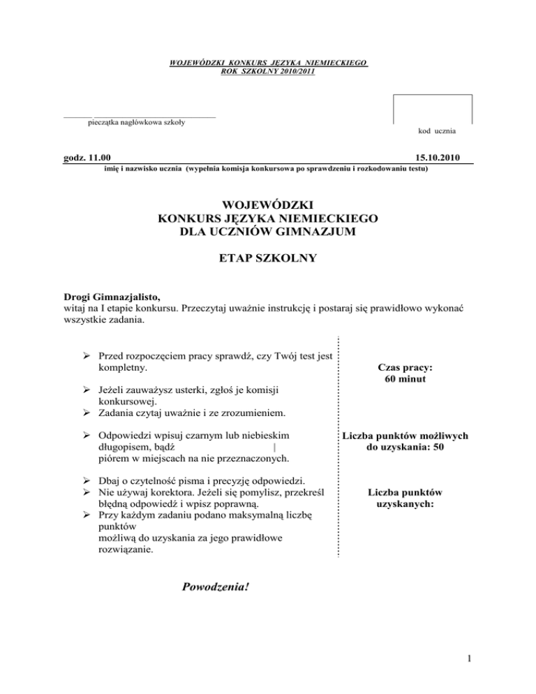 WOJEWÓDZKI KONKURS JĘZYKA NIEMIECKIEGO DLA UCZNIÓW