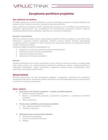 Zarządzanie portfelem projektów Opis szkolenia/ cel szkolenia W każdej organizacji w której zrealizowane są liczne, równolegle prowadzone projekty potrzebna jest wiedza na temat metod oraz procesu zarządzania portfelem projektów. Celem szkolenia jest pokazanie metod projektowania procesów oceny, kwalifikacji oraz priorytetyzacji projektów organizacyjnych. Kurs przygotowuje do konstruowania stosownych procedur wsparcia, standardów dokumentacji projektowej, raportów oraz zestawień portfelowych. Korzyści z uczestnictwa Warsztat przekazuje wiedzę z zakresu optymalizacji zarządzania wieloma projektami w warunkach silnej konkurencji i rywalizacji o zasoby projektowe. Szkolenie zawiera również elementy operacyjnego zarządzania wieloma projektami w takich obszarach jak zapewnienie jakości oraz budowanie kapitału wiedzy i rozwój pracowników. Uczestnicy nabędę umiejętności pozwalających na:     podniesienie rentowności portfela projektów organizacyjnych, zwiększenie poziomu utylizacji pracowników, poprawienie jakości planowania zwiększenie terminowości projektów. Metoda Szkolenie prowadzone jest w formie warsztatów w czasie, których uczestnicy pracując w zespołach będą mieli okazję zmierzyć się z najistotniejszymi problemami spotykanymi podczas realizacji projektów w środowisku portfelowym. Zajęcia warsztatowe uzupełnione zostaną sesjami wykładowymi, które podsumują i uporządkują wyniki ćwiczeń. Adresaci szkolenia Warsztat przeznaczony jest dla menedżerów projektów i programów, dyrektorów biur projektów, dyrektorów finansowych, dyrektorów działów informatyki oraz osób odpowiedzialnych za koordynację i uruchamianie inicjatyw projektowych. Zakres szkolenia: 1. Dwa światy, dwie filozofie zarządzania – projekty a portfele projektów  Definicja portfela projektów  Różnice i podobieństwa pomiędzy zarządzaniem projektami a zarządzaniem portfelem projektów  Główni udziałowcy 2. Proces oceny, kwalifikacji, priorytetyzacji projektów  Role i odpowiedzialności organizacyjne  Procedury i standardy 3. Wielowymiarowa ocena wartości projektów  Priorytetyzacja projektów  Znaczenie wizualizacji informacji  Raporty 4. Zarządzanie portfelem zasobów organizacyjnych  Zasoby ludzkie, finansowe i sprzętowe  Ludzie w środowisku wieloprojektowym 5. Śledzenie postępu prac projektowych w portfelu  Rozliczanie korzyści biznesowych  Jakość informacji 6. Metody zwiększenia rentowności portfela  Analiza scenariuszy portfelowych  Krzywa efektywności i jej wykorzystanie  Inne innowacyjne metody analizy biznesowej portfela projektów 7. Biura Projektów, Rady portfela i inne jednostki organizacyjne  Czy Biuro projektów i Rada portfela są tym samym?  Rola jednostki organizacyjnej wspierającej i realizującej zarządzanie portfelem projektów. 8. Strategie wdrożenia podejścia portfelowego  Analiza poziomu dojrzałości projektowo – portfelowej. Marketingowy mit, czy ważny element strategii rozwoju?  Jak zbudować efektywną organizację portfelową?  Jak wybrać i wdrożyć narzędzie PPM? Kluczowe narzędzia na rynku.  Wdrożenie PPM jako zmiana kulturowa. Czas trwania 2 dni, ilość uczestników - 6 – 12 osób