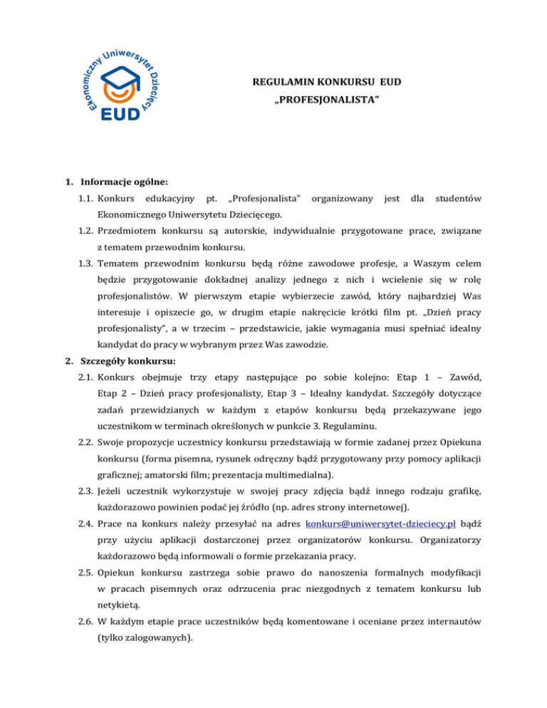 REGULAMIN KONKURSU EUD „PROFESJONALISTA” 1. Informacje ogólne: 1.1. Konkurs edukacyjny pt. „Profesjonalista” organizowany jest dla studentów Ekonomicznego Uniwersytetu Dziecięcego. 1.2. Przedmiotem konkursu są autorskie, indywidualnie przygotowane prace, związane z tematem przewodnim konkursu. 1.3. Tematem przewodnim konkursu będą różne zawodowe profesje, a Waszym celem będzie przygotowanie dokładnej analizy jednego z nich i wcielenie się w rolę profesjonalistów. W pierwszym etapie wybierzecie zawód, który najbardziej Was interesuje i opiszecie go, w drugim etapie nakręcicie krótki film pt. „Dzień pracy profesjonalisty”, a w trzecim – przedstawicie, jakie wymagania musi spełniać idealny kandydat do pracy w wybranym przez Was zawodzie. 2. Szczegóły konkursu: 2.1. Konkurs obejmuje trzy etapy następujące po sobie kolejno: Etap 1 – Zawód, Etap 2 – Dzień pracy profesjonalisty, Etap 3 – Idealny kandydat. Szczegóły dotyczące zadań przewidzianych w każdym z etapów konkursu będą przekazywane jego uczestnikom w terminach określonych w punkcie 3. Regulaminu. 2.2. Swoje propozycje uczestnicy konkursu przedstawiają w formie zadanej przez Opiekuna konkursu (forma pisemna, rysunek odręczny bądź przygotowany przy pomocy aplikacji graficznej; amatorski film; prezentacja multimedialna). 2.3. Jeżeli uczestnik wykorzystuje w swojej pracy zdjęcia bądź innego rodzaju grafikę, każdorazowo powinien podać jej źródło (np. adres strony internetowej). 2.4. Prace na konkurs należy przesyłać na adres [email protected] bądź przy użyciu aplikacji dostarczonej przez organizatorów konkursu. Organizatorzy każdorazowo będą informowali o formie przekazania pracy. 2.5. Opiekun konkursu zastrzega sobie prawo do nanoszenia formalnych modyfikacji w pracach pisemnych oraz odrzucenia prac niezgodnych z tematem konkursu lub netykietą. 2.6. W każdym etapie prace uczestników będą komentowane i oceniane przez internautów (tylko zalogowanych). 2.7. Zadaniem uczestników konkursu będzie dyskusja z internautami i odpowiedzi na zamieszczane komentarze – przekonanie internautów do oddania głosu właśnie na swoją propozycję. 3. Przebieg konkursu i ważne terminy: 3.1. Termin nadsyłania zgłoszeń konkursowych: do 31 maja 2013 r. (włącznie) 3.2. Czas rozgrywania konkursu: od 31 maja do 3 lipca 2013 r. 3.3. Konkurs obejmuje 3 etapy, na które składają się kolejno: ogłoszenie zadania przez Opiekuna konkursu (1), przesyłanie prac konkursowych (2), publikacja wszystkich nadesłanych prac konkursowych, dyskusja i głosowanie internautów (3). Szczegółowy harmonogram konkursu przedstawia tabela: Przekazanie zadania przez Opiekuna konkursu (1) Przesyłanie prac konkursowych (2) Etap 1. 31 maja (do godz. 20.00) do 6 czerwca (godz. 20.00) Etap 2. 7 czerwca (do godz. 20.00) do 13 czerwca (godz. 20.00) Etap 3. 14 czerwca (do godz. 20.00) do 20 czerwca (godz. 20.00) Prezentacja prac konkursowych, dyskusja i głosowanie internautów (3) 10 czerwca (godz. 15:00) – 16 czerwca (godz. 23:59) 17 czerwca (godz. 15.00) – 23 czerwca (godz. 23.59) 24 czerwca (godz. 15.00) – 30 czerwca (godz. 23.59) 3.4. Ocena prac przez Komisję konkursową: 1-2 lipca 2013 r. 3.5. Ogłoszenie na stronie internetowej EUD werdyktu Komisji: 3 lipca 2013 r., godz. 15.00. 4. Ocena prac konkursowych: 4.1. W terminach określonych w punkcie 3.3. Regulaminu każdy internauta ma prawo do opiniowania i komentowania przedstawionych przez uczestników propozycji (po uprzednim zalogowaniu) oraz do głosowania na najlepsze z nich. 4.2. Każdy zalogowany internauta może oddać jeden głos dziennie na każdą z prac konkursowych, przyznając im 3, 2 bądź 1 punkt. 4.3. System głosowania na prace konkursowe zawiera blokadę adresów IP. Niedogodnością z tytułu wprowadzonej blokady będzie ograniczona możliwość oddawania głosów z jednego komputera. 4.4. Oceny końcowej prac konkursowych dokona Komisja konkursowa, uwzględniając: zgodność prac z tematem przewodnim konkursu, oryginalność i pomysłowość wykonania prac, dyskusję uczestników konkursu z internautami (odpowiedzi na pytania i komentarze), sama liczba głosów przyznana przez internautów nie będzie miała bezpośredniego wpływu na werdykt Komisji (punkty zebrane w głosowaniu internetowym będą zaś rozstrzygały sytuacje sporne). 4.5. Zwycięzcy konkursu zostaną też nagrodzeni bonami prezentowymi do wykorzystania w salonach Empik o wartości: Nagroda główna (za I miejsce): bon o wartości 500 zł Nagroda za II miejsce: bon o wartości 300 zł Nagroda za III miejsce: bon o wartości 200 zł 4.6. Sytuacje sporne i niejednoznaczne rozstrzygać będzie Komisja konkursowa. 5. Zasady zgłaszania uczestnictwa w konkursie: 5.1. Aby móc wziąć udział w konkursie należy posiadać konto użytkownika portalu EUD. Strona internetowa będzie bowiem główną platformą komunikacyjną między organizatorami a uczestnikami konkursu. Poprzez stronę EUD organizatorzy będą przekazywali szczegóły dotyczące zadania konkursowego. Również za jej pośrednictwem uczestnicy będą też przesyłali swoje prace na konkurs. 5.2. Studenci EUD nieposiadający konta, powinni: • dokonać rejestracji na stronie: www.uniwersytet-dzieciecy.pl/profil/rejestracja/. wypełnić formularz danych użytkownika, który dostępny jest po zalogowaniu w zakładce „Edytuj dane” oraz dodać swoje zdjęcie bądź wykreować własnego awatara za pomocą dostępnej na stronie aplikacji, 5.3. Po dokonanej rejestracji na stronie EUD i uzupełnieniu swoich danych, można przystąpić do prac nad pierwszym zadaniem konkursowym. 5.4. Każdorazowo po prawidłowym przesłaniu pracy konkursowej, na adres mailowy uczestnika konkursu (użytkownika portalu EUD) wysłany zostanie mail potwierdzający odbiór pracy. 5.5. Przesłanie zgłoszenia na konkurs jest równoznaczne z zobowiązaniem się kandydata do samodzielnego wykonania prac konkursowyc