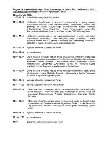 Program IX Polsko-Niemieckiego Forum Prawniczego w dniach 21-22 października 2011 r. w Zielonej Górze: (zastrzega się możliwość wprowadzenia zmian) 22 października 2011 r. 9.30 -10.15 otwarcie Forum - wystąpienia powitalne 10.15 - 10.45 „Nabywanie nieruchomości, w tym przez cudzoziemców, w prawie polskim, uregulowania polskiego prawa międzynarodowego prywatnego” - referat radcy prawnego dr Marcina Krzymuskiego, współpracownika Katedry Polskiego i Europejskiego Prawa Prywatnego i Prawa Porównawczego Uniwersytetu Europejskiego Viadrina we Frankfurcie n/Odrą, członka OIRP w Zielonej Górze 10.45 - 11.15 „Nabywanie nieruchomości, w tym przez cudzoziemców, w prawie niemieckim, uregulowania niemieckiego prawa międzynarodowego prywatnego” - referat adwokata Martina Pfnür – członka Saksońskiej Izby Adwokackiej, adwokata – specjalisty w zakresie prawa transportowego i spedycyjnego 11.15 - 11.30 dyskusja referentów z uczestnikami Forum 11.30 - 12.00 przerwa kawowa 12.00 - 12.30 „Wpis do księgi wieczystej nabycia prawa własności lub użytkowania wieczystego nieruchomości według prawa polskiego” - referat prof. dr Arkadiusza Wudarskiego – Kierownika Katedry Polskiego i Europejskiego Prawa Prywatnego i Prawa Porównawczego Uniwersytetu Europejskiego Viadrina we Frankfurcie n/Odrą, adwokata, członka Okręgowej Izby Adwokackiej w Częstochowie 12.30 - 13.00 „Wpis do księgi wieczystej nabycia prawa własności nieruchomości według prawa niemieckiego” - referat Michaela Schrandt - referendarza w Sądzie Rejonowym w Dreźnie w Wydziale Ksiąg Wieczystych 13.00 - 13.15 dyskusja referentów z uczestnikami Forum 13.15 – 15.00 obiad dla uczestników Forum w Hotelu Ruben 15.00 - 15.30 „Wniesienie nieruchomości jako wkładu rzeczowego do spółki kapitałowej według prawa polskiego” - referat Sędziego Sądu Rejonowego w Zielonej Górze Lidii Iwanowskiej Przewodniczącej Wydziału Gospodarczego Krajowego Rejestru Sądowego 15.30 - 16.00 „Wniesienie nieruchomości jako wkładu rzeczowego do spółki kapitałowej według prawa niemieckiego” - referat adwokata Jörga-Dietera Battke - członka Saksońskiej Izby Adwokackiej, adwokata- specjalisty w zakresie prawa handlowego i prawa spółek. 16.00 - 16.15 dyskusja referentów z uczestnikami Forum 16.15 – 17.00 przerwa kawowa 17.00 pożegnanie uczestników i zamknięcie Forum