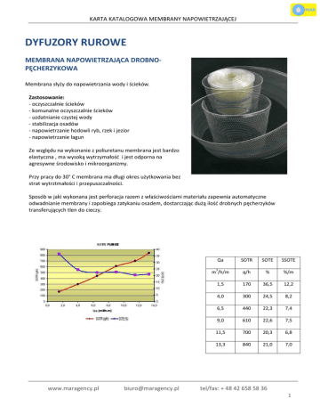 KARTA KATALOGOWA MEMBRANY NAPOWIETRZAJĄCEJ DYFUZORY RUROWE MEMBRANA NAPOWIETRZAJĄCA DROBNOPĘCHERZYKOWA Membrana słyży do napowietrzania wody i ścieków. Zastosowanie: - oczyszczalnie ścieków - komunalne oczyszczalnie ścieków - uzdatnianie czystej wody - stabilizacja osadów - napowietrzanie hodowli ryb, rzek i jezior - napowietrzanie lagun Ze względu na wykonanie z poliuretanu membrana jest bardzo elastyczna , ma wysoką wytrzymałość i jest odporna na agresywne środowisko i mikroorganizmy. Przy pracy do 30° C membrana ma długi okres użytkowania bez strat wytrztmałości i przepuszczalności. Sposób w jaki wykonana jest perforacja razem z właściwościami materiału zapewnia automatyczne odwadnianie membrany i zapobiega zatykaniu osadem, dostarczając dużą ilość drobnych pęcherzyków transferujących tlen do cieczy. Qa www.maragency.pl [email protected] SOTR SOTE SSOTE m /h/m 3 q/h % %/m 1,5 170 36,5 12,2 4,0 300 24,5 8,2 6,5 440 22,3 7,4 9,0 610 22,6 7,5 11,5 700 20,3 6,8 13,3 840 21,0 7,0 tel/fax: + 48 42 658 58 36 1 KARTA KATALOGOWA MEMBRANY NAPOWIETRZAJĄCEJ AERATOR RUROWY OTWARTY. W aeratorze rurowym otwartym wykorzystujemy membranę PUM68 o parametrach przedstawionych powyżej. Istotnym elementem aeratora otwartego jest jego wyprofilowanie, które pozwala na wpłynięcie wody do środka rury nośnej. To znacznie zmniejsza wypór aeratora i nie jest konieczne stosowanie mocowania do podłoża. Aeratory te mają jednak ograniczoną długość i stosuje się je maksymalnie do 800 mm. Długość jednego elementu napowietrzającego wynosi do 800 mm. d - długość elementu i - gwint wewnętrzny Z - wypełniony - chodzi o rodzaj elementu z dopływem powietrza do przestrzeni między nośną rurą a membraną, wewnętrzna przestrzeń rury nośnej jest wypełniona wodą www.maragency.pl [email protected] tel/fax: + 48 42 658 58 36 2 KARTA KATALOGOWA MEMBRANY NAPOWIETRZAJĄCEJ AERATOR RUROWY ZAMKNIĘTY W aeratorze rurowym zamknietym używamy membranę PUM 68 o parametrach opisanych powyżej. Jest to tradycyjne rozwiązanie z zamkniętą przestrzenią rury nośnej. Tego typu membrany wymagają przytwierdzenia do podłoża. Długość jednego elementu napowietrzającego wynosi do 4 000 mm. d - długość elementu e - gwint zewnętrzny N - niewypełniony - chodzi o rodzaj elementu z dopływem powietrza do nośnej rury a dalej pod membranę poprzez odpowiednio wycięte otwory, nośna rura jest wypełniona powietrzem Elementy napowietrzające Membrana napowietrzająca ** Aerator rurowy otwarty Aerator rurowy otwarty Aerator rurowy zamknięty Aerator rurowy zamknięty Aerator rurowy zamknięty Aerator rurowy zamknięty Aerator rurowy zamknięty mm --500 800 500 1000 2000 3000 4000 ilość mb szt szt szt szt szt szt szt Cena* 103 166 203 166 218 391 511 653 *Do podanych cen należy doliczyć 23% VAT . Ceny nie zawierają transportu. **W jednej rolce jest 50 m membrany napowietrzającej. www.maragency.pl [email protected] tel/fax: + 48 42 658 58 36 3