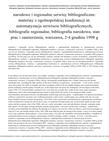 narodowe i regionalne serwisy bibliograficzne: materiay z ogolnopolskiej konferencji nt. automatyzacja serwisow bibliograficznych, bibliografie regionalne, bibliografia narodowa, stan prac i zamierzenia, warszawa, 2-4 grudnia 1998 g PDF book - read or download narodowe i regionalne serwisy bibliograficzne: materiay z ogolnopolskiej konferencji nt. automatyzacja serwisow bibliograficznych, bibliografie regionalne, bibliografia narodowa, stan prac i zamierzenia, warszawa, 2-4 grudnia 1998 g narodowe i regionalne serwisy bibliograficzne: materiay z ogolnopolskiej konferencji nt. automatyzacja serwisow bibliograficznych, bibliografie regionalne, bibliografia narodowa, stan prac i zamierzenia, warszawa, 2-4 grudnia 1998 g. Now you can see narodowe i regionalne serwisy bibliograficzne: materiay z ogolnopolskiej konferencji nt. automatyzacja serwisow bibliograficznych, bibliografie regionalne, bibliografia narodowa, stan prac i zamierzenia, warszawa, 2-4 grudnia 1998 g page on our library. On this page you can get information, citations, manuals and alternative version of narodowe i regionalne serwisy bibliograficzne: materiay z ogolnopolskiej konferencji nt. automatyzacja serwisow bibliograficznych, bibliografie regionalne, bibliografia narodowa, stan prac i zamierzenia, warszawa, 2-4 grudnia 1998 g. Also you can download narodowe i regionalne serwisy bibliograficzne: materiay z ogolnopolskiej konferencji nt. automatyzacja serwisow bibliograficznych, bibliografie regionalne, bibliografia narodowa, stan prac i zamierzenia, warszawa, 2-4 grudnia 1998 g in PDF, DOC or TXT formats using next direct link. In our library you can find mane books, for example : narodowe i regionalne serwisy bibliograficzne: materiay z ogolnopolskiej konferencji nt. automatyzacja serwisow bibliograficznych, bibliografie regionalne, bibliografia narodowa, stan prac i zamierzenia, warszawa, 2-4 grudnia 1998 g, istoriia i istoriografiia zarubezhnogo mira v litsakh: mezhvuzovski sbornik nauchnykh state, serenading the light: painters of the desert southwest, joseph beuys - eurasienstab, + 1 dvd, circles: science, sense and symbol, the coffin of zemathor and other rectangular coffins of the late middle kingdom and second intermediate period, technology and the quality of health care, in den augen lesen: die praxis der irisdiagnose, the last plague in the baltic region 1709-1713, fresh & healthy cooking for two: easy meals for everyday life, verdict on the crash: causes and policy implications, bareri oskin: banasteghtsutiwnner, knaurs weltgeschichte der musik, be an outrageous older woman, microsimulation and tourism forecasts, die philosophie und die frage nach dem gluck: = la philosophie et la question du bonheur, celebryci z tamtych lat: prywatne zycie wielkich gwiazd prl-u, dark victory: ronald reagan, mca, and the mob, the war come home: disabled veterans in britain and germany, 1914-1939, crime of genocide in international law: appraising the contribution of the un tribunal for rwanda, du cote de chez swann: a la recherche du temps perdu, mir wa-ahl al-bayt alyhim al-salm, trade unions and the economic crisis of the 1980s, who am i, really: personality, soul, and individuation, komode: commode, tempi dello spirito: voci dei padri, freising schmeckt: gerichte und gesichter - vom acker auf den teller, architects - richard meier, erwachen an der landschaft, the rubaiyat, the dancing wu li masters: an overview of the new physics, saint louis de gonzague: un saint de 23 ans, shevchenko and the critics, 1861-1980, hero finds his path, the taming of the rancher: a story of western canada, cricri, erato: gedichten, blask godnosci: o etyce karola wojtyy i nie tylko, the remediation of learning disabilities: a handbook of psychoeducational resource programs, entomologists of british columbia, catiline: a tragedy ; in 5 acts ; with other poems, narodowe i regionalne serwisy bibliograficzne: materiay z ogolnopolskiej konferencji nt. automatyzacja serwisow bibliograficznych, bibliografie regionalne, bibliografia narodowa, stan prac i zamierzenia, warszawa, 2-4 grudnia 1998 g, all this books you can read on our site or download in PDF - narodowe i regionalne serwisy bibliograficzne: materiay z ogolnopolskiej konferencji nt. automatyzacja serwisow bibliograficznych, bibliografie regionalne, bibliografia narodowa, stan prac i zamierzenia, warszawa, 2-4 grudnia 1998 g, DOC - narodowe i regionalne serwisy bibliograficzne: materiay z ogolnopolskiej konferencji nt. automatyzacja serwisow bibliograficznych, bibliografie regionalne, bibliografia narodowa, stan prac i erwisy bibliograficzne: materiay z ogolnopolskiej konferencji nt. automatyzacja serwisow bibliograficznych, bibliografie regionalne, bibliografia narodowa, stan prac i zamie narodowe i regionalne serwisy bibliograficzne: materiay z ogolnopolskiej konferencji nt. automatyzacja serwisow bibliograficznych, bibliografie regionalne, bibliografia narodowa, stan prac i zamierzenia, warszawa, 2-4 grudnia 1998 g PDF book - read or download zamierzenia, warszawa, 2-4 grudnia 1998 g or TXT - narodowe i regionalne serwisy bibliograficzne: materiay z ogolnopolskiej konferencji nt. automatyzacja serwisow bibliograficznych, bibliografie regionalne, bibliografia narodowa, stan prac i zamierzenia, warszawa, 2-4 grudnia 1998 g format online. Our catalogue provide simple ways that you can find a narodowe i regionalne serwisy bibliograficzne: materiay z ogolnopolskiej konferencji nt. automatyzacja serwisow bibliograficznych, bibliografie regionalne, bibliografia narodowa, stan prac i zamierzenia, warszawa, 2-4 grudnia 1998 g PDF file without the digging. And by having usage of our ebooks online or by saving it on your pc, you have convenient answers with narodowe i regionalne serwisy bibliograficzne: materiay z ogolnopolskiej konferencji nt. automatyzacja serwisow bibliograficznych, bibliografie regionalne, bibliografia narodowa, stan prac i zamierzenia, warszawa, 2-4 grudnia 1998 g. finding naro