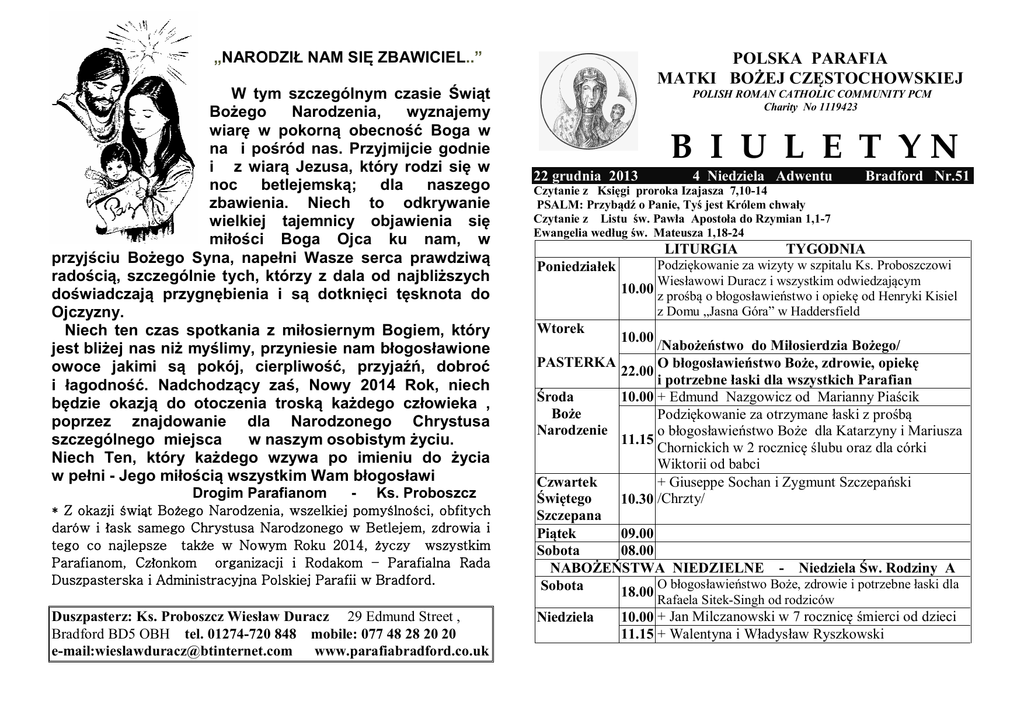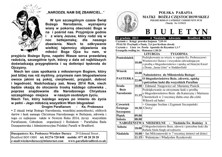 „NARODZI NAM SI ZBAWICIEL..” W tym szczególnym czasie wi t Bo ego Narodzenia, wyznajemy wiar w pokorn obecno Boga w na i po ród nas. Przyjmijcie godnie i z wiar Jezusa, który rodzi si w noc betlejemsk ; dla naszego zbawienia. Niech to odkrywanie wielkiej tajemnicy objawienia si mi ci Boga Ojca ku nam, w przyj ciu Bo ego Syna, nape ni Wasze serca prawdziw rado ci , szczególnie tych, którzy z dala od najbli szych do wiadczaj przygn bienia i s dotkni ci t sknota do Ojczyzny. Niech ten czas spotkania z mi osiernym Bogiem, który jest bli ej nas ni my limy, przyniesie nam b ogos awione owoce jakimi s pokój, cierpliwo , przyja , dobro i agodno . Nadchodz cy za , Nowy 2014 Rok, niech dzie okazj do otoczenia trosk ka dego cz owieka , poprzez znajdowanie dla Narodzonego Chrystusa szczególnego miejsca w naszym osobistym yciu. Niech Ten, który ka dego wzywa po imieniu do ycia w pe ni - Jego mi ci wszystkim Wam b ogos awi Drogim Parafianom - Ks. Proboszcz * Z okazji wi t Bo ego Narodzenia, wszelkiej pomy lno ci, obfitych darów i ask samego Chrystusa Narodzonego w Betlejem, zdrowia i tego co najlepsze tak e w Nowym Roku 2014, yczy wszystkim Parafianom, Cz onkom organizacji i Rodakom – Parafialna Rada Duszpasterska i Administracyjna Polskiej Parafii w Bradford. POLSKA PARAFIA MATKI BO EJ CZ STOCHOWSKIEJ POLISH ROMAN CATHOLIC COMMUNITY PCM Charity No 1119423 B I U L E T YN 22 grudnia 2013 Czytanie z Ksi gi PSALM: Przyb Czytanie z Listu Ewangelia wed ug 4 Niedziela Adwentu LITURGIA Poniedzia ek Wtorek Bradford Nr.51 proroka Izajasza 7,10-14 o Panie, Ty jest Królem chwa y w. Paw a Aposto a do Rzymian 1,1-7 w. Mateusza 1,18-24 TYGODNIA Podzi kowanie za wizyty w szpitalu Ks. Proboszczowi Wies awowi Duracz i wszystkim odwiedzaj cym 10.00 z pro o b ogos awie stwo i opiek od Henryki Kisiel z Domu „Jasna Góra” w Haddersfield 10.00 /Nabo stwo do Mi osierdzia Bo ego/ PASTERKA O b ogos awie stwo Bo e, zdrowie, opiek 22.00 i potrzebne aski dla wszystkich Parafian roda 10.00 + Edmund Nazgowicz od Marianny Pia cik Bo e Podzi kowanie za otrzymane aski z pro Narodzenie o b ogos awie stwo Bo e dla Katarzyny i Mariusza 11.15 Chornickich w 2 rocznic lubu oraz dla córki Wiktorii od babci + Giuseppe Sochan i Zygmunt Szczepa ski Czwartek wi tego 10.30 /Chrzty/ Szczepana Pi tek 09.00 Sobota 08.00 NABO STWA NIEDZIELNE - Niedziela w. Rodziny A O b ogos awie stwo Bo e, zdrowie i potrzebne aski dla Sobota 18.00 Rafaela Sitek-Singh od rodziców Duszpasterz: Ks. Proboszcz Wies aw Duracz 29 Edmund Street , Bradford BD5 OBH tel. 01274-720 848 mobile: 077 48 28 20 20 e-mail:[email protected] www.parafiabradford.co.uk Niedziela 10.00 + Jan Milczanowski w 7 rocznic mierci od dzieci 11.15 + Walentyna i W adys aw Ryszkowski Lektorzy - Sobota 28.12.2013 g.18.00 R.Dziama Niedziela 29.12.2013 g. 10.00 - J. Nowicki g.11.15 - Pier ci scy Dy ur przedstawiciela PRD Sali w. Brata Alberta, sobota i niedziela 28-29.12.2013 – A.J. Ma kowscy OFIARY Na potrzeby parafii – £ Na kwiaty – Lademan £20; A. Mróz £10; S.Wolniewicz £10. Taca dla parafii – 15.12.2013 - £ 447.64 Gift Aid 03.11.2013 - £ 75. ywy Ró aniec dla Ko cio a na Wschodzie £100. Je eli kto z Parafian pragnie z ofiar czekiem/na dowolny cel parafialny/, prosimy go wypisa na –P.C.M. BRADFORD. Wszystkim ofiarodawcom sk adamy serdeczne podzi kowanie za one ofiary na nasze cele parafialne. Bóg zap . *** OG OSZENIA DUSZPASTERSKIE *** 1. Prze ywamy dzi czwart , ostatni niedziel Adwentu. Mimo e od wi t dziel nas tylko dwa dni, starajmy si je prze ci gle jeszcze w klimacie oczekiwania, by z tym wi ksz rado ci w sercu przywita Przychodz cego Chrystusa. Nie przy pieszajmy tego, co ma nadej , gdy przedwczesna rado jest niepe na. 2. We wtorek ostatnia Msza w. roratnia o godz.10.00 Nadal towarzyszy nam duch radosnego oczekiwania. Nie zapominajmy o osobistym spotkaniu z Chrystusem w naszej modlitwie, w Jego s owie, a o ile mamy tak mo liwo , równie w Komunii w. Uczmy takiej postawy nasze dzieci. Niech one widz nas kl kaj cych do modlitwy. Nie narzucajmy im tego, czego sami nie czynimy, lecz kl kajmy razem, wyja niaj c dzieciom, dlaczego to czynimy, dlaczego jest to wa ne w naszym yciu. 3. W Wigili uroczysto ci Narodzenia Pa skiego zach camy do zachowania polskich tradycji, aby my z tym wi ksz rado ci w sercu mogli zasi do wieczornej wieczerzy. Niech ona równie , tam gdzie to mo liwe, tradycyjnie b dzie z ona z postnych potraw. 4. Zbli aj ce si wi ta Narodzenia Pa skiego s równie doskona a okazj , by wprowadza dzieci w tajemnice naszej wiary, by rozmawia z nimi na temat tego, w co i dlaczego wierzymy. Nie tra my tej okazji przekazania wiary. Niech tradycja tych wiat nie ogranicza si jedynie do wspólnie spo ytej wigilijnej wieczerzy, po amania si op atkiem czy wr czenia prezentów spod choinki i ewentualnego przyj cia na pasterk . Chciejmy razem piewa kol dy, po wi my czas na wspólne rozmowy o tym, co wydarzy o si w Betlejem 2000 lat temu, ale te o tym, co dzieje si teraz w naszym yciu, dlaczego obchodzimy te wi ta. 5. Pasterka w naszym ko ciele b dzie o godz.22.00, w Wakefield o g.20.00 w Halifax o g.24.00. Pozosta e Msze w. w dzie Bo ego Narodzenia b o godz.10.00 i 11.15 W dzie w. Szczepana, tradycyjnie drugi dzie Narodzenia Pa skiego, Msza w. o godz.10.30 i w Halifax o g.13.00. W Sali w. Brata Alberta, w ka sobot i niedziel mo na naby tygodnik katolicki „Go Niedzielny” w cenie 1.50. ” wi ta i zbawienna jest my l modli si za umar ych, aby od grzechów byli uwolnieni” 2 Mach 12,45. Z naszej wspólnoty parafialnej odesz a do wieczno ci: 13.12.2013 .P. PALMIRA CIERESZKO L.85. Pole my j Bo emu Mi osierdziu w naszych osobistych modlitwach. * Wielebnemu Ksi dzu Proboszczowi i wszystkim Parafianom a szczególnie Cz onkom ywego Ró ca i go ciom sk adamy najserdeczniejsze yczenia wi teczne i noworoczne. Niech Chrystus Wam b ogos awi, obdarza wszelkim dobrem i zdrowiem a Maryja niech Was prowadzi zawsze do Syna- Zarz d Stowarzyszenia ywego Ró ca. * Z okazji wi