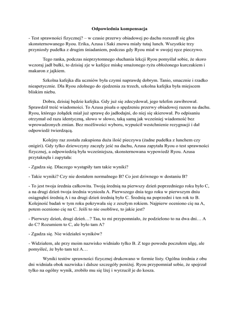 Odpowiednia kompensacja - Test sprawności fizycznej? – w czasie przerwy obiadowej po dachu rozszedł się głos skonsternowanego Ryou. Erika, Azusa i Saki znowu miały tutaj lunch. Wszystkie trzy przyniosły pudełka z drugim śniadaniem, podczas gdy Ryou miał w swojej ręce pieczywo. Tego ranka, podczas nieprzytomnego słuchania lekcji Ryou pomyślał sobie, że skoro wczoraj jadł bułki, to dzisiaj zje w kafejce miskę smażonego ryżu obłożonego kurczakiem i makaron z jajkiem. Szkolna kafejka dla uczniów była czymś naprawdę dobrym. Tanio, smacznie i rzadko nieapetycznie. Dla Ryou zdolnego do zjedzenia za trzech, szkolna kafejka była miejscem bliskim niebu. Dobra, dzisiaj będzie kafejka. Gdy już się zdecydował, jego telefon zawibrował. Sprawdził treść wiadomości. To Azusa pisała o spędzeniu przerwy obiadowej razem na dachu. Ryou, którego żołądek miał już sprawę do jadłodajni, do niej się skierował. Po odpisaniu otrzymał od razu identyczną, słowo w słowo, taką samą jak wcześniej wiadomość bez wprowadzonych zmian. Bez możliwości wyboru, wypuścił westchnienie rezygnacji i dał odpowiedź twierdzącą. Kolejny raz została zakupiona duża ilość pieczywa (żadne pudełka z lunchem czy onigiri). Gdy tylko dziewczyny zaczęły jeść na dachu, Azusa zapytała Ryou o test sprawności fizycznej, a odpowiedzią była wcześniejsza, skonsternowana wypowiedź Ryou. Azusa przytaknęła i zapytała: - Zgadza się. Dlaczego wystąpiły tam takie wyniki? - Takie wyniki? Czy nie dostałem normalnego B? Co jest dziwnego w dostaniu B? - To jest twoja średnia całkowita. Twoją średnią na pierwszy dzień poprzedniego roku było C, a na drugi dzień twoja średnia wyniosła A. Pierwszego dnia tego roku w pierwszym dniu osiągnąłeś średnią A i na drugi dzień średnią było C. Średnią na poprzedni i ten rok to B. Kolejność badań w tym roku pokrywała się z zeszłym rokiem. Najpierw oceniono cię na A, potem oceniono cię na C. Jeśli to nie osobliwe, to jakie jest? - Pierwszy dzień, drugi dzień…? Taa, to mi przypomniało, że podzielono to na dwa dni… A do C? Rozumiem to C, ale było tam A? - Zgadza się. Nie widziałeś wyników? - Widziałem, ale przy moim nazwisko widniało tylko B. Z tego powodu poczułem ulgę, ale pomyśleć, że było tam też A… Wyniki testów sprawności fizycznej drukowano w formie listy. Ogólna średnia z obu dni widniała obok nazwiska i dalsze szczegóły poniżej. Ryou przypomniał sobie, że spojrzał tylko na ogólny wynik, zrobiło mu się lżej i wyrzucił je do kosza. - Dlaczego były tam takie wyniki? – gdy Azusa ponownie zapytała, Ryou wzruszył ramionami i odpowiedział: - Starałem się uzyskać mniej więcej B z tych dwóch dni… Czemu tak wyszło danego dnia nie jest dla mnie jasne. Szukałem gościa, którego odruchy wydawały się do kitu i po prostu uzyskałem taki sam wynik jak ta osoba. Jednak, żeby wmieszało się tam A… Mimo wszystko, przypuszczam, że nie można określić refleksu osoby po jej twarzy… - ostatnie słowa wypowiedział z obawą, kręcąc głową. - Dlaczego chciałeś koniecznie uzyskać takie beznadziejne wyniki? – zapytała rozsądnie po takiej odpowiedzi Azusa. - Dobry wynik by się wyróżniał. Byłoby nieprzyjemnie być zapraszanym do klubów sportowych. - Mówisz tak, jakbyś był pewny swoich odruchów. - W miarę. Faktycznie, gdybym złożył wyniki z tego i zeszłego roku, myślę, że mógłbym uzyskać A z obu? - Zgadzam się. - Myślę, że powinno się raczej spytać, dlaczego jesteś świadoma moich wyników sprawnościowych… - To banalna sprawa, nie martw się tym. Pomijając to, skłaniam się ku temu, żeby usłyszeć o twoich prawdziwych umiejętnościach fizycznych… - Nawet jeśli poprosisz, bieganie w tym upale zwróci na mnie uwagę, więc nigdy tego nie zrobię. - Cóż, prędzej czy później będę miała okazję, by to zobaczyć. - Nie zrobię tego, to uciążliwe, więc nie zrobię. - Nie bądź taki oziębły. - Serio… Pomijając to, co z nią? – mówiąc to, Ryou odwrócił się do Eriki. Nie brała udziału w rozmowie jego i Azusy sprzed chwili. Od momentu, w którym przyszedł, miała spuszczoną głowę i skubała swoją spódniczkę, drżąc. - Z nią…? Czyż nie jest urocza? Coś jest nie tak? – Azusa przeniosła swoją uwagę na Erikę z wypisaną czystą rozkoszą na twarzy. - Przyznam, że jest urocza. Aa, domyślam się, czemu tak to wyszło, więc powiedz mi, co mam mówić – powiedział pewnie Ryou. Myślał o wczoraj i wierzył, że to było przyczyną tego zachowania. I to się, rzeczywiście, zgadzało. Mimo, że Ryou był świadomy tego, co widział, byłoby dziwne, gdyby przeprosił. Tak naprawdę, nic nie zrobił, można powiedzieć, że tylko spojrzał. Z drugiej jednak strony, jeśli jego uczucie wdzięczności by się ujawniło, sprawa niepotrzebnie obrałaby zły obrót, więc Ryou nie wiedział, jak postąpić. Rozumiał tylko, że jedynie może zachować na zawsze obejrzany wczoraj spektakl w którymś ze swoich zwojów mózgowych. - Hmm… Sądzę, że musisz szybko się do niej odezwać – powiedziała Azusa po chwili wahania. - Odezwać? – zapytał zaskoczony Ryou. - Ta. Nie zapomnij użyć jej imienia – rzekła Azusa radośnie. - Imię? Czy to było Fujimoto…? – wymamrotał Ryou, próbując je sobie przypomnieć. - Inaczej, to ma być inaczej. Pierwsze imię. Nazwij ją Erika – Azusa śmiała się coraz radośniej. - Co… Czy samo nazwisko nie wystarczy? – powiedział Ryou lekko skonfundowany. - Nie wystarczy. Jeśli to nie będzie jej imię, nie wystąpi żadna reakcja. - … Naprawdę? – zapytał Ryou, trochę powątpiewając. - Naprawdę – potwierdziła Azusa bez wahania. - Ech… Yy… Ekchem, E-Erika – wyjąkał Ryou, wołając do Eriki delikatnym głosem i lekko się rumieniąc. Jednak Erika nadal patrzyła w dół. - Twój głos był za cichy, nie może go usłyszeć