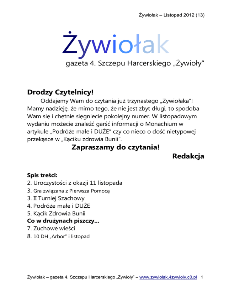 Żywiołak – Listopad 2012 (13) Żywiołak gazeta 4. Szczepu Harcerskiego „Żywioły” Drodzy Czytelnicy! Oddajemy Wam do czytania już trzynastego „Żywiołaka”! Mamy nadzieję, że mimo tego, że nie jest zbyt długi, to spodoba Wam się i chętnie sięgniecie pokolejny numer. W listopadowym wydaniu możecie znaleźć garść informacji o Monachium w artykule „Podróże małe i DUŻE” czy co nieco o dość nietypowej przekąsce w „Kąciku zdrowia Bunii”. Zapraszamy do czytania! Redakcja Spis treści: 2. Uroczystości z okazji 11 listopada 3. Gra związana z Pierwsza Pomocą 3. II Turniej Szachowy 4. Podróże małe i DUŻE 5. Kącik Zdrowia Bunii Co w drużynach piszczy... 7. Zuchowe wieści 8. 10 DH „Arbor” i listopad Żywiołak – gazeta 4. Szczepu Harcerskiego „Żywioły” – www.zywiolak.4zywioly.c0.pl 1 Żywiołak – Listopad 2012 (13) Uroczystości z okazji 11 listopada 11 listopada 1918r. Polska odzyskała niepodległość po 123 latach niewoli. Co roku obchodzone są z tej okazji uroczystoś ci. Krzeszowiccy harcerze rozpoczeli to świętowanie apelem hufca o 1045. Większość drużyn z Hufca Krzeszowice meldowało swoją gotowość do pracy :) Został odczytany także rozkaz specjalny hm. Małgorzaty Sinicy – naczelniczki ZHP ogłaszający żałobę w naszym związku ze względu na śmierć dh Barbary Bogdańskiej – Pawłowskiej (druhna była związana z ruchem drużyn Grunwaldzkich). Po apelu udaliśmy się kolumną dwójkową pod Grób Nieznanego Żołnierza. Tam chwilę poczekaliśmy i zaczęły się obchody. Najpierw burmistrz wygłosił przemowę o tym ważnym święcie, a później różne organizacje złożyły kwiaty na płycie grobu. Na koniec sztandar naszego hufca został udekorowany Krzyżem za Zasługi dla Związku Kombatantów Rzeczpospolitej Polskiej i byłych Więźniów Politycznych przez przedwojennego harcerza, żołnierza września, Józefa Brzózkę. Wręczanie odznaczenia prowadził sierżant Mieczysław Wójcik. Po uroczystościach w Parku Bogackiego przeszliśmy na mszę świętą za Ojczyznę o godzinie 1200 do kościoła pw. św. Marcina. Na obchodach byli przedstawiciele każdej drużyny z naszego hufca, a uroczystości przebiegły bez zbędnych komplikacji. Dziękujemy wszystkim, którzy przyszli i mamy nadzieję, że na kolejnych tego typu uroczystościach będzie nas jeszcze więcej, bo musimy pielegnować nasze postawy patriotyczne. Kelaris (Zdjęcia z www.dolinainformacji.pl) Żywiołak – gazeta 4. Szczepu Harcerskiego „Żywioły” – www.zywiolak.4zywioly.c0.pl 2 Żywiołak – Listopad 2012 (13) Gra związana z Pierwsza Pomocą 11 listopada, po mszy świętej za ojczyznę odbyła się gra organizowana przez niedawno reaktywowany Harcerski Klub Pierwszej Pomocy „KASZEL”. Były przygotowane dwie trasy, tj. harcerska i zuchowa. Uczestnicy musieli wykazać się umiejętnościami ratowniczymi i zimną krwią przy udzielaniu pomocy. Nie zawsze im to wychodziło, ale jeszcze wszystko przed nimi i wszystkiego zdążą się nauczyć. Mamy nadzieję, że wszyscy dobrze się bawili i wynieśli z tej gry jakąś wiedzę. Kelaris II Turniej Szachowy Dnia 10 listopada w siedzibie naszego hufca odbył się II Turniej Szachowy organizowany przez przybocznego 44 DH – dh Przemka Szopę. Uczestnicy zebrali się o godzinie 1400, aby zmierzyć się ze sobą. Na początku każdy z uczestników wylosował numerek, aby mógł wyczytać z tabeli rozgrywek z kim i kiedy gra. Jedna partia trwała maksymalnie 15 min - jednym wystarczało, innym zaś brakowało czasu na dokończenie swojej gry. W turnieju udział wzięli Wojtek Dąbek, Ignacy Krzanik, Artur Piórko, Jasiek Mitka, Dawid Kozub, Kamil Stachańczyk i Bartek Korbiel. Rozgrywki trwały prawie trzy godziny. Jednak zwycięzcą był tylko jeden... Na najwyższym miejscu na podium – już po raz drugi – stanął Bombel – inaczej Wojtek Dąbek, który zawzięcie walczył o swoją wygraną. Drugie miejsce zajął Kamil Stachańczyk, a zaraz za nim na miejscu 3 Bartek Korbiel. Zwycięzcy zostali nagrodzeni dyplomami i medalami. Gratulujemy wygranym i życzymy dalszych osiągnięć w tym sporcie! Ines Żywiołak – gazeta 4. Szczepu Harcerskiego „Żywioły” – www.zywiolak.4zywioly.c0.pl 3 Żywiołak – Listopad 2012 (13) Podróże małe i DUŻE Jakże cudowna jest ta jesień! Słoneczna, ciepła, złota i… niemiecka? Tak, bo w tym numerze „Żywiołaka” przeniesiemy się do przepięknego Monachium w Bawarii. To miasto zamieszkuje dwa razy tyle ludzi, co w Krakowie. Leży w południowych Niemczech nad rzeką Izarą i jest stolicą regionu Bawaria. Powstało w 1158 r. przy zamku i klasztorze dzięki Henrykowi Lwu, księciu Bawarii. Centralnym punktem miasta jest Marienplatz (Plac Mariacki), przy którym mieszczą się dwa ratusze – stary (aktualnie muzeum zabawek) i nowy (monumentalny budynek posiadający 6 dziedzińców z bogato zdobioną elewacją przedstawiającą historię Bawarii, na wieży 43 dzwony i mechanizm zegarowy – czwarty pod względem wielkości na świecie). Inne cenne i przepiękne zabytki, które tworzą klimat tego miasta to m.in.: § Katedra Najświętszej Marii Panny (Frauenkirche) – główna świątynia miasta, styl późnogotycki, kościół halowy, wieże o wysokości 99 m nakryte barokowymi cebulastymi hełmami, § Kościół św. Piotra – najstarsza świątynia w Monachium, przebudowywana wiele razy, bardzo zniszczona w czasie II wojny światowej, posiada charakterystyczną wysoką wieżę, nazywaną „Starym Piotrem”, z której rozpościera się jedna z najpiękniejszych panoram miasta, § Kościół Ducha Świętego – pierwotnie gotycki, przebudowany w stylu barokowym, zniszczony w czasie bombardowania – odbudowa jeszcze się nie zakończyła, § Bürgersaal – budynek zbudowany w Nowy Ratusz, Monachium stylu Żywiołak – gazeta 4. Szczepu Harcerskiego „Żywioły” – www.zywiolak.4zywioly.c0.pl 4 Żywiołak 