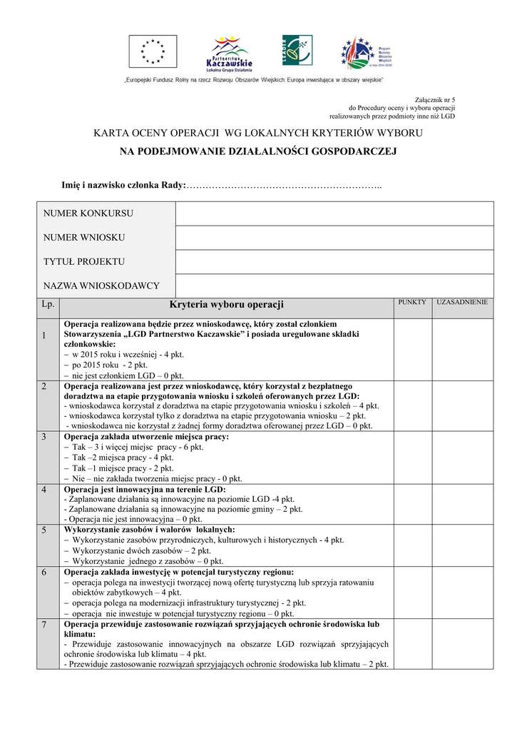 Załącznik nr 5 do Procedury oceny i wyboru operacji realizowanych przez podmioty inne niż LGD KARTA OCENY OPERACJI WG LOKALNYCH KRYTERIÓW WYBORU NA PODEJMOWANIE DZIAŁALNOŚCI GOSPODARCZEJ Imię i nazwisko członka Rady:…………………………………………………….. NUMER KONKURSU NUMER WNIOSKU TYTUŁ PROJEKTU NAZWA WNIOSKODAWCY Lp. 1 2 3 4 5 6 7 Kryteria wyboru operacji Operacja realizowana będzie przez wnioskodawcę, który został członkiem Stowarzyszenia „LGD Partnerstwo Kaczawskie” i posiada uregulowane składki członkowskie: w 2015 roku i wcześniej - 4 pkt. po 2015 roku - 2 pkt. nie jest członkiem LGD – 0 pkt. Operacja realizowana jest przez wnioskodawcę, który korzystał z bezpłatnego doradztwa na etapie przygotowania wniosku i szkoleń oferowanych przez LGD: - wnioskodawca korzystał z doradztwa na etapie przygotowania wniosku i szkoleń – 4 pkt. - wnioskodawca korzystał tylko z doradztwa na etapie przygotowania wniosku – 2 pkt. - wnioskodawca nie korzystał z żadnej formy doradztwa oferowanej przez LGD – 0 pkt. Operacja zakłada utworzenie miejsca pracy: Tak – 3 i więcej miejsc pracy - 6 pkt. Tak –2 miejsca pracy - 4 pkt. Tak –1 miejsce pracy - 2 pkt. Nie – nie zakłada tworzenia miejsc pracy - 0 pkt. Operacja jest innowacyjna na terenie LGD: - Zaplanowane działania są innowacyjne na poziomie LGD -4 pkt. - Zaplanowane działania są innowacyjne na poziomie gminy – 2 pkt. - Operacja nie jest innowacyjna – 0 pkt. Wykorzystanie zasobów i walorów lokalnych: Wykorzystanie zasobów przyrodniczych, kulturowych i historycznych - 4 pkt. Wykorzystanie dwóch zasobów – 2 pkt. Wykorzystanie jednego z zasobów – 0 pkt. Operacja zakłada inwestycję w potencjał turystyczny regionu: operacja polega na inwestycji tworzącej nową ofertę turystyczną lub sprzyja ratowaniu obiektów zabytkowych – 4 pkt. operacja polega na modernizacji infrastruktury turystycznej - 2 pkt. operacja nie inwestuje w potencjał turystyczny regionu – 0 pkt. Operacja przewiduje zastosowanie rozwiązań sprzyjających ochronie środowiska lub klimatu: - Przewiduje zastosowanie innowacyjnych na obszarze LGD rozwiązań sprzyjających ochronie środowiska lub klimatu – 4 pkt. - Przewiduje zastosowanie rozwiązań sprzyjających ochronie środowiska lub klimatu – 2 pkt. PUNKTY UZASADNIENIE - Nie przewiduje się zastosowania powyższych rozwiązań – 0 pkt. 8 9 10 11 12 Operacja ukierunkowana jest na zaspokajanie potrzeb grup zagrożonych wykluczeniem społecznym, które określone są w LSR: Operacja skierowana jest przynajmniej do dwóch grup defaworyzowanych ze względu na rynek pracy: osoby długotrwale bezrobotne, osoby bez kwalifikacji zawodowych, osoby bez wykształcenia średniego, kobiety, niepełnosprawni, seniorów, młodzieży od 18 do 30 roku życia – 4 pkt. Operacja skierowana jest przynajmniej do jednej z ww grup defaworyzowanych - 2 pkt. Operacja nie wskazuje żadnej grupy defaworyzowanej – 0 pkt. Operacja przyczynia się do osiągnięcia celu szczegółowego i wpływa na osiąganie przynajmniej jednego właściwego dla tego celu wskaźnika rezultatu oraz przynajmniej jednego wskaźnika produktu w ramach realizowanego przedsięwzięcia: - Operacja przyczyni się do osiągnięcia, co najmniej 1 wskaźnika produktu i 1 wskaźnika rezultatu określonych w LSR – 2 pkt. - Operacja nie wskazuje osiągnięcia żadnego ze wskaźników określonych w LSR – 0 pkt. Operacja będzie realizowana przez wnioskodawcę zakładającego lub rozwijającego działalność gospodarczą w zakresie: produkcji lokalnych produktów – 4 pkt. usług turystycznych, w tym bazy gastronomicznej i/lub noclegowej – 2 pkt. - w pozostałych zakresach – 0 pkt. Operacja będzie realizowana przez osobę lub tworzy miejsce pracy dla osób ze wskazanych w LSR grup defaworyzowanych ze względu na dostęp do rynku pracy: - Osoba z grupy defaworyzowanej ze względu na dostęp do rynku pracy (osoby długotrwale bezrobotne, osoby bez kwalifikacji zawodowych, osoby bez wykształcenia średniego, osoby niepełnosprawne, powyżej 50 r.ż., kobiety, młodzież od 18 do 30 r.ż.) – 4 pkt. - żadna z powyższych - 0 pkt. Wnioskodawca na dzień złożenia wniosku jest zameldowany na obszarze LGD lub jest właścicielem nieruchomości, na której przeprowadzona będzie operacja: - 6 miesięcy i dłużej – 4 pkt. - krócej niż 6 miesięcy – 0 pkt. SUMA PUNKTÓW Data i podpis członka Rady ……………………………………… Przewodniczący Zebrania Karta oceny operacji wg kryteriów wyboru jest wypełniana przez członka Rady Stowarzyszenia „Lokalna Grupa Działania Partnerstwo Kaczawskie”. Wszystkie rubryki zawarte w karcie muszą być wypełnione, w przeciwnym razie kartę uważa się za nieważną. Ocena musi być liczbą całkowitą, nie może być ułamkiem. Rodzaj operacji/ beneficjenta Założenie działalności gospodarczej Maksymalna liczba punktów Minimalna liczba punktów koniecznych do uzyskania 48 pkt. 50% liczby maksymalnej