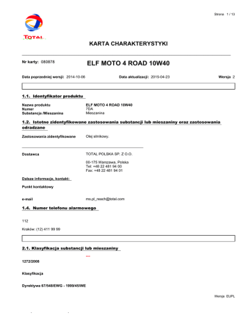 Strona 1 / 13 KARTA CHARAKTERYSTYKI ____________________________________________________________________________________________ Nr karty: 080878 ELF MOTO 4 ROAD 10W40 Data poprzedniej wersji: 2014-10-06 Data aktualizacji: 2015-04-23 Wersja 2 1.1. Identyfikator produktu Nazwa produktu Numer Substancja /Mieszanina ELF MOTO 4 ROAD 10W40 7DA Mieszanina 1.2. Istotne zidentyfikowane zastosowania substancji lub mieszaniny oraz zastosowania odradzane Zastosowania zidentyfikowane Olej silnikowy. Dostawca TOTAL POLSKA SP. Z O.O. 00-175 Warszawa, Polska Tel: +48 22 481 94 00 Fax: +48 22 481 94 01 Dalsze informacje, kontakt: Punkt kontaktowy e-mail [email protected] 1.4. Numer telefonu alarmowego 112 Kraków: (12) 411 99 99 2.1. Klasyfikacja substancji lub mieszaniny *** 1272/2008 Klasyfikacja Dyrektywa 67/548/EWG - 1999/45/WE Wersja EUPL Quick-FDS [17347-61610-15766-017089] - 2015-06-29 - 17:06:50 Strona 2 / 13 ____________________________________________________________________________________________ Nr karty: 080878 ELF MOTO 4 ROAD 10W40 Data aktualizacji: 2015-04-23 Wersja 2 ____________________________________________________________________________________________ Produkt nie jest klasyfikowany jako niebezpieczny zgodnie z dyrektywami 67/548/EEC i jej poprawkami i/lub 1999/45/EC i jej poprawkami Symbol(-e) Nie klasyfikowany 2.2. Elementy etykiety Oznakowanie zgodne z *** Zwroty ostrzegawcze 3.2. Mieszanina Nazwa chemiczna Nr WE 265-157-1 Numer rejestracji REACH 01-2119484627-25 Nr CAS Klasyfikacja 67/548 64742-54-7 <10 - Klasyfikacja Rozp. 1272/2008 Asp. Tox. 1 (H304) 265-169-7 01-2119471299-27 64742-65-0 <5 - Asp. Tox. 1 (H304) obrabiane wodorem (ropa naftowa)*** odparafinowania rozpuszczalnikowego (ropa naftowa)*** Dodatkowe wskazówki DMSO, zgodnie z IP 346 < 3%. Wersja EUPL Quick-FDS [17347-61610-15766-017089] - 2015-06-29 - 17:06:50 Strona 3 / 13 ____________________________________________________________________________________________ Nr karty: 080878 ELF MOTO 4 ROAD 10W40 Data aktualizacji: 2015-04-23 Wersja 2 ____________________________________________________________________________________________ Zalecenia ogólne LUB POGOTOWIE RATUNKOWE. Kontakt z oczami Wdychanie Kontakt z oczami Nie klasyfikowany. Nie klasyfikowany. Wdychanie Uwagi dla lekarza 2 Wersja EUPL Quick-FDS [17347-61610-15766-017089] - 2015-06-29 - 17:06:50 Strona 4 / 13 ____________________________________________________________________________________________ Nr karty: 080878 ELF MOTO 4 ROAD 10W40 Data aktualizacji: 2015-04-23 Wersja 2 ____________________________________________________________________________________________ Inne informacje przepisami. awaryjnych Informacja ogólna Informacja ogólna 6.4. Odniesienia do innych sekcji Utylizacja odpadów Patrz sekcja 13. zalecenia Wersja EUPL Quick-FDS [17347-61610-15766-017089] - 2015-06-29 - 17:06:50 Strona 5 / 13 ____________________________________________________________________________________________ Nr karty: 080878 ELF MOTO 4 ROAD 10W40 Data aktualizacji: 2015-04-23 Wersja 2 ____________________________________________________________________________________________ Higiena pracy zanieczyszczonych produktem. magazynowania Mocne utleniacze. Specyficzne zastosowania USA: wg OSHA (PEL) TWA (polski odpowiednik NDS) 5mg/m3, NIOSH (REL) TWA (polski odpowiednik NDS) 5mg/m3 - STEL (polski odpowiednik NDSCh) 10 mg/m3, ACGIH mg/m3 3, NDSCh-10 mg/m3; *** Legenda Nazwa chemiczna Patrz sekcja 16 Okres krótki, skutki systemowe parafinowe, obrabiane wodorem (ropa naftowa)*** 64742-54-7 Okres krótki, skutki miejscowe systemowe miejscowe 5.4 mg/m3/8h (aerosol inhalation) Wersja EUPL Quick-FDS [17347-61610-15766-017089] - 2015-06-29 - 17:06:50 Strona 6 / 13 ____________________________________________________________________________________________ Nr karty: 080878 ELF MOTO 4 ROAD 10W40 Data aktualizacji: 2015-04-23 Wersja 2 ____________________________________________________________________________________________ 5.4 mg/m3/8h (aerosol inhalation) parafinowe z odparafinowania rozpuszczalnikowego (ropa naftowa)*** 64742-65-0 Nazwa chemiczna Okres krótki, skutki systemowe parafinowe, obrabiane wodorem (ropa naftowa)*** 64742-54-7 Okres krótki, skutki miejscowe systemowe miejscowe 1.2 mg/m3/24h (aerosol inhalation) 1.2 mg/m3/24h (aerosol inhalation) parafinowe z odparafinowania rozpuszczalnikowego (ropa naftowa)*** 64742-65-0 Informacja ogólna postaci. Ochrona dróg oddechowych zaleceniami producenta i przepisami krajowymi z obszaru doboru i stosowania.*** Ochrona oczu Wersja EUPL Quick-FDS [17347-61610-15766-017089] - 2015-06-29 - 17:06:50 Strona 7 / 13 ____________________________________________________________________________________________ Nr karty: 080878 ELF MOTO 4 ROAD 10W40 Data aktualizacji: 2015-04-23 Wersja 2 ____________________________________________________________________________________________ Informacja ogólna Barwa Stan fizyczny w 20°C Zapach ciecz Charakterystyczny Uwagi Nie dotyczy Nie dotyczy pH Temperatura wrzenia/zakres temperatur wrzenia Metoda Cleveland Open Cup (COC) Cleveland Open Cup (COC) 230 °C 446 °F 874 kg/m3 w 15 °C Nierozpuszczalny 97 mm2/s Nie jest wybuchowy w 40 °C rozpuszczalnikach logPow ISO 3104 9.2. Inne informacje Informacja ogólna Produkt jest stabilny w zalecanych warunkach magazynowania. Quick-FDS [17347-61610-15766-017089] - 2015-06-29 - 17:06:50 Strona 8 / 13 ____________________________________________________________________________________________ Nr karty: 080878 ELF MOTO 4 ROAD 10W40 Data aktualizacji: 2015-04-23 Wersja 2 ____________________________________________________________________________________________ Niebezpieczne reakcje Brak w normalnych warunkach stosowania. Mocne utleniacze. Sekcja 11: INFORMACJE TOKSYKOLOGICZNE . Nie klasyfikowany. Kontakt z oczami . Nie klasyfikowany. Wdychanie Nazwa chemiczna wodorem (ropa naftowa)*** odparafinowania rozpuszczalnikowego (ropa naftowa)*** LD50 Pokarmowe