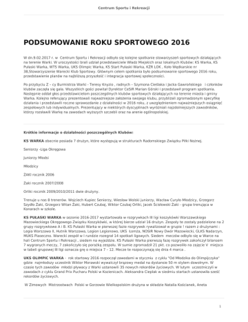 Centrum Sportu i Rekreacji PODSUMOWANIE ROKU SPORTOWEGO 2016 W dn.9.02.2017 r. w Centrum Sportu i Rekreacji odbyło się kolejne spotkanie stowarzyszeń sportowych działających na terenie Warki. W uroczystości brali udział przedstawiciele Władz Miejskich oraz lokalnych Klubów: KS Warka, KS Pułaski Warka, WTS Warka, UKS Olimpic Warka, KS Start Pułaski Warka, KŻR LOK , Koło Wędkarskie nr 38,Stowarzyszenie Warecki Klub Sportowy. Głównym celem spotkania było podsumowanie sportowego 2016 roku, przedstawienie planów na najbliższą przyszłość i integracja sportowej społeczności. Po przybyciu Z – cy Burmistrza Warki - Teresy Knyzio , radnych – Szymona Cieślaka i Jacka Gawrońskiego i członków klubów zaczęła się gala. Wszystkich gości powitał Dyrektor CeSiR Marian Górski i przedstawił program spotkania. Następnie oddał głos przedstawicielom poszczególnych klubów sportowych działających na terenie miasta i gminy Warka. Kolejno referujący prezentowali najważniejsze założenia swojego klubu, przybliżali zgromadzonym specyfikę działania i przedstawili roczne sprawozdanie z działalności w 2016 roku, z uwzględnieniem najważniejszych osiągnięć zespołowych lub indywidualnych. Prezentujący w niektórych dyscyplinach wyróżniali najzdolniejszych zawodników, którzy rozsławili Warkę na zawodach wyższych szczebli oraz na arenie ogólnopolskiej. Krótkie informacje o działalności poszczególnych Klubów: KS WARKA obecnie posiada 7 drużyn, które występują w strukturach Radomskiego Związku Piłki Nożnej. Seniorzy -Liga Okręgowa Juniorzy Młodsi Młodzicy ŻAKI rocznik 2006 Żaki rocznik 2007/2008 Orliki rocznik 2009/2010/2011 dwie drużyny. Trenuje u nas 8 trenerów. Wojciech Kupiec Seniorzy, Wiesław Wolski juniorzy, Wacław Curyło Młodzicy, Grzegorz Szydło Żaki, Grzegorz Witan Żaki, Hubert Czubaj, Wiktor Czubaj Orliki, Jacek Ścisłowski Żaki - grupa trenująca w Konarach w szkole. KS PUŁASKI WARKA w sezonie 2016-2017 wystartowała w rozgrywkach III ligi koszykówki Warszawskiego Mazowieckiego Okręgowego Związku Koszykówki, w której bierze udział 16 drużyn. Zespoły te zostały podzielone na 2 grupy rozgrywkowe A i B. KS Pułaski Warka w pierwszej fazie rozgrywek rywalizował w grupie ! razem z drużynami : Legia Warszawa II, Hutnik Warszawa, Legion Legionowo, UKS Łomża, NOSIR Nowy Dwór Mazowiecki, GLKS Nadarzyn, MUKS Piaseczno. Warecki zespół w I rundzie rozegrał 14 spotkań ligowych. Siedem meczów odbyło się w Warce na hali Centrum Sportu i Rekreacji , siedem na wyjeździe. KS Pułaski Warka pierwszą fazę rozgrywek zakończył bilansem 7 wygranych meczy, 7 zakończyło się porażką zespołu. W sumie zgromadził 21 pkt. co pozwoliło na zajęcie V miejsca w tabeli grupowej III ligi oznacza grę o miejsca 7 – 12. Mecze te rozpoczynają się dnia 4 marca . UKS OLIMPIC WARKA - rok startowy 2016 rozpoczął zawodami w styczniu z cyklu "Od Młodzika do Olimpijczyka" gdzie najmłodszy uczestnik Wiktor Morawski wywalczył brązowy medal na dystansie 50 m stylem dowolnym. W czasie tych zawodów młodzi pływacy z Warki ustanowili 35 nowych rekordów życiowych. W lutym uczestniczyli w zawodach z cyklu Grand Prix Pucharu Polski w Kozienicach. Aleksandra Cieplak w siedmiu startach ustanowiła sześć rekordów życiowych. W Zimowych Mistrzostwach Polski w Gorzowie Wielkopolskim drużyna w składzie Natalia Kościanek, Aneta 1 Centrum Sportu i Rekreacji Chmielewska i Karolina Chojecka wywalczyły dwukrotnie finał "A" i 6-krotnie finał "B". Ustanowiły 5 nowych rekordów życiowych . Do Wielkiego Finału zawodów "Od Młodzika do Olimpijczyka", awansowało aż 15 zawodników. Podczas Mistrzostw Warszawsko - Mazowieckiego Okręgowego Związku Pływackiego, reprezentacja klubu w składzie: Aleksandra Cieplak, Aneta Chmielewska, Karolina Chojecka i Natalia Kościanek wywalczyły 3 złote, 3 srebrne i 2 brązowe medale oraz VII miejsce w klasyfikacji generalnej na 30 startujących klubów. Ola Cieplak dwukrotnie została Mistrzynią Mazowsza na 50 m i 100 m stylem klasycznym, Aneta Chmielewska została mistrzynią Mazowsza na 50 m stylem klasycznym i wicemistrzynią na 100 m stylem klasycznym. Natalia Kościanek - wicemistrzynią na 200 m stylem klasycznym i brązową medalistką na 100 m tym stylem. Wielkim sukcesem jest ponowne powołanie do Kadry Narodowej Juniorów naszej zawodniczki Aleksandry Cieplak. Nasi zawodnicy startowali w Grand Prix Pucharu Polski w Krakowie, Łodzi, Poznaniu. Dorobek medalowy to: 12 złoty, 2 srebrne i 5 brązowych. W Mistrzostwach Warszawy Zuzanna Regulska (r. 2004) trzykrotnie została Mistrzynią Warszawy na 50,100,200 m stylem klasycznym, Krzysztof Kasprzak (r. 2005) brązowym medalistą na 200 i 400 m stylem dowolnym, Sandra Kowalska (r.2006) brązową medalistką na 100 i 200 m stylem motylkowym. UKS Olimic Warka sezon zakończyła w Olsztynie Mistrzostwami Polski Seniorów i Młodzieżowców. W 2016 roku nasi pływacy zdobyli 31 medali złotych, 30 srebrnych i 53 brązowe. Nasz sukces z ostatnich dni to pierwsze miejsce w plebiscycie sportowym "Echa Dnia" w kategorii sportowy talent roku 2016 - Aleksandry Cieplak. SWKS - Stowarzyszenie Warecki Klub Strzelecki działa od 2010. Założyciele to kilku pasjonatów broni palnej uprawiających czynnie strzelectwo sportowe. Dziś klub zrzesza ponad 250 osób. W sezonie 2016 udział w zawodach organizowanych przez SWKS wzięło udział ok 700 osób. Wyjazdowe - Kasia Rybarczyk II miejsce Mistrzostwa Europy w strzelectwie dynamicznym, wysoka lokata Roberta Wieczorka na Mistrzostwach Świata w konkurencji pistolet CP. Główny celem działalności klubu jest praca na odbudowę strzelectwa w Polsce. Lata międzywojenne kiedy to w zasadzie każdy miał dostęp do broni wydawanej na poziomie starostwa odmienił się całkowicie po wojnie kiedy to władze i komuna całkowicie rozbroiły naród. Dziś w SWKS pozwolenie na bron posiada ok 100 osób i z