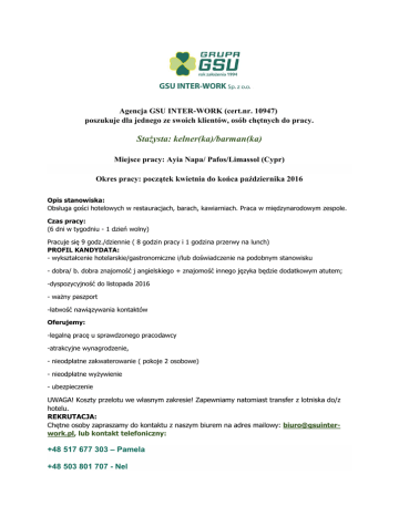 Agencja GSU INTER-WORK (cert.nr. 10947) poszukuje dla jednego ze swoich klientów, osób chętnych do pracy. Stażysta: kelner(ka)/barman(ka) Miejsce pracy: Ayia Napa/ Pafos/Limassol (Cypr) Okres pracy: początek kwietnia do końca października 2016 Opis stanowiska: Obsługa gości hotelowych w restauracjach, barach, kawiarniach. Praca w międzynarodowym zespole. Czas pracy: (6 dni w tygodniu - 1 dzień wolny) Pracuje się 9 godz./dziennie ( 8 godzin pracy i 1 godzina przerwy na lunch) PROFIL KANDYDATA: - wykształcenie hotelarskie/gastronomiczne i/lub doświadczenie na podobnym stanowisku - dobra/ b. dobra znajomość j angielskiego + znajomość innego języka będzie dodatkowym atutem; -dyspozycyjność do listopada 2016 - ważny paszport -łatwość nawiązywania kontaktów Oferujemy: -legalną pracę u sprawdzonego pracodawcy -atrakcyjne wynagrodzenie, - nieodpłatne zakwaterowanie ( pokoje 2 osobowe) - nieodpłatne wyżywienie - ubezpieczenie UWAGA! Koszty przelotu we własnym zakresie! Zapewniamy natomiast transfer z lotniska do/z hotelu. REKRUTACJA: Chętne osoby zapraszamy do kontaktu z naszym biurem na adres mailowy: [email protected], lub kontakt telefoniczny: +48 517 677 303 – Pamela +48 503 801 707 - Nel