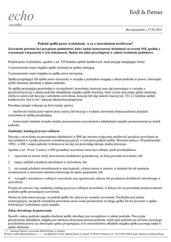 echo www.roedl.pl Rzeczpospolita z 27.04.2015 Podział spółki przez wydzielenie. A co z zezwoleniem strefowym? Zezwolenie powinno być przypisane podmiotowi, który będzie kontynuować działalność na terenie SSE zgodnie z warunkami wskazanymi w tym dokumencie. Będzie mu także przysługiwać w całości zwolnienie podatkowe. Podział przez wydzielenie, zgodnie z art. 529 kodeksu spółek handlowych, może przyjąć następujące formy: 1) przeniesienie części majątku spółki dzielonej na spółkę istniejącą, 2) przeniesienie części majątku na spółkę nowo zawiązaną. Spółka przejmująca lub spółka nowo utworzona w związku z podziałem wstępuje z dniem podziału w prawa i obowiązki spółki dzielonej określone w planie podziału. Na spółkę przejmującą przechodzą w szczególności zezwolenia, koncesje oraz ulgi pozostające w związku z przydzielonymi jej w planie podziału składnikami majątku spółki dzielonej, które zostały przyznane spółce dzielonej, chyba że ustawa lub decyzja o udzieleniu zezwolenia, koncesji lub ulgi stanowi inaczej (art. 531 § 2 kodeksu spółek handlowych). Jest to tzw. sukcesja administracyjnoprawna. Powołany przepis wskazuje na dwie istotne sprawy: - możliwość wykluczenia wprost przez ustawę lub decyzję o wydaniu zezwolenia dopuszczalności przejścia zezwolenia na spółkę przejmującą, - konieczność istnienia związku między przenoszonym zezwoleniem a składnikami majątku przenoszonymi na skutek podziału. Zamknięty katalog przyczyn cofnięcia Decyzja o zezwoleniu na prowadzenie działalności w SSE nie zawiera wyłączenia możliwości przejścia zezwolenia na inny podmiot w wyniku procesów restrukturyzacyjnych, w tym przez podział spółek. Również ustawa z 20 października 1994 r. o SSE i rozporządzenia wykonawcze do niej nie przewidują takiego skutku prawnego. Zgodnie z art. 19 ust. 3 ustawy o SSE posiadane zezwolenie może być cofnięte, jeżeli przedsiębiorca: 1. zaprzestał na terenie strefy prowadzenia działalności gospodarczej, na którą posiadał zezwolenie, lub 2. rażąco uchybił warunkom określonym w zezwoleniu, lub 3. nie usunął uchybień stwierdzonych w toku kontroli, o której mowa w ustawie, w terminie do ich usunięcia wyznaczonym w wezwaniu ministra właściwego do spraw gospodarki, lub 4. wystąpił z wnioskiem o cofnięcie zezwolenia oraz ograniczenie zakresu lub przedmiotu działalności określonego w zezwoleniu. Przepis ten zawiera więc zamknięty katalog przyczyn cofnięcia zezwolenia, w którym nie ma przesłanki przeprowadzenia podziału spółki posiadającej zezwolenie. Można by było zatem przyjąć, że podział spółki nie wpływa na ważność zezwolenia. Niezbędne jest jednak rozstrzygnięcie, na jakich warunkach zezwolenie może zostać przeniesione na drugą spółkę lub też pozostać w spółce dzielonej po wydzieleniu części majątku. Zakaz dowolnego dysponowania Sposób i zakres podziału majątku dzielonej spółki określany jest szczegółowo w planie podziału. Precyzyjne przydzielenie składników majątku jest istotnym elementem procesu podziału. Jeżeli plan podziału nie zawiera wyraźnego przydzielenia prawa czy obowiązku spółce przejmującej, to te nierozdzielone składniki majątku spółki pozostają nadal w spółce dzielonej. echo informuje Państwa o wizerunku Rödl & Partner w mediach. W Polsce osobą odpowiedzialną za echo jest Radosław Cichoń Rödl & Partner ul. Sienna 73, 00-833 Warszawa, tel. +48 22 696 28 00 E-mail: [email protected] Zarząd spółki dzielonej w porozumieniu z udziałowcem decyduje o tym, jakie składniki majątku i związane z nimi zezwolenia przypisane będą spółce przejmującej. Istotny jest więc związek zezwolenia z wydzielanym majątkiem – nie jest dopuszczalne dowolne dysponowanie zezwoleniem. Niestety, skąpa regulacja kodeksowa skutkuje wątpliwościami w zakresie przenoszenia zezwoleń w procesie podziału spółki. Tylko dla jednej jednostki Sytuacja wydaje się być jasna, jeżeli wydzielany majątek (bądź majątek pozostający w dzielonej spółce) obejmuje wszystkie składniki, których nabycie stanowiło wydatki kwalifikowane. Wówczas zarówno w literaturze prawniczej, jak i w orzecznictwie podatkowym istnieje zgodność co do prawidłowości przyporządkowania zezwolenia temu majątkowi. Problematyczna jest natomiast sytuacja, kiedy własność składników majątkowych (nieruchomości, maszyn i urządzeń), których nabycie stanowiło wydatki kwalifikowane, rozdzieli się między dwie spółki: dzieloną i przejmującą. W doktrynie powszechne jest stanowisko, że nie jest dopuszczalne rozdzielenie zezwolenia, koncesji czy ulgi itd. pomiędzy dwie lub więcej spółek uczestniczących w podziale, gdyż byłaby to niedozwolona ingerencja podmiotów prawa prywatnego (spółek) w treść decyzji administracyjnoprawnej (organu prawa publicznego). Takie zdanie prezentują również sądy administracyjne. Wojewódzki Sąd Administracyjny we Wrocławiu w wyroku z 24 stycznia 2014 r. (I SA/Wr 1958/13) orzekł, że z uwagi na fakt, iż zezwolenie nie może zostać podzielone pomiędzy dwa podmioty, niezbędne jest określenie, który z podmiotów będzie mógł otrzymać poszczególne zezwolenia. Bez wątpienia nie mogą one trafić do spółki, która otrzyma nabyte w ich ramach składniki majątku. Składniki te otrzymają bowiem obydwie spółki, a zezwolenie nie może zostać podzielone. Powiązanie z majątkiem Skoro „podział” zezwolenia wydaje się niedopuszczalny, to należy rozważyć, czy możliwe jest pozostawienie zezwolenia w spółce dzielonej lub przeniesienie go do nowej spółki, mimo iż majątek, z którym jest związane, ulegnie podziałowi między te podmioty. Uwzględniając, że dopuszczalne jest zbycie składników majątku po upływie określonych w przepisach terminów (w zależności od wielkości przedsiębiorcy: po upływie trzech lub pięciu lat od dn