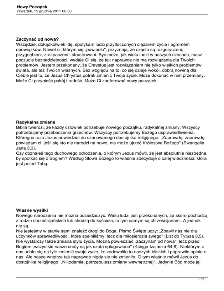 Nowy Początek czwartek, 15 grudnia 2011 00:00 Zaczynać od nowa? Wszędzie, dokądkolwiek idę, spotykam ludzi przytłoczonych ciężarem życia i ogromem obowiązków. Nawet ci, którym się „powiodło", przyznają, że często są rozgoryczeni, przygnębieni, zrozpaczeni i sfrustrowani. Być może, jak wielu ludzi w naszych czasach, masz poczucie beznadziejności, wydaje Ci się, że tak naprawdę nie ma rozwiązania dla Twoich problemów. Jestem przekonany, że Chrystus jest rozwiązaniem nie tylko wielkich problemów świata, ale też Twoich własnych. Bez względu na to, co się dzieje wokół, dobrą nowiną dla Ciebie jest to, że Jezus Chrystus potrafi zmienić Twoje życie. Może dokonać w nim przemiany. Może Ci przynieść pokój i radość. Może Ci zaoferować nowy początek. Radykalna zmiana Biblia twierdzi, że każdy człowiek potrzebuje nowego początku, radykalnej zmiany. Wszyscy potrzebujemy przebaczenia grzechów. Wszyscy potrzebujemy Bożego usprawiedliwienia. Któregoś razu Jezus powiedział do szanowanego dostojnika religijnego: „Zaprawdę, zaprawdę, powiadam ci, jeśli się kto nie narodzi na nowo, nie może ujrzeć Królestwa Bożego" (Ewangelia Jana 3,3). Czy doznałeś tego duchowego odrodzenia, o którym Jezus mówił, że jest absolutnie niezbędne, by spotkać się z Bogiem? Według Słowa Bożego to właśnie zdecyduje o całej wieczności, która jest przed Tobą. Własne wysiłki Nowego narodzenia nie można odziedziczyć. Wielu ludzi jest przekonanych, że skoro pochodzą z rodzin chrześcijańskich lub chodzą do kościoła, to tym samym są chrześcijanami. A jednak nie są. Nie jesteśmy w stanie sami znaleźć drogi do Boga. Pismo Święte uczy: „Zbawił nas nie dla uczynków sprawiedliwości, które spełniliśmy, lecz dla miłosierdzia swego" (List do Tytusa 3,5). Nie wystarczy także zmiana stylu życia. Można powiedzieć „zaczynam od nowa", lecz przed Bogiem „wszystkie nasze cnoty są jak szata splugawiona" (Księga Izajasza 64,6). Niektórym z nas udało się na tyle zmienić swoje życie, że zadowoliło to naszych bliskich i poprawiło opinie o nas. Ale nasze wnętrze tak naprawdę nigdy się nie zmieniło. O tym właśnie mówił Jezus do dostojnika religijnego: „Nikodemie, potrzebujesz zmiany wewnętrznej". Jedynie Bóg może jej 1/2 Nowy Początek czwartek, 15 grudnia 2011 00:00 dokonać. Od czego zacząć? Jeśli chcesz wiedzieć, jak zacząć od nowa, oto odpowiedź ze Słowa Bożego: 1. Musisz uznać, że jesteś grzesznikiem, że złamałeś Boże prawo - tak jak wszyscy inni. Bóg mówi: „Gdyż wszyscy zgrzeszyli i pozbawieni są chwały Bożej" (List do Rzymian 3,23). 2. Musisz odwrócić się od grzechu. Jezus powiedział: „Jeśli się nie upamiętacie, wszyscy podobnie poginiecie" (Ewangelia Łukasza 13,3). 3. Musisz przyjąć Boży dar. Jego Syn, Jezus Chrystus poniósł karę za Twoje grzechy. Umarł na krzyżu i zmartwychwstał, aby zapewnić Ci Boże usprawiedliwienie. Teraz, musisz wiarą przyjąć ten dar. Biblia uczy: „Uwierz w Pana Jezusa, a będziesz zbawiony" (Dzieje Apostolskie 16,31). To jest aż tak proste. Boża obietnica Bóg obiecał, że w chwili, gdy otworzysz swoje serce przed Jezusem, jako Panem i zaufasz Mu jako swojemu Zbawicielowi, On odpuści Twoje grzechy. Ocali Twoją duszę i zapewni Ci miejsce w swym Królestwie. Jezus Chrystus, Syn Boży, obiecał: „Kto słucha słowa mego i wierzy temu, który mnie posłał, ma żywot wieczny i nie stanie przed sądem, lecz przeszedł ze śmierci do żywota" (Ewangelia Jana 5,24). Narodzenie się na nowo jest cudem. Jest tajemnicze - jak wiatr. Ale w obydwu wypadkach skutki są widoczne. Pismo Święte uczy: „Jeśli ktoś jest w Chrystusie, nowym jest stworzeniem; stare przeminęło, oto wszystko stało się nowe" (II List do Koryntian 5,17). Twoja odpowiedź Jeśli nie jesteś pewien swego narodzenia na nowo, teraz możesz to rozstrzygnąć. Boże Słowo stwierdza: „Oto teraz czas łaski, oto teraz dzień zbawienia" (II List do Koryntian 6,2). Właśnie teraz możesz przyjąć Boży dar, zatrzymując się na moment i mówiąc Bogu: Tak, potrzebuje nowego początku, l dlatego składam swoją całkowitą ufność w Jezusie Chrystusie. Wiem, że mnie zbawił, że umarł, by odebrać zapłatę za me grzechy oraz zmartwychwstał, by dać mi nowe życie. Jest to decyzja bardzo osobista i jedynie Ty możesz ją podjąć. Zrób to już teraz. Billy Graham 2/2