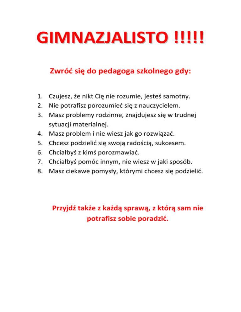 GIMNAZJALISTO !!!!! Zwróć się do pedagoga szkolnego gdy: 1. Czujesz, że nikt Cię nie rozumie, jesteś samotny. 2. Nie potrafisz porozumieć się z nauczycielem. 3. Masz problemy rodzinne, znajdujesz się w trudnej sytuacji materialnej. 4. Masz problem i nie wiesz jak go rozwiązać. 5. Chcesz podzielić się swoją radością, sukcesem. 6. Chciałbyś z kimś porozmawiać. 7. Chciałbyś pomóc innym, nie wiesz w jaki sposób. 8. Masz ciekawe pomysły, którymi chcesz się podzielić. Przyjdź także z każdą sprawą, z którą sam nie potrafisz sobie poradzić. Garść sprawdzonych rad dla uczniów w nowej szkole. Zostałeś przyjęty. Gratuluję !!! Widzisz, że nie było to trudne. Najłatwiejsze za Tobą. Teraz za to czeka Cię ciężka praca, inne przyjemności oraz moc wrażeń. 1. W pierwszym miesiącu nie dostawałeś jedynek, ale miałeś dużo klasówek sprawdzających Twoje wiadomości. Pozwoliło to nauczycielom zorientować się, co już wiesz. 2. Musisz nauczyć się uważnego słuchania i robienia notatek. Większość nauczycieli nie będzie już dyktowała. Sam powinieneś wyłapywać rzeczy najważniejsze i zapisywać je najlepiej czytelnie i w punktach. 3. Będą wymagać od Ciebie większej samodzielności i aktywności. Czeka Cię dużo więcej nauki niż w podstawówce. 4. Nie bój się pytać, jeżeli czegoś nie wiesz. Pamiętaj, że nie ma głupich pytań. 5. Ucz się systematycznie, żeby nie narobić zaległości, szybko poprawiaj jedynki. 6. Tutaj nie zaniżają ocen. To w podstawówce je zawyżali. Nie załamuj się niższymi ocenami. 7. Picie i palenie nie przysporzy Ci dobrych przyjaźni. Teraz taki szpan jest tępiony. Nie jesteś osobą gorszą od innych, żebyś w ten sposób musiał zwracać na siebie uwagę. 8. Staraj się nie spóźniać na lekcje i bądź kulturalny. Twoje zachowanie w szkole jest tak samo ważne, jak oceny. 9. Pamiętaj, że aktywność na początku zapewni Ci spokój pod koniec roku. 10. Staraj się nie zwracać na siebie uwagi, noś strój czysty, schludny, nie wyzywający. 11. Szanuj siebie, nie daj się poniżać. O pomoc zwracaj się do wychowawcy lub pedagoga. 12. Zdarza się tak, że stare przyjaźnie kończą się w gimnazjum. Nie zrażaj się tym, szukaj nowych przyjaciół. 13. Dystans między Tobą, a nauczycielem nie jest taki duży, jak Ci się wydaje. Staraj się go zrozumieć tak, jak chciałbyś żeby on zrozumiał Ciebie. Nie poddawaj się pierwszym niepowodzeniom. Nie bądź pesymistą, myśl POZYTYWNIE. JAK UNIKAĆ KONFLIKTÓW? 1. 2. 3. 4. 5. 6. Dotrzymuj złożonych obietnic. Wypełniaj swoje obowiązki. Mów prawdę. Pracuj nad swoim charakterem. Panuj nad formami wyrażania gniewu (staraj się zachowywać spokój). Zawsze szukaj porozumienia i nie odwracaj się od ludzi proponujących Ci dialog - rozmawiaj. 7. Nie żałuj swojego czasu dla innych. 8. Kiedy coś zrobiłeś lub wyrządziłeś komuś krzywdę, przyznaj się, przeproś i napraw. 9. Kiedy ktoś wyrządził Ci krzywdę, wybaczaj. 10. Nie ulegaj zniechęceniu, frustracji i poczuciu bezsensu. 11. Nie zniechęcaj się poczuciem winy z powodu własnych niepowodzeń i błędów. 12. Nie potępiaj ludzi. 13. Miej "zdrowe" poczucie humoru. Naucz się żartować z samego siebie. Co to jest stres? Stres to ,,eksploatowanie” naszego ciała wtedy, gdy dostosowujemy się do ciągle zmieniającego się otoczenia; Wywiera on na nas fizyczne i emocjonalne skutki. Może także wzbudzać w nas pozytywne, albo negatywne uczucia. Pozytywne oddziaływanie stresu może nas zmusić do działania, a rezultatem tego może być nowa świadomość i nowe ekscytujące perspektywy. Negatywny wpływ stresu może spowodować uczucie nieufności, odrzucenia, złości lub depresji, co w konsekwencji może doprowadzić do takich problemów zdrowotnych jak bóle głowy, rozstroje żołądka, wysypki, bezsenność, wrzody, wysokie ciśnienie, choroby serca, czy wylew. Wraz ze śmiercią kogoś bliskiego, narodzinami dziecka, awansem w pracy, czy nową znajomością doświadczamy stresu, ponieważ musimy na nowo poukładać nasze życie. W chwilach, w których dostosowujemy się do różnych sytuacji, stres może nam pomóc lub przeszkodzić, w zależności od tego, jak na niego reagujemy. Jak mogę wyeliminować stres z mojego życia? Pozytywny stres może dodać radości i ochoty do naszego życia, a pewna ilość stresu nawet nam dobrze służy. Terminy, współzawodnictwo, konfrontacje, a nawet nasze frustracje i smutki wzbogacają naszą egzystencję i dodają jej głębi. Naszym celem nie jest wyeliminowanie stresu, lecz nauczenie jak sobie z nim radzić, i jak go wykorzystać, by nam pomagał. Niedostateczny poziom stresu działać depresyjnie i może doprowadzić nas do stanu znudzenia lub przygnębienia; jednak z drugiej strony, nadmierny stres może wywołać w nas konfuzję. Dlatego musimy znaleźć optymalny poziom stresu, który by nas motywował, a nie przytłaczał. Skąd mam wiedzieć jaki jest dla mnie optymalny poziom stresu? Nie ma jednego, optymalnego poziomu stresu, który odpowiadałby wszystkim ludziom. Każdy człowiek to istota, która ma swoje własne i niepowtarzalne potrzeby. Tak więc, coś co dla jednego jest przykrością, dla drugiego może być zabawą. Ale jeśli nawet zgodzimy się z tym, że dana sytuacja jest przykra, to i tak nasze fizjologiczne i psychiczne reakcje prawdopodobnie będą się różnić. Osoba, która lubi rozstrzygać spory i zmieniać miejsca pracy, byłaby zestresowana mając stałą i rutynową pracę. Natomiast dla osoby, która dobrze się czuje w stabilnych okolicznościach, praca, która wymagałaby od niej różnych obowiązków, byłaby czynnikiem stresującym. Ale także nasze osobiste potrzeby stresu i jego ilości, które jesteśmy w stanie znieść zmieniają się z naszym wiekiem. Nie uzewnętrzniony stres jest przyczyną większości schorzeń. Jeśli doświadczasz symptomów stresu, oznacza to, że przekrocz