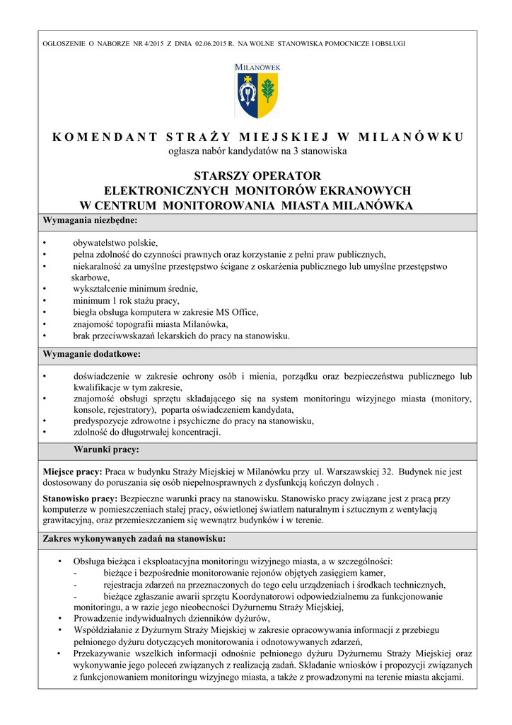 OGŁOSZENIE O NABORZE NR 4/2015 Z DNIA 02.06.2015 R. NA WOLNE STANOWISKA POMOCNICZE I OBSŁUGI KOMENDANT STRAŻY MIEJSKIEJ W MILANÓWKU ogłasza nabór kandydatów na 3 stanowiska STARSZY OPERATOR ELEKTRONICZNYCH MONITORÓW EKRANOWYCH W CENTRUM MONITOROWANIA MIASTA MILANÓWKA Wymagania niezbędne: • • • obywatelstwo polskie, pełna zdolność do czynności prawnych oraz korzystanie z pełni praw publicznych, niekaralność za umyślne przestępstwo ścigane z oskarżenia publicznego lub umyślne przestępstwo skarbowe, wykształcenie minimum średnie, minimum 1 rok stażu pracy, biegła obsługa komputera w zakresie MS Office, znajomość topografii miasta Milanówka, brak przeciwwskazań lekarskich do pracy na stanowisku. • • • • • Wymaganie dodatkowe: • doświadczenie w zakresie ochrony osób i mienia, porządku oraz bezpieczeństwa publicznego lub kwalifikacje w tym zakresie, znajomość obsługi sprzętu składającego się na system monitoringu wizyjnego miasta (monitory, konsole, rejestratory), poparta oświadczeniem kandydata, predyspozycje zdrowotne i psychiczne do pracy na stanowisku, zdolność do długotrwałej koncentracji. • • • Warunki pracy: Miejsce pracy: Praca w budynku Straży Miejskiej w Milanówku przy ul. Warszawskiej 32. Budynek nie jest dostosowany do poruszania się osób niepełnosprawnych z dysfunkcją kończyn dolnych . Stanowisko pracy: Bezpieczne warunki pracy na stanowisku. Stanowisko pracy związane jest z pracą przy komputerze w pomieszczeniach stałej pracy, oświetlonej światłem naturalnym i sztucznym z wentylacją grawitacyjną, oraz przemieszczaniem się wewnątrz budynków i w terenie. Zakres wykonywanych zadań na stanowisku: • • • • Obsługa bieżąca i eksploatacyjna monitoringu wizyjnego miasta, a w szczególności: bieżące i bezpośrednie monitorowanie rejonów objętych zasięgiem kamer, rejestracja zdarzeń na przeznaczonych do tego celu urządzeniach i środkach technicznych, bieżące zgłaszanie awarii sprzętu Koordynatorowi odpowiedzialnemu za funkcjonowanie monitoringu, a w razie jego nieobecności Dyżurnemu Straży Miejskiej, Prowadzenie indywidualnych dzienników dyżurów, Współdziałanie z Dyżurnym Straży Miejskiej w zakresie opracowywania informacji z przebiegu pełnionego dyżuru dotyczących monitorowania i odnotowywanych zdarzeń, Przekazywanie wszelkich informacji odnośnie pełnionego dyżuru Dyżurnemu Straży Miejskiej oraz wykonywanie jego poleceń związanych z realizacją zadań. Składanie wniosków i propozycji związanych z funkcjonowaniem monitoringu wizyjnego miasta, a także z prowadzonymi na terenie miasta akcjami. Wymagane dokumenty i oświadczenia • • • • • • • • CV lub kwestionariusz osobowy, list motywacyjny *, kopie dokumentów potwierdzających wykształcenie, kopie dokumentów potwierdzających doświadczenie zawodowe, kopie dokumentów potwierdzających posiadanie dodatkowych kwalifikacji i uprawnień zawodowych, kopia dokumentu potwierdzającego obywatelstwo polskie, kopie posiadanych referencji lub opinii, zaświadczenie lekarskie o braku przeciwwskazań zdrowotnych kandydata do wykonywania pracy na stanowisku operatora elektronicznych monitorów ekranowych, oświadczenie kandydata o pełnej zdolności do czynności prawnych i korzystaniu z pełni praw publicznych oraz o braku skazania prawomocnym wyrokiem sądu za umyślne przestępstwo ścigane z oskarżenia publicznego lub umyślne przestępstwo skarbowe*, • oświadczenie kandydata o wyrażeniu zgody na przetwarzanie danych osobowych do celów rekrutacji w tym publikacje danych osobowych (imię i nazwisko, miejscowość zamieszkania) w Biuletynie Informacji Publicznej na etapie wstępnej i końcowej weryfikacji kandydatów*, • oświadczenie o uregulowanym stosunku do służby wojskowej wraz z kserokopią wpisu do książeczki wojskowej (dotyczy mężczyzn). * druki kwestionariusza i oświadczeń są do pobrania na stronie www.bip.milanowek.pl Zatrudnienie planowane Od czerwca 2015 r. w pełnym wymiarze czasu pracy, umowa o pracę na czas określony do 12 miesięcy, z możliwością zawarcia kolejnej umowy na czas określony lub na czas nieokreślony. Termin składania ofert Wymagane dokumenty aplikacyjne należy składać w zaklejonych kopertach: osobiście w siedzibie Straży Miejskiej w Milanówku, ul. Warszawska 32 lub pocztą na adres: Straż Miejska, ul. Warszawska 32, 05-822 Milanówek z dopiskiem: „OFERTA NR 4/2015” i podanym numerem telefonu kontaktowego w terminie do dnia 12 czerwca 2015 r . do godz. 16.00 Rozpatrywane będą tylko kompletne oferty, które wpłyną do podanego terminu. Aplikacje, które wpłyną do Straży Miejskiej po wyżej określonym terminie nie będą rozpatrywane. Informacja o wyniku naboru będzie umieszczona na stronie internetowej Biuletynu Informacji Publicznej /www.bip.milanowek.pl/ oraz na tablicy informacyjnej w budynku Straży Miejskiej, przy ul. Warszawskiej 32 w Milanówku. Dodatkowe informacje: W miesiącu poprzedzającym datę upublicznienia ogłoszenia wskaźnik zatrudnienia osób niepełnosprawnych w Straży Miejskiej w Milanówku, w rozumieniu przepisów o rehabilitacji zawodowej i społecznej oraz zatrudnieniu osób niepełnosprawnych, był niższy niż 6%. Z kandydatami zostanie przeprowadzona rozmowa kwalifikacyjna. Złożonych i niewykorzystanych w procesie rekrutacji dokumentów Straż Miejska nie odsyła. Kandydat może je odebrać w budynku Straży Miejskiej w Milanówku po zakończeniu procesu rekrutacji. Nieodebrane dokumenty aplikacyjne osób nie zakwalifikowanych zostaną komisyjnie zniszczone. Komendant Straży Miejskiej /-/ Bohdan Okniński