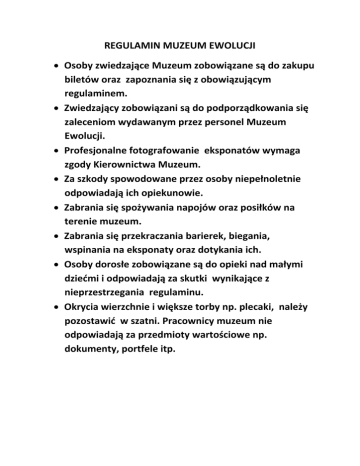 REGULAMIN MUZEUM EWOLUCJI • Osoby zwiedzające Muzeum zobowiązane są do zakupu biletów oraz zapoznania się z obowiązującym regulaminem. • Zwiedzający zobowiązani są do podporządkowania się zaleceniom wydawanym przez personel Muzeum Ewolucji. • Profesjonalne fotografowanie eksponatów wymaga zgody Kierownictwa Muzeum. • Za szkody spowodowane przez osoby niepełnoletnie odpowiadają ich opiekunowie. • Zabrania się spożywania napojów oraz posiłków na terenie muzeum. • Zabrania się przekraczania barierek, biegania, wspinania na eksponaty oraz dotykania ich. • Osoby dorosłe zobowiązane są do opieki nad małymi dziećmi i odpowiadają za skutki wynikające z nieprzestrzegania regulaminu. • Okrycia wierzchnie i większe torby np. plecaki, należy pozostawić w szatni. Pracownicy muzeum nie odpowiadają za przedmioty wartościowe np. dokumenty, portfele itp.