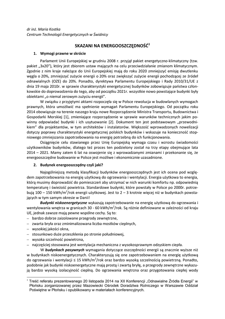 dr inż. Maria Kostka Centrum Technologii Energetycznych w Świdnicy SKAZANI NA ENERGOOSZCZĘDNOŚĆ1 1. Wymogi prawne w skrócie Parlament Unii Europejskiej w grudniu 2008 r. przyjął pakiet energetyczno-klimatyczny (tzw. pakiet „3x20”), który jest zbiorem ustaw mających na celu przeciwdziałanie zmianom klimatycznym. Zgodnie z nim kraje należące do Unii Europejskiej mają do roku 2020 zmniejszyć emisję dwutlenku węgla o 20%, zmniejszyć zużycie energii o 20% oraz zwiększyć zużycie energii pochodzącej ze źródeł odnawialnych (OZE) do 20%. Ponadto, dyrektywa Parlamentu Europejskiego i Rady 2010/31/UE z dnia 19 maja 2010r. w sprawie charakterystyki energetycznej budynków zobowiązuje państwa członkowskie do doprowadzenia do tego, aby od początku 2021r. wszystkie nowo powstające budynki były obiektami „o niemal zerowym zużyciu energii”. W związku z przyjętymi aktami rozpoczęła się w Polsce rewolucja w budowlanych wymogach prawnych, która umożliwić ma spełnienie wymagań Parlamentu Europejskiego. Od początku roku 2014 obowiązuje na terenie naszego kraju nowe Rozporządzenie Ministra Transportu, Budownictwa i Gospodarki Morskiej [1], zmieniające rozporządzenie w sprawie warunków technicznych jakim powinny odpowiadać budynki i ich usytuowanie [2]. Dokument ten jest podstawowym „przewodnikiem” dla projektantów, w tym architektów i instalatorów. Większość wprowadzonych nowelizacji dotyczy poprawy charakterystyki energetycznej polskich budynków i wskazuje na konieczność stopniowego zmniejszania zapotrzebowania na energię potrzebną do ich funkcjonowania. Osiągnięcie celu stawianego przez Unię Europejską wymaga czasu i wzrostu świadomości użytkowników budynków, dlatego też proces ten podzielony został na trzy etapy obejmujące lata 2014 – 2021. Mamy zatem 6 lat na oswojenie się z wprowadzanymi zmianami i przekonanie się, że energooszczędne budowanie w Polsce jest możliwe i ekonomicznie uzasadnione. 2. Budynek energooszczędny czyli jaki? Najogólniejszą metodą klasyfikacji budynków energooszczędnych jest ich ocena pod względem zapotrzebowania na energię użytkową do ogrzewania i wentylacji. Energia użytkowa to energia, którą musimy doprowadzić do pomieszczeń aby utrzymać w nich warunki komfortu np. odpowiednią temperaturę i świeżość powietrza. Standardowe budynki, które powstały w Polsce po 2000r. potrzebują 100 – 150 kWh/m2/rok energii użytkowej. Jest to 2 – 3 krotnie więcej niż w budynkach powstających w tym samym okresie w Danii! Budynki niskoenergetyczne wykazują zapotrzebowanie na energię użytkową do ogrzewania i wentylowania wnętrza w granicach 30 - 60 kWh/m2/rok. Są różnie definiowane w zależności od kraju UE, jednak zawsze mają pewne wspólne cechy. Są to: bardzo dobrze zaizolowane przegrody zewnętrzne, zwarta bryła oraz zminimalizowana liczba mostków cieplnych, wysokiej jakości okna, stosunkowo duże przeszklenia po stronie południowej, wysoka szczelność powietrzna, najczęściej stosowana jest wentylacja mechaniczna z wysokosprawnym odzyskiem ciepła. W budynkach pasywnych wymagania dotyczące oszczędności energii są znacznie wyższe niż w budynkach niskoenergetycznych. Charakteryzują się one zapotrzebowaniem na energię użytkową do ogrzewania i wentylacji ≤ 15 kWh/m2/rok oraz bardzo wysoką szczelnością powietrzną. Ponadto, podobnie jak budynki niskoenergetyczne mają prostą i zwartą bryłę, a przegrody zewnętrzne wykazują bardzo wysoką izolacyjność cieplną. Do ogrzewania wnętrzna oraz przygotowania ciepłej wody 1 Treść referatu prezentowanego 20 listopada 2014 na XII Konferencji „Odnawialne Źródła Energii” w Płońsku zorganizowanej przez Mazowiecki Ośrodek Doradztwa Rolniczego w Warszawie Oddział Poświętne w Płońsku i opublikowany w materiałach konferencyjnych. wykorzystują energię słoneczną, a obowiązkowym wyposażeniem jest instalacja wentylacji mechanicznej z wysokosprawnym odzyskiem ciepła. Szczególnym przypadkiem budynków energooszczędnych są budynki zeroenergetyczne, zwane też budynkami zerowej energii netto (ZNE, NZEB). Są to budynki wykorzystujące lokalnie dostępne źródła energii odnawialnej do produkcji energii cieplnej i elektrycznej. Dzięki wykorzystaniu np. energii słonecznej, energii gruntu i wiatru oraz przy jednoczesnym zmniejszeniu potrzeb energetycznych budynku, możliwe jest uzyskanie takiej ilości energii, która w bilansie rocznym pokrywać będzie ilość energii zużytej. Obiekty w których ilość energii uzyskanej z OZE przewyższa w bilansie rocznym ich potrzeby energetyczne nazywane są budynkami plusenergetycznymi lub dodatnimi energetycznie. Budynki zero- i plusenergetyczne mogą być w pełni autonomiczne, jednak często podłączone są do zewnętrznych sieci energetycznych. Wynika to z faktu nierównomiernej dostępności energii pochodzącej ze OZE w ciągu roku np. ilość energii słonecznej docierającej w zimie do powierzchni Polski jest ok. 10-krotnie mniejsza niż w lecie. Uzyskanie bezpośrednio ze źródeł odnawialnych ilości energii niezbędnej w każdym momencie dla budynku byłoby zatem niezmiernie trudne. Z tego powodu energia musi być uzyskiwana w znacznych ilościach w momentach jej dostępności, a następnie magazynowana do chwili wystąpienia jej deficytu. Możliwe jest również odsprzedawanie energii do sieci zewnętrznych w momencie jej nadprodukcji oraz jej kupowanie w okresie niedostatku. BUDYNEK ENERGOOSZCZĘDNY 4. MĄDRA EKSPLOATACJA I MONITORING 3. AKTYWNE POZYSKIWANIE ENERGII Z OZE 2. PASYWNE POZYSKIWANIE ENERGII SŁONECZNEJ (architektura słoneczna) 1. ZMNIEJSZENIE STRAT CIEPŁA ORAZ ZUŻYCIA ENERGII ELEKTRYCZNEJ Rys.1 Droga do energooszczędności 3. Jaką energię mogę uzyskać? Najczęściej wykorzystywaną i powszechnie dostępną w Polsce energią odnawialną jest energia słoneczna. Dość dużą popularnością cieszy się również