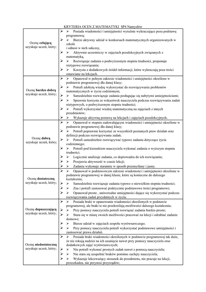 KRYTERIA OCEN Z MATEMATYKI SP4 Namysłów Posiada wiadomości i umiejętności wyraźnie wykraczające poza podstawę programową; Bierze aktywny udział w konkursach matematycznych organizowanych w szkole i odnosi w nich sukcesy, Aktywnie uczestniczy w zajęciach pozalekcyjnych związanych z matematyką, Rozwiązuje zadania o podwyższonym stopniu trudności, proponuje nietypowe rozwiązania; Korzysta z dodatkowych źródeł informacji, które wykraczają poza treści omawiane na lekcjach. Opanował w pełnym zakresie wiadomości i umiejętności określone w podstawie programowej dla danej klasy; Potrafi zdobytą wiedzę wykorzystać do rozwiązywania problemów matematycznych w życiu codziennym; Samodzielnie rozwiązuje zadania posługując się nabytymi umiejętnościami; Sprawnie korzysta ze wskazówek nauczyciela podczas rozwiązywania zadań nietypowych, o podwyższonym stopniu trudności; Potrafi wykorzystać wiedzę matematyczną na zajęciach z innych przedmiotów; Wykazuje aktywną postawę na lekcjach i zajęciach pozalekcyjnych. Opanował w stopniu zadowalającym wiadomości i umiejętności określone w podstawie programowej dla danej klasy; Potrafi poprawnie korzystać ze wszystkich poznanych praw działań oraz definicji podczas rozwiązywania zadań; Potrafi samodzielnie rozwiązywać typowe zadania dotyczące życia codziennego; Potrafi pod kierunkiem nauczyciela wykonać zadania o wyższym stopniu trudności; Logicznie analizuje zadania, co doprowadza do ich rozwiązania; Przejawia aktywność w czasie lekcji; Zadania wykonuje starannie w sposób przemyślany i jasny. Opanował w podstawowym zakresie wiadomości i umiejętności określone w podstawie programowej w danej klasie, które są konieczne do dalszego kształcenia; Samodzielnie rozwiązuje zadania typowe o niewielkim stopniu trudności; Zna i potrafi zastosować praktycznie podstawowe treści programowe; Opanował proste , uniwersalne umiejętności dające się wykorzystać podczas rozwiązywania zadań przydatnych w życiu. Posiada braki w opanowaniu wiadomości określonych w podstawie programowej, ale braki te nie przekreślają możliwości dalszego kształcenia; Przy pomocy nauczyciela potrafi rozwiązać zadania bardzo proste; Stara się w miarę swoich możliwości pracować na lekcji i odrabiać zadanie domowe; Bierze udział w zajęciach zespołu wyrównawczego; Przy pomocy nauczyciela potrafi wykorzystać podstawowe umiejętności i zastosować prawa działań. Posiada braki wiadomości określonych w podstawie programowej tak duże, że nie rokują nadziei na ich usunięcie nawet przy pomocy nauczyciela oraz dodatkowych zajęć wyrównawczych; Nie potrafi wykonać prostych zadań nawet z pomocą nauczyciela; Nie stara się uzupełnić braków pomimo zachęty nauczyciela; Wykazuje lekceważący stosunek do przedmiotu, nie pracuje na lekcji, przeszkadza, nie przynosi przyrządów; Ocenę celującą uzyskuje uczeń, który: Ocenę bardzo dobrą uzyskuje uczeń, który; Ocenę dobrą uzyskuje uczeń, który; Ocenę dostateczną uzyskuje uczeń, który; Ocenę dopuszczającą uzyskuje uczeń, który; Ocenę niedostateczną uzyskuje uczeń, który; Nie odrabia prac domowych. (+) „Plus” przy ocenie cząstkowej otrzymuje uczeń, który podejmuje rozsądne próby rozwiązania zadań na wyższą ocenę bez powodzenia. (-) „Minus” przy ocenie cząstkowej otrzymuje uczeń, który rozwiązując zadania na poszczególne oceny popełnia drobne, mało znaczące błędy.