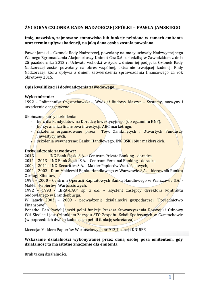 ŻYCIORYS CZŁONKA RADY NADZORCZEJ SPÓŁKI – PAWŁA JAMSKIEGO Imię, nazwisko, zajmowane stanowisko lub funkcje pełnione w ramach emitenta oraz termin upływu kadencji, na jaką dana osoba została powołana. Paweł Jamski – Członek Rady Nadzorczej, powołany na mocy uchwały Nadzwyczajnego Walnego Zgromadzenia Akcjonariuszy Unimot Gaz S.A. z siedzibą w Zawadzkiem z dnia 25 października 2013 r. Uchwała wchodzi w życie z dniem jej podjęcia. Członek Rady Nadzorczej został powołany na okres wspólnej, aktualnie trwającej kadencji Rady Nadzorczej, która upływa z dniem zatwierdzenia sprawozdania finansowego za rok obrotowy 2015. Opis kwalifikacji i doświadczenia zawodowego. Wykształcenie: 1992 – Politechnika Częstochowska - Wydział Budowy Maszyn – Systemy, maszyny i urządzenia energetyczne. Ukończone kursy i szkolenia: - kurs dla kandydatów na Doradcę Inwestycyjnego (do egzaminu KNF), - kursy: analiza finansowa inwestycji, ABC marketingu, - szkolenia organizowane przez Tow. Zamkniętych i Otwartych Funduszy Inwestycyjnych, - szkolenia wewnętrzne: Banku Handlowego, ING BSK i biur maklerskich. Doświadczenie zawodowe: 2013 – ING Bank Śląski S.A. – Centrum Private Banking - doradca 2011 – 2013 - ING Bank Śląski S.A. – Centrum Personal Banking - doradca 2004 – 2011 - ING Securities S.A. – Makler Papierów Wartościowych, 2001 – 2003 - Dom Maklerski Banku Handlowego w Warszawie S.A. – kierownik Punktu Obsługi Klientów, 1994 – 2000 - Centrum Operacji Kapitałowych Banku Handlowego w Warszawie S.A. Makler Papierów Wartościowych, 1992 – 1993 - „BRA-BAU” sp. z o.o. – asystent zastępcy dyrektora kontraktu budowlanego w Brandenburgu. W latach 2003 – 2009 - prowadzenie działalności gospodarczej "Pośrednictwo Finansowe" Ponadto, Pan Paweł Jamski pełni funkcję Prezesa Stowarzyszenia Rozwoju i Odnowy Wsi Siedlec i jest Członkiem Zarządu STO Zespołu Szkół Społecznych w Częstochowie (w poprzednich dwóch kadencjach pełnił funkcję sekretarza). Licencja: Maklera Papierów Wartościowych nr 913, licencja KNUiFE Wskazanie działalności wykonywanej przez daną osobę poza emitentem, gdy działalność ta ma istotne znaczenie dla emitenta. Brak takiej działalności. 1 Wskazanie wszystkich spółek prawa handlowego, w których, w okresie co najmniej ostatnich trzech lat, dana osoba była członkiem organów zarządzających lub nadzorczych albo wspólnikiem, ze wskazaniem, czy dana osoba nadal pełni funkcje w organach lub jest nadal wspólnikiem. Brak. Informacje na temat prawomocnych wyroków, na mocy których dana osoba została skazana za przestępstwa oszustwa w okresie co najmniej ostatnich pięciu lat oraz wskazanie, czy w okresie co najmniej ostatnich pięciu lat osoba taka otrzymała sądowy zakaz działania jako członek organów zarządzających lub nadzorczych w spółkach prawa handlowego. Brak. Szczegóły wszystkich przypadków upadłości, zarządu komisarycznego lub likwidacji, w okresie co najmniej ostatnich pięciu lat, w odniesieniu do podmiotów, w których dana osoba pełniła funkcje członka organu zarządzającego lub nadzorczego. Brak. Informacja, czy dana osoba prowadzi działalność, która jest konkurencyjna w stosunku do działalności emitenta, oraz czy jest wspólnikiem konkurencyjnej spółki cywilnej lub osobowej albo członkiem organu spółki kapitałowej lub członkiem organu jakiejkolwiek konkurencyjnej osoby prawnej. Brak takiej działalności. Informacja, czy dana osoba figuruje w rejestrze dłużników niewypłacalnych, prowadzonym na podstawie ustawy z dnia 20 sierpnia 1997 r. o Krajowym Rejestrze Sądowym. Nie figuruje. 2