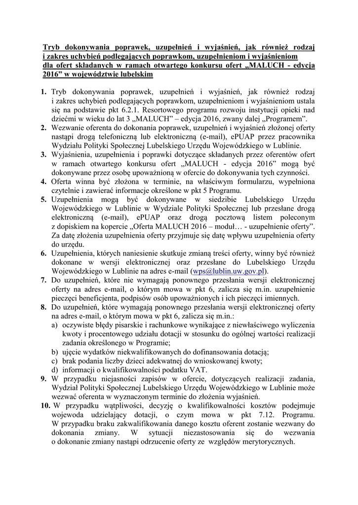 Tryb dokonywania poprawek, uzupełnień i wyjaśnień, jak również rodzaj i zakres uchybień podlegających poprawkom, uzupełnieniom i wyjaśnieniom dla ofert składanych w ramach otwartego konkursu ofert „MALUCH - edycja 2016” w województwie lubelskim 1. Tryb dokonywania poprawek, uzupełnień i wyjaśnień, jak również rodzaj i zakres uchybień podlegających poprawkom, uzupełnieniom i wyjaśnieniom ustala się na podstawie pkt 6.2.1. Resortowego programu rozwoju instytucji opieki nad dziećmi w wieku do lat 3 „MALUCH” – edycja 2016, zwany dalej „Programem”. 2. Wezwanie oferenta do dokonania poprawek, uzupełnień i wyjaśnień złożonej oferty nastąpi drogą telefoniczną lub elektroniczną (e-mail), ePUAP przez pracownika Wydziału Polityki Społecznej Lubelskiego Urzędu Wojewódzkiego w Lublinie. 3. Wyjaśnienia, uzupełnienia i poprawki dotyczące składanych przez oferentów ofert w ramach otwartego konkursu ofert „MALUCH - edycja 2016” mogą być dokonywane przez osobę upoważnioną w ofercie do dokonywania tych czynności. 4. Oferta winna być złożona w terminie, na właściwym formularzu, wypełniona czytelnie i zawierać informacje określone w pkt 5 Programu. 5. Uzupełnienia mogą być dokonywane w siedzibie Lubelskiego Urzędu Wojewódzkiego w Lublinie w Wydziale Polityki Społecznej lub przesłane drogą elektroniczną (e-mail), ePUAP oraz drogą pocztową listem poleconym z dopiskiem na kopercie „Oferta MALUCH 2016 – moduł… - uzupełnienie oferty”. Za datę złożenia uzupełnienia oferty przyjmuje się datę wpływu uzupełnienia oferty do urzędu. 6. Uzupełnienia, których naniesienie skutkuje zmianą treści oferty, winny być również dokonane w wersji elektronicznej oraz przesłane do Lubelskiego Urzędu Wojewódzkiego w Lublinie na adres e-mail ([email protected]). 7. Do uzupełnień, które nie wymagają ponownego przesłania wersji elektronicznej oferty na adres e-mail, o którym mowa w pkt 6, zalicza się m.in. uzupełnienie pieczęci beneficjenta, podpisów osób upoważnionych i ich pieczęci imiennych. 8. Do uzupełnień, które wymagają ponownego przesłania wersji elektronicznej oferty na adres e-mail, o którym mowa w pkt 6, zalicza się m.in.: a) oczywiste błędy pisarskie i rachunkowe wynikające z niewłaściwego wyliczenia kwoty i procentowego udziału dotacji w stosunku do ogólnej wartości realizacji zadania określonego w Programie; b) ujęcie wydatków niekwalifikowanych do dofinansowania dotacją; c) brak podania liczby dzieci adekwatnej do wnioskowanej kwoty; d) informacji o kwalifikowalności podatku VAT. 9. W przypadku niejasności zapisów w ofercie, dotyczących realizacji zadania, Wydział Polityki Społecznej Lubelskiego Urzędu Wojewódzkiego w Lublinie może wezwać oferenta w wyznaczonym terminie do złożenia wyjaśnień. 10. W przypadku wątpliwości, decyzję o kwalifikowalności kosztów podejmuje wojewoda udzielający dotacji, o czym mowa w pkt 7.12. Programu. W przypadku braku zakwalifikowania danego kosztu oferent zostanie wezwany do dokonania zmiany. W sytuacji niezastosowania się do wezwania o dokonanie zmiany nastąpi odrzucenie oferty ze względów merytorycznych.