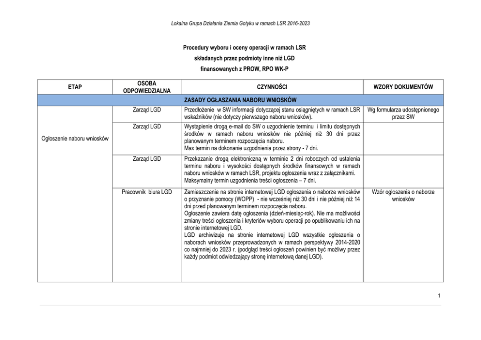 Lokalna Grupa Działania Ziemia Gotyku w ramach LSR 2016-2023 Procedury wyboru i oceny operacji w ramach LSR składanych przez podmioty inne niż LGD finansowanych z PROW, RPO WK-P ETAP OSOBA ODPOWIEDZIALNA CZYNNOŚCI WZORY DOKUMENTÓW ZASADY OGŁASZANIA NABORU WNIOSKÓW Zarząd LGD Przedłożenie w SW informacji dotyczącej stanu osiągniętych w ramach LSR wskaźników (nie dotyczy pierwszego naboru wniosków). Zarząd LGD Wystąpienie drogą e-mail do SW o uzgodnienie terminu i limitu dostępnych środków w ramach naboru wniosków nie później niż 30 dni przez planowanym terminem rozpoczęcia naboru. Max termin na dokonanie uzgodnienia przez strony - 7 dni. Zarząd LGD Przekazanie drogą elektroniczną w terminie 2 dni roboczych od ustalenia terminu naboru i wysokości dostępnych środków finansowych w ramach naboru wniosków w ramach LSR, projektu ogłoszenia wraz z załącznikami. Maksymalny termin uzgodnienia treści ogłoszenia – 7 dni. Pracownik biura LGD Zamieszczenie na stronie internetowej LGD ogłoszenia o naborze wniosków o przyznanie pomocy (WOPP) - nie wcześniej niż 30 dni i nie później niż 14 dni przed planowanym terminem rozpoczęcia naboru. Ogłoszenie zawiera datę ogłoszenia (dzień-miesiąc-rok). Nie ma możliwości zmiany treści ogłoszenia i kryteriów wyboru operacji po opublikowaniu ich na stronie internetowej LGD. LGD archiwizuje na stronie internetowej LGD wszystkie ogłoszenia o naborach wniosków przeprowadzonych w ramach perspektywy 2014-2020 co najmniej do 2023 r. (podgląd treści ogłoszeń powinien być możliwy przez każdy podmiot odwiedzający stronę internetową danej LGD). Ogłoszenie naboru wniosków Wg formularza udostępnionego przez SW Wzór ogłoszenia o naborze wniosków 1 Lokalna Grupa Działania Ziemia Gotyku w ramach LSR 2016-2023 ZASADY PRZEPROWADZANIA NABORU WNIOSKÓW Przyjęcie wniosku o przyznanie pomocy Pracownik biura LGD Przyjęcie wniosku o przyznanie pomocy w miejscu i terminie wskazanym w ogłoszeniu o naborze wniosków wraz z załącznikami oraz wersją elektroniczną (miejsce – biuro LGD). Nadanie wnioskowi indywidualnego oznaczenia (znak sprawy) i wpisanie go w polu „Potwierdzenie przyjęcia przez LGD” na wniosku. Numer ten zostaje odzwierciedlony w rejestrze prowadzonym przez LGD. Wniosek o przyznanie pomocy opieczętowuje się na pierwszej stronie, tytułem potwierdzenia przyjęcia, przy czym przedmiotowe potwierdzenie powinno zawierać następujące dane: numer konkursu data i godzina złożenia wniosku numer wniosku odnotowany w rejestrze LGD liczba załączników, złożonych wraz z WOPP podpis pracownika LGD przyjmującego wniosek Złożenie wniosku w LGD potwierdzane jest również na kopii pierwszej strony wniosku (na egzemplarzu Wnioskodawcy). Wzór rejestru wniosków o przyznanie pomocy OCENA WSTĘPNA WNIOSKU Badanie wymogów formalnych Pracownik biura LGD, opiekun procesu Badanie wymogów formalnych dokonywane jest na bieżąco w czasie wpływania wniosków wraz z załącznikami. Pracownik LGD dokonuje Badania wymogów formalnych wniosków w zakresie: 1. złożenia wniosku w miejscu i terminie wskazanym w ogłoszeniu o naborze, 2. zgodności operacji z zakresem tematycznym, który został wskazany w ogłoszeniu o naborze, czy operacja realizuje cele główne, szczegółowe i czy jest zgodna z Programem, 3. zgodności operacji z formą wsparcia wskazaną w ogłoszeniu o naborze 4. spełnienia dodatkowych warunków udzielenia wsparcia obowiązujących w ramach naboru. Po dokonaniu badania wymogów formalnych wnioski przekazywane są na posiedzenie Rady. Wzór KARTA WERYFIKACJI WNIOSKU O PRZYZNANIE POMOCY 2 Lokalna Grupa Działania Ziemia Gotyku w ramach LSR 2016-2023 Weryfikacja zgodności operacji z LSR i Programem Pracownik biura LGD, opiekun procesu Wnioski nie spełniające wymogów formalnych nie podlegają ocenie zgodności z LSR i Programem. Zostaje to odnotowane na karcie weryfikacji wniosku i przekazane pismem do Przewodniczącego Rady LGD. Pracownicy biura LGD weryfikują wnioski pod katem zgodności z LSR, w tym zgodności z Programem przy zastosowaniu karty weryfikacji punktów kontrolnych i kryteriów horyzontalnych właściwych dla poszczególnych Programów na wzorach dokumentów wskazanych przez SW i MRiRW. Wynik weryfikacji jest przekazywany członkom Rady na posiedzeniu. ZASADY PRZEPROWADZANIA OCENY ZGODNOŚCI OPERACJI Z LSR, W TYM Z PROGRAMEM ORAZ WYBORU OPERACJI DO FINANSOWANIA (Po zakończeniu naboru wniosków o przyznanie pomocy, ale nie później niż 45 dni od dnia następującego po ostatnim dniu terminu składania wniosków) Informacja o posiedzeniu Rady Zarząd LGD w porozumieniu z Przewodniczącym Rady (lub w zastępstwie Wiceprzewodniczący Rady) Wyznaczenie terminu i miejsca posiedzenia Rady w porozumieniu z Zarządem LGD. Zawiadomienie o terminie, miejscu i porządku posiedzenia Rady podaje się do publicznej wiadomości co najmniej 7 dni kalendarzowych przed wyznaczonym terminem posiedzenia. Informacja w powyższym zakresie publikowana jest na stronie internetowej LGD oraz na tablicy ogłoszeń w siedzibie LGD. Pracownik biura LGD Przygotowanie zawiadomień o posiedzeniu organu decyzyjnego wraz z informacją dotyczącą możliwości zapoznania się z materiałami i dokumentami związanymi z porządkiem posiedzenia, w tym z wnioskami o przyznanie pomocy, które będą rozpatrywane podczas posiedzenia. Podpisanie zawiadomień o posiedzeniu Rady Przewodniczący Rady (lub w zastępstwie Wiceprzewodniczący Rady) Pracownik biura LGD Wzór zawiadomienia o posiedzeniu Rady Rozesłanie zawiadomień o posiedzeniu organu decyzyjnego najpóźniej na 7 dni kalendarzowych przed terminem posiedzenia, przy czym dopuszcza się możliwość powiadomienia za pomocą poczty elektronicznej – wymagana jest w takim przypadku zwrotna informacja o uczestniczeniu lub nie uczestniczeniu Członka Rady w posiedzeniu. Dodatkowo LGD przesyła informację do SW o terminie posiedzenia. 3 Lokalna