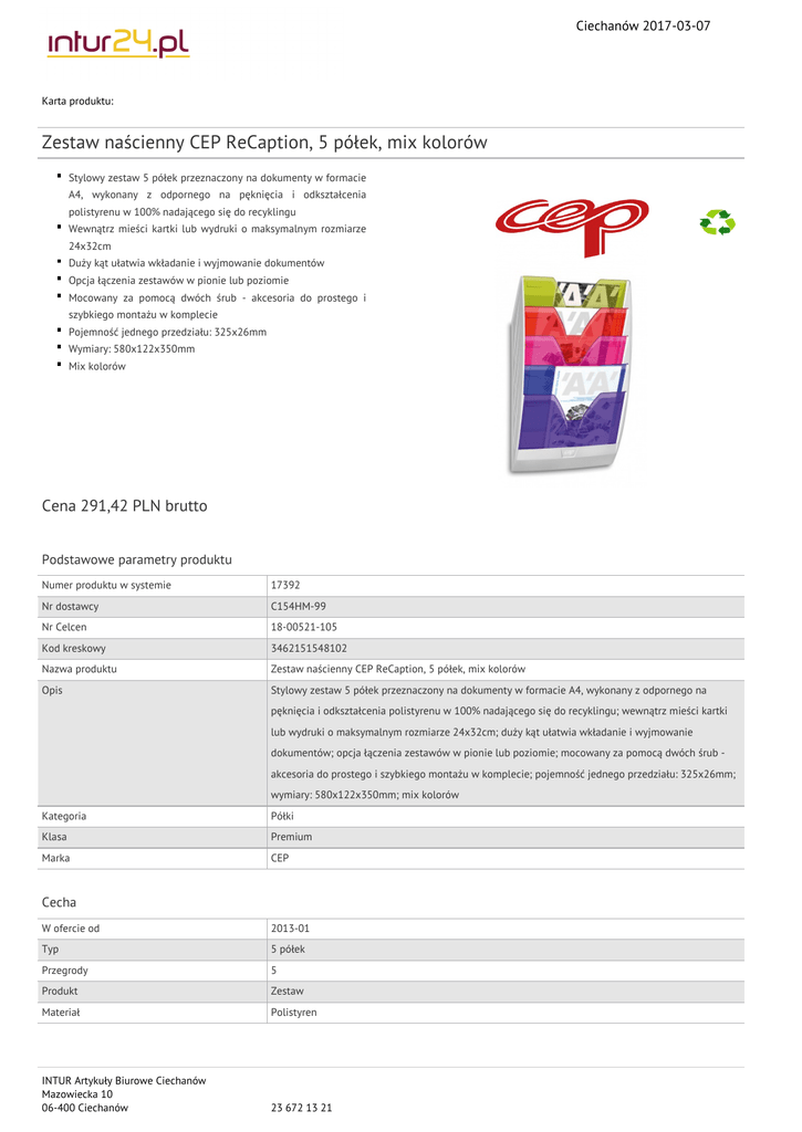 Ciechanów 2017-03-07 Karta produktu: Zestaw naścienny CEP ReCaption, 5 półek, mix kolorów Stylowy zestaw 5 półek przeznaczony na dokumenty w formacie A4, wykonany z odpornego na pęknięcia i odkształcenia polistyrenu w 100% nadającego się do recyklingu Wewnątrz mieści kartki lub wydruki o maksymalnym rozmiarze 24x32cm Duży kąt ułatwia wkładanie i wyjmowanie dokumentów Opcja łączenia zestawów w pionie lub poziomie Mocowany za pomocą dwóch śrub - akcesoria do prostego i szybkiego montażu w komplecie Pojemność jednego przedziału: 325x26mm Wymiary: 580x122x350mm Mix kolorów Cena 291,42 PLN brutto Podstawowe parametry produktu Numer produktu w systemie 17392 Nr dostawcy C154HM-99 Nr Celcen 18-00521-105 Kod kreskowy 3462151548102 Nazwa produktu Zestaw naścienny CEP ReCaption, 5 półek, mix kolorów Opis Stylowy zestaw 5 półek przeznaczony na dokumenty w formacie A4, wykonany z odpornego na pęknięcia i odkształcenia polistyrenu w 100% nadającego się do recyklingu; wewnątrz mieści kartki lub wydruki o maksymalnym rozmiarze 24x32cm; duży kąt ułatwia wkładanie i wyjmowanie dokumentów; opcja łączenia zestawów w pionie lub poziomie; mocowany za pomocą dwóch śrub akcesoria do prostego i szybkiego montażu w komplecie; pojemność jednego przedziału: 325x26mm; wymiary: 580x122x350mm; mix kolorów Kategoria Półki Klasa Premium Marka CEP Cecha W ofercie od 2013-01 Typ 5 półek Przegrody 5 Produkt Zestaw Materiał Polistyren INTUR Artykuły Biurowe Ciechanów Mazowiecka 10 06-400 Ciechanów 23 672 13 21 Ciechanów 2017-03-07 Karta katalogowa produktu cd. Zestaw naścienny CEP ReCaption, 5 półek, mix kolorów Wymiary Format A4 Rozmiar 5 półek Pojemność (mm) 5x26 Wymiary (mm) 580x350x122 Wspólny słownik zamówień CPV 30193300-1 Organizatory wiszące Certyfikaty Nowy produkt w ofercie Standard Hit Standard Kolor Kolor Mix kolorów Serdecznie zapraszamy do współpracy INTUR Artykuły Biurowe Ciechanów zespół. INTUR Artykuły Biurowe Ciechanów Mazowiecka 10 06-400 Ciechanów 23 672 13 21