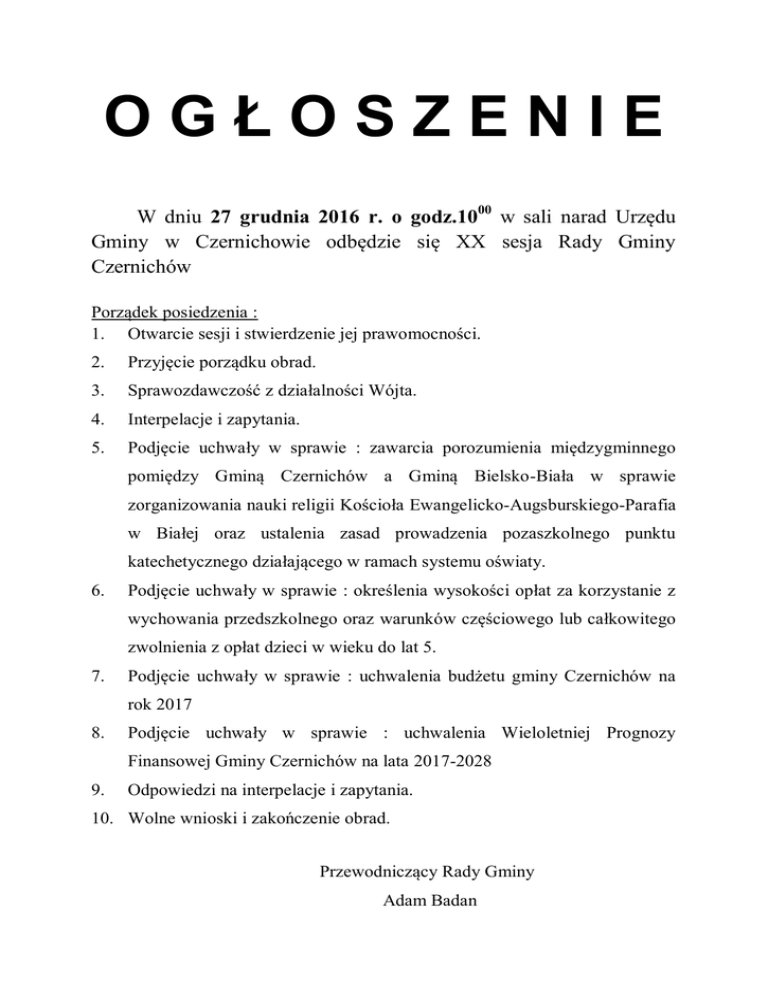 OGŁOSZENIE W dniu 27 grudnia 2016 r. o godz.1000 w sali narad Urzędu Gminy w Czernichowie odbędzie się XX sesja Rady Gminy Czernichów Porządek posiedzenia : 1. Otwarcie sesji i stwierdzenie jej prawomocności. 2. Przyjęcie porządku obrad. 3. Sprawozdawczość z działalności Wójta. 4. Interpelacje i zapytania. 5. Podjęcie uchwały w sprawie : zawarcia porozumienia międzygminnego pomiędzy Gminą Czernichów a Gminą Bielsko-Biała w sprawie zorganizowania nauki religii Kościoła Ewangelicko-Augsburskiego-Parafia w Białej oraz ustalenia zasad prowadzenia pozaszkolnego punktu katechetycznego działającego w ramach systemu oświaty. 6. Podjęcie uchwały w sprawie : określenia wysokości opłat za korzystanie z wychowania przedszkolnego oraz warunków częściowego lub całkowitego zwolnienia z opłat dzieci w wieku do lat 5. 7. Podjęcie uchwały w sprawie : uchwalenia budżetu gminy Czernichów na rok 2017 8. Podjęcie uchwały w sprawie : uchwalenia Wieloletniej Prognozy Finansowej Gminy Czernichów na lata 2017-2028 9. Odpowiedzi na interpelacje i zapytania. 10. Wolne wnioski i zakończenie obrad. Przewodniczący Rady Gminy Adam Badan