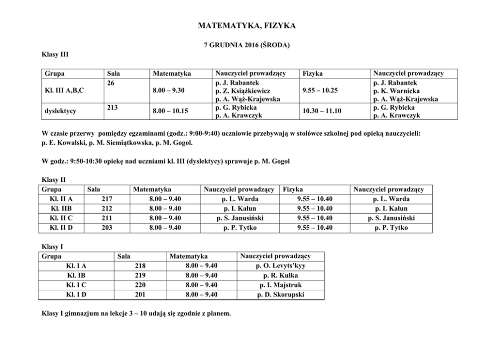 MATEMATYKA, FIZYKA 7 GRUDNIA 2016 (ŚRODA) Klasy III Grupa Sala 26 Matematyka 213 8.00 – 10.15 8.00 – 9.30 Kl. III A,B,C dyslektycy Nauczyciel prowadzący p. J. Rabantek p. Z. Książkiewicz p. A. Wąż-Krajewska p. G. Rybicka p. A. Krawczyk Fizyka 9.55 – 10.25 10.30 – 11.10 Nauczyciel prowadzący p. J. Rabantek p. K. Warnicka p. A. Wąż-Krajewska p. G. Rybicka p. A. Krawczyk W czasie przerwy pomiędzy egzaminami (godz.: 9:00-9:40) uczniowie przebywają w stołówce szkolnej pod opieką nauczycieli: p. E. Kowalski, p. M. Siemiątkowska, p. M. Gogol. W godz.: 9:50-10:30 opiekę nad uczniami kl. III (dyslektycy) sprawuje p. M. Gogol Klasy II Grupa Kl. II A Kl. IIB Kl. II C Kl. II D Klasy I Grupa Sala Matematyka 8.00 – 9.40 8.00 – 9.40 8.00 – 9.40 8.00 – 9.40 217 212 211 203 Sala Kl. I A Kl. IB Kl. I C Kl. I D 218 219 220 201 Nauczyciel prowadzący p. L. Warda p. I. Kałun p. S. Janusiński p. P. Tytko Matematyka 8.00 – 9.40 8.00 – 9.40 8.00 – 9.40 8.00 – 9.40 Klasy I gimnazjum na lekcje 3 – 10 udają się zgodnie z planem. Fizyka 9.55 – 10.40 9.55 – 10.40 9.55 – 10.40 9.55 – 10.40 Nauczyciel prowadzący p. O. Levyts’kyy p. R. Kulka p. I. Majstruk p. D. Skorupski Nauczyciel prowadzący p. L. Warda p. I. Kałun p. S. Janusiński p. P. Tytko Klasy II i III gimnazjum na lekcje 4 – 10 udają się zgodnie z planem. Uczniowie SP i G w czasie trwania testów semestralnych wchodzą na II piętro tylko pod opieką nauczyciela. Zmiany w planie lekcji SP 31 G 125 3 l. - kl. 5c (muzyka p. M. Gogol) – s. 201 3 l. – kl. 1C edukacja zdrowotna p. E. Kowalski – s. 220 3 l. – kl. 1B edukacja zdrowotna p. L. Warda – s. 218 4 l. – kl. I A 1 grupa j. angielski p. O. Levytskyy – s. 06 4 l. - kl. II C matematyka p. J. Rabantek s. – 201 Zastępstwa: za p. J. Rabantek: 3 l. – 1 A - biologia - p. I. Majstruk s. 219 BIOLOGIA, CHEMIA, GEOGRAFIA 8 GRUDNIA 2016 (CZWARTEK) Klasy III Grupa Kl. III A,B,C dyslektycy Sala BIOLOGIA, CHEMIA, GEOGRAFIA 26 8.00 – 9.30 213 8.00 – 9.50 Nauczyciel prowadzący p. G. Rybicka p. I. Majstruk p. S. Janusiński p. M. Topolska p. A. Krawczyk Klasy II Grupa Sala Kl. II A Kl. IIB Kl. II C Kl. II D 217 212 211 218 BIOLOGIA, CHEMIA, GEOGRAFIA 8.00 – 9.45 8.00 – 9.45 8.00 – 9.45 8.00 – 9.45 Nauczyciel prowadzący p. R. Kulka p. K. Warnicka-1l, p. J. Prusiński – 2 l. p. G. Miśkowicz p. I. Kałun Klasy I - III gimnazjum na lekcje 3 – 10 udają się zgodnie z planem. Uczniowie SP i G w czasie trwania testów semestralnych wchodzą na II piętro tylko pod opieką nauczyciela.