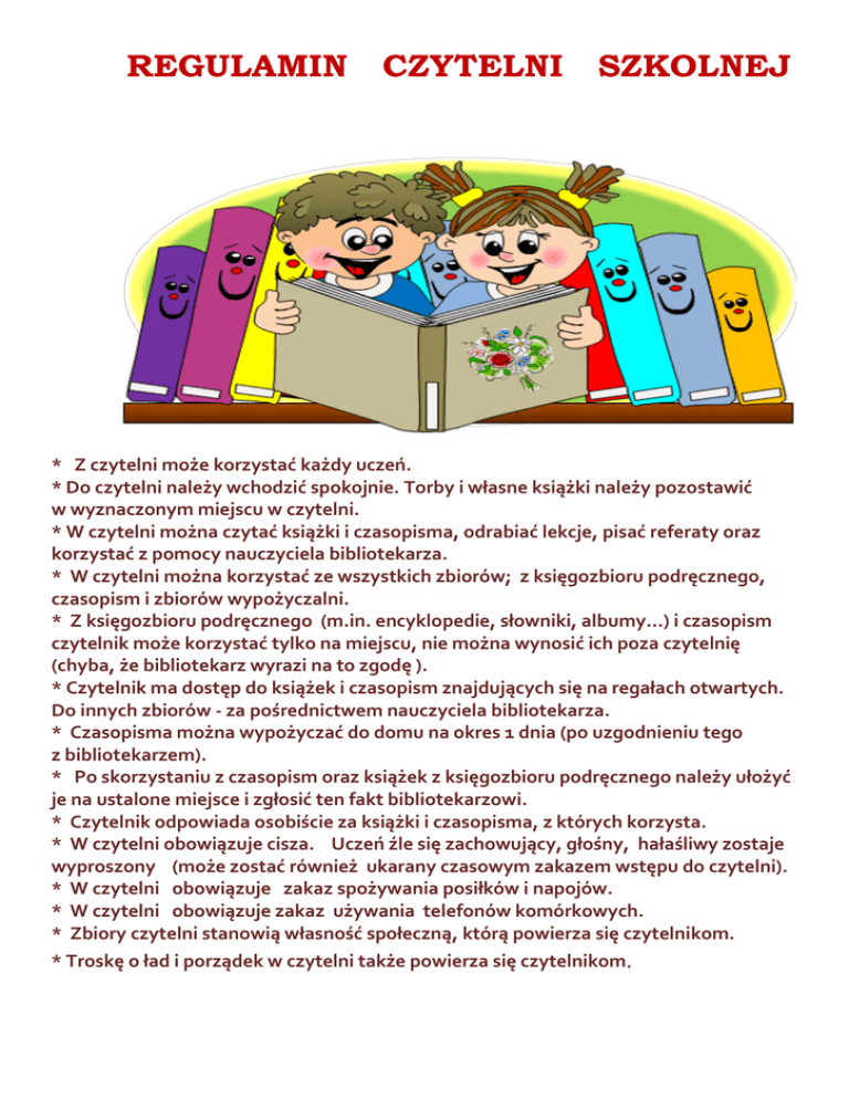 REGULAMIN CZYTELNI SZKOLNEJ * Z czytelni może korzystać każdy uczeń. * Do czytelni należy wchodzić spokojnie. Torby i własne książki należy pozostawić w wyznaczonym miejscu w czytelni. * W czytelni można czytać książki i czasopisma, odrabiać lekcje, pisać referaty oraz korzystać z pomocy nauczyciela bibliotekarza. * W czytelni można korzystać ze wszystkich zbiorów; z księgozbioru podręcznego, czasopism i zbiorów wypożyczalni. * Z księgozbioru podręcznego (m.in. encyklopedie, słowniki, albumy...) i czasopism czytelnik może korzystać tylko na miejscu, nie można wynosić ich poza czytelnię (chyba, że bibliotekarz wyrazi na to zgodę ). * Czytelnik ma dostęp do książek i czasopism znajdujących się na regałach otwartych. Do innych zbiorów - za pośrednictwem nauczyciela bibliotekarza. * Czasopisma można wypożyczać do domu na okres 1 dnia (po uzgodnieniu tego z bibliotekarzem). * Po skorzystaniu z czasopism oraz książek z księgozbioru podręcznego należy ułożyć je na ustalone miejsce i zgłosić ten fakt bibliotekarzowi. * Czytelnik odpowiada osobiście za książki i czasopisma, z których korzysta. * W czytelni obowiązuje cisza. Uczeń źle się zachowujący, głośny, hałaśliwy zostaje wyproszony (może zostać również ukarany czasowym zakazem wstępu do czytelni). * W czytelni obowiązuje zakaz spożywania posiłków i napojów. * W czytelni obowiązuje zakaz używania telefonów komórkowych. * Zbiory czytelni stanowią własność społeczną, którą powierza się czytelnikom. * Troskę o ład i porządek w czytelni także powierza się czytelnikom.