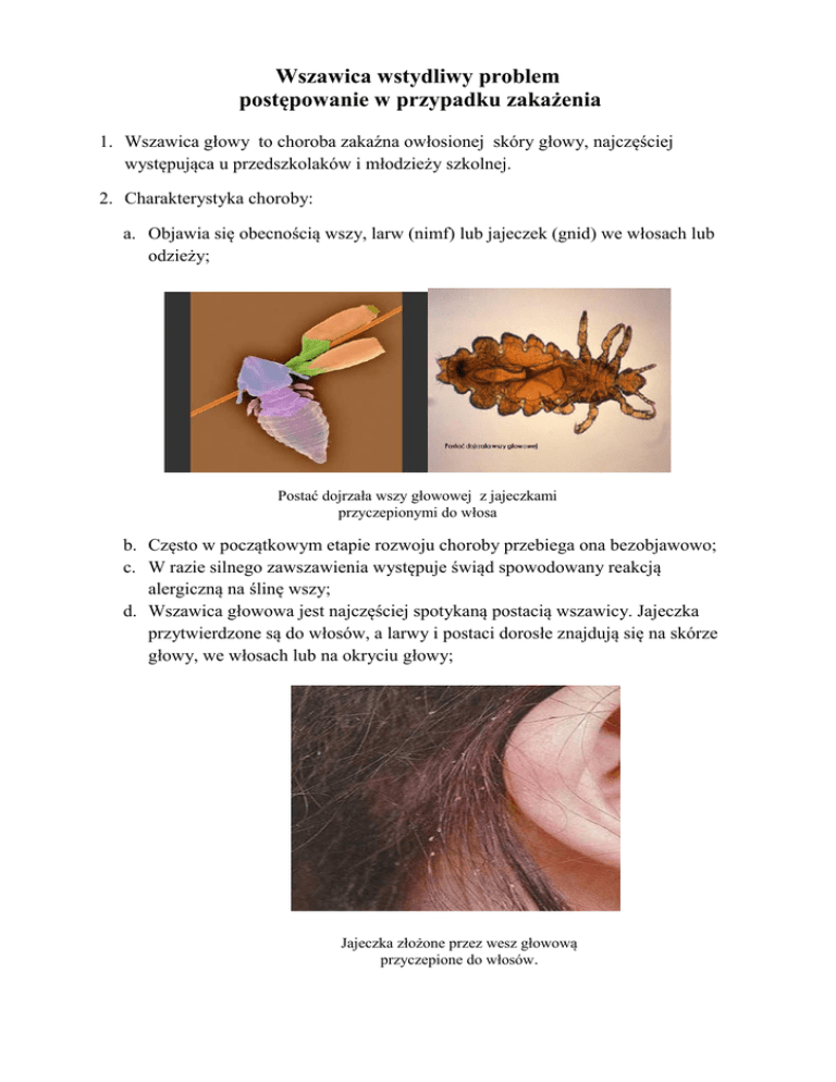 Wszawica wstydliwy problem postępowanie w przypadku zakażenia 1. Wszawica głowy to choroba zakaźna owłosionej skóry głowy, najczęściej występująca u przedszkolaków i młodzieży szkolnej. 2. Charakterystyka choroby: a. Objawia się obecnością wszy, larw (nimf) lub jajeczek (gnid) we włosach lub odzieży; Postać dojrzała wszy głowowej z jajeczkami przyczepionymi do włosa b. Często w początkowym etapie rozwoju choroby przebiega ona bezobjawowo; c. W razie silnego zawszawienia występuje świąd spowodowany reakcją alergiczną na ślinę wszy; d. Wszawica głowowa jest najczęściej spotykaną postacią wszawicy. Jajeczka przytwierdzone są do włosów, a larwy i postaci dorosłe znajdują się na skórze głowy, we włosach lub na okryciu głowy; Jajeczka złożone przez wesz głowową przyczepione do włosów. e. Okres wylegania – cykl życiowy wszy składa się z 3 stadiów: jaja, larwy (3 stadia) i postaci dorosłej. W sprzyjających warunkach cały cykl życiowy trwa około 3 tygodni. 3. Jak wykryć wszy ? Najłatwiej jest je wykryć podczas czesania włosów specjalnym grzebieniem nad białą kartką papieru; Należy czesać włosy suche i wyczesywać je stojąc pochylonym głową do dołu nad białą kartką; Jeśli niektóre „kropki” na kartce się poruszają, to z dużym prawdopodobieństwem są to wszy głowowe. 4. Jak można się zabezpieczyć przed wszami? Poświęć czas na systematyczne czesanie włosów specjalnym, gęstym grzebieniem. Czesać powinna się cała rodzina. Czym szybciej wykryje się wszy, tym szybciej się ich pozbędziemy; Włosy należy czesać bardzo dokładnie, wszy i ich jajeczka są bardzo małe i trudne do usunięcia; Nie używać cudzych czapek, grzebieni i szczotek; Unikać kontaktu z osobami zarażonymi; Sprawdzić czy ktoś z rodziny jest też zarażony; Wszystkich zarażonych w rodzinie powinno poddać się leczeniu w tym samym czasie, Przestrzegać dokładnie instrukcji stosowania leków; Należy także zastosować mycie włosów szamponem przeciwko wszom; Po uwolnieniu się od wszy, należy jeszcze czesać się specjalnym grzebieniem przez10-14 dni. Da to pewność, że zastosowana metoda leczenia była skuteczna. Systematycznie kontrolować czystość głowy i włosów dzieci przebywających w zbiorowiskach ludzi. Opracowanie: SZKOLMED M.Piejak, M.Wojciechowska Spółka jawna