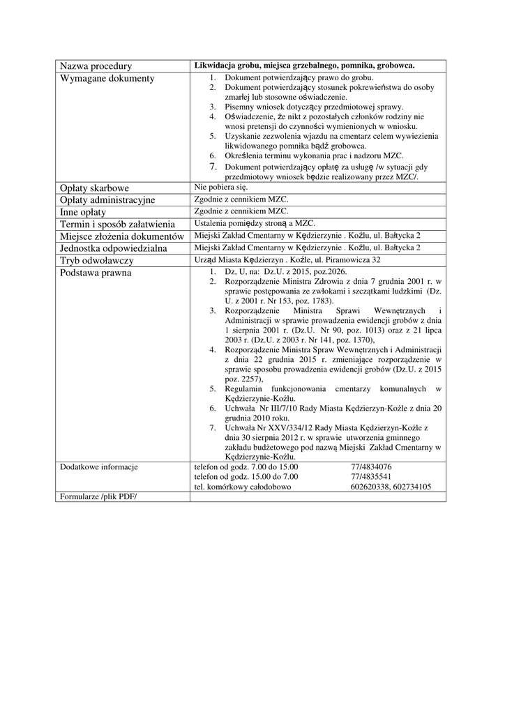 Nazwa procedury Wymagane dokumenty Opłaty skarbowe Opłaty administracyjne Inne opłaty Termin i sposób załatwienia Miejsce złożenia dokumentów Jednostka odpowiedzialna Tryb odwoławczy Podstawa prawna Dodatkowe informacje Formularze /plik PDF/ Likwidacja grobu, miejsca grzebalnego, pomnika, grobowca. 1. Dokument potwierdzający prawo do grobu. 2. Dokument potwierdzający stosunek pokrewieństwa do osoby zmarłej lub stosowne oświadczenie. 3. Pisemny wniosek dotyczący przedmiotowej sprawy. 4. Oświadczenie, że nikt z pozostałych członków rodziny nie wnosi pretensji do czynności wymienionych w wniosku. 5. Uzyskanie zezwolenia wjazdu na cmentarz celem wywiezienia likwidowanego pomnika bądź grobowca. 6. Określenia terminu wykonania prac i nadzoru MZC. 7. Dokument potwierdzający opłatę za usługę /w sytuacji gdy przedmiotowy wniosek będzie realizowany przez MZC/. Nie pobiera się. Zgodnie z cennikiem MZC. Zgodnie z cennikiem MZC. Ustalenia pomiędzy stroną a MZC. Miejski Zakład Cmentarny w Kędzierzynie . Koźlu, ul. Bałtycka 2 Miejski Zakład Cmentarny w Kędzierzynie . Koźlu, ul. Bałtycka 2 Urząd Miasta Kędzierzyn . Koźle, ul. Piramowicza 32 1. Dz, U, na: Dz.U. z 2015, poz.2026. 2. Rozporządzenie Ministra Zdrowia z dnia 7 grudnia 2001 r. w sprawie postępowania ze zwłokami i szczątkami ludzkimi (Dz. U. z 2001 r. Nr 153, poz. 1783). 3. Rozporządzenie Ministra Sprawi Wewnętrznych i Administracji w sprawie prowadzenia ewidencji grobów z dnia 1 sierpnia 2001 r. (Dz.U. Nr 90, poz. 1013) oraz z 21 lipca 2003 r. (Dz.U. z 2003 r. Nr 141, poz. 1370), 4. Rozporządzenie Ministra Spraw Wewnętrznych i Administracji z dnia 22 grudnia 2015 r. zmieniające rozporządzenie w sprawie sposobu prowadzenia ewidencji grobów (Dz.U. z 2015 poz. 2257), 5. Regulamin funkcjonowania cmentarzy komunalnych w Kędzierzynie-Koźlu. 6. Uchwała Nr III/7/10 Rady Miasta Kędzierzyn-Koźle z dnia 20 grudnia 2010 roku. 7. Uchwała Nr XXV/334/12 Rady Miasta Kędzierzyn-Koźle z dnia 30 sierpnia 2012 r. w sprawie utworzenia gminnego zakładu budżetowego pod nazwą Miejski Zakład Cmentarny w Kędzierzynie-Koźlu. telefon od godz. 7.00 do 15.00 77/4834076 telefon od godz. 15.00 do 7.00 77/4835541 tel. komórkowy całodobowo 602620338, 602734105