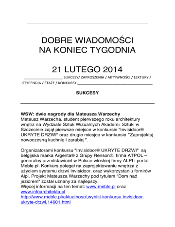 _____________________________________________________ DOBRE WIADOMOŚCI NA KONIEC TYGODNIA 21 LUTEGO 2014 ______________ SUKCESY/ ZAPROSZENIA / AKTYWNOŚCI / LEKTURY / STYPENDIA / STAŻE / KONKURSY ___________________________ SUKCESY WSW: dwie nagrody dla Mateusza Warzechy Mateusz Warzecha, student pierwszego roku architektury wnętrz na Wydziale Sztuk Wizualnych Akademii Sztuki w Szczecinie zajął pierwsze miejsce w konkursie "Invisidoor® UKRYTE DRZWI" oraz drugie miesjce w konkursie ″Zaprojektuj nowoczesną kuchnię i zarabiaj″. Organizatorami konkursu "Invisidoor® UKRYTE DRZWI" są belgijska marka Argenta® z Grupy Renson®, firma ATPOL – generalny przedstawiciel w Polsce włoskiej firmy ALPI i portal Meble.pl. Konkurs polegał na zaprojektowaniu wnętrza z użyciem systemu drzwi Invisidoor, oraz wykorzystaniu fornirów Alpi. Projekt Mateusza Warzechy pod tytułem "Dom nad jeziorem" został uznany za najlepszy. Więcej informacji na ten temat: www.meble.pl oraz www.infoarchitekta.pl http://www.meble.pl/aktualnosci,wyniki-konkursu-invisidoorukryte-drzwi,14601.html http://www.infoarchitekta.pl/artykuly/6-wydarzenia/7929-wynikikonkursu-invisidoor-ukryte-drzwi.html Konkurs ″Zaprojektuj nowoczesną kuchnię i zarabiaj″ organizowany przez firmę meble.pl polegał na zaprojektowaniu nowoczesnego zestawu mebli do samodzielnego montażu. Mateusz Warzecha zajął drugie miejsce. Jego project zostanie wprowadzony do produkcji i sprzedaży Więcej informacji: www.meble.pl http://www.meble.pl/aktualnosci,wyniki-konkursu-zaprojektujnowoczesna-kuchnie-i-zarabiaj,14602.html Finały obu konkursów odbyły się na targach Meble Polska 2014 w Poznaniu. _____________________________________________________ WI: wyróżnieni studenci Hubert Leśniewski i Tomasz Staniszewski Hubert Leśniewski i Tomasz Staniszewski - duet studentów z klasy kameralnej wykładowcy Marka Stawniaka (Wydział Instrumentalny Akademii Sztuki w Szczecinie) otrzymał wyróżnienie na prestiżowym, ogólnopolskim konkursie akordeonowym: XX Mławski Festiwal Muzyki Akordeonowej. Hubert Leśniewski jest studentem III roku klasy klarnetu prof. Bogusława Jakubowskiego. Tomasz Staniszewski to student III roku klasy akordeonu doc. Jerzego Siemaka. W jury festiwalu - jak co roku zasiadał doc. Jerzy Siemak Dziekan Wydziału Instrumentalnego Akademii Sztuki w Szczecinie. _____________________________________________________ WSW: Nagrody dla młodych Architektów Absolwent kierunku Architektura Wnętrz na Wydziale Sztuk Wizualnych Łukasz Lebiedź otrzymał jedną z pięciu równorzędnych nagród w konkursie o Nagrodę Prezydenta Miasta Szczecin za najlepsze prace dyplomowe dotyczące Szczecina wykonane przez Absolwentów kierunków architektonicznych szczecińskich uczelni za rok akademicki 2012/2013. Promotorem pracy dyplomowej Łukasza "Biuro coworkingowe z przestrzenią ekspozycyjną w transformatorowni na Wyspie Jaskółczej w Szczecinie" jest prof. Józef Jurek z Pracowni Projektowania Architektury Wnętrz. Podczas oficjalnego wręczenia nagród były prezentowane wyróżnione prace dyplomowe oraz pozostałe zgłoszone do konkursu. Z Akademii Sztuki w Szczecinie do konkursu zgłoszono również następujące prace: autor: Agata Cieśnik promotor: prof. Henryk Regimowicz tytuł pracy dyplomowej: "McQueen Cafe" - projekt adaptacji budynku Bramy Portowej w Szczecinie autor: Bartosz Kaszuba promotor: prof. Katarzyna Radecka tytuł pracy dyplomowej: "Centrum Różnorodności Kulturowej" autor: Michał Wawrzyniak promotor: prof. Józef Jurek tytuł pracy dyplomowej: BANK PEKAO SA- Adaptacja budynku Brama Portowa II w Szczecinie autor: Karolina Wiśniewska promotor: prof. Henryk Regimowicz tytuł pracy dyplomowej: "Mr. FOX cafe". Projekt plastyczny adaptacji wnętrz na kawiarnię, na parterze kamiennicy przy pl. Hołdu Pruskiego 8 w Szczecinie Prezydent Miasta Szczecin po raz kolejny przyznał nagrody absolwentom kierunków architektonicznych szczecińskich uczelni za najlepsze prace dyplomowe dotyczące problematyki przestrzennej i architektonicznej Szczecina. Po raz pierwszy do zgłoszenia prac w konkursie zaproszono również Dziekana Wydziału Sztuk Wizualnych Akademii Sztuki w Szczecnie. Spośród 20 zgłoszonych prac jury (składające się z: Architekta Miasta, Ogrodnika Miejskiego oraz przedstawicieli: Miejskiej Komisji Urbanistyczno-Architektonicznej, Biura Planowania Przestrzennego Miasta, Wydziału Urbanistyki i Administracji Budowlanej, Biura Miejskiego Konserwatora Zabytków i Biura Strategii) wybrało pięć najlepszych . w Galerii Prezydenckiej prezentowane s ą wszystkie prace zgłoszone na konkurs (I piętro gmachu Urzędu Miasta Szczecin przy pl. Armii Krajowej 1, otwarta w godzinach pracy urzędu, tj. 7.30-15.30). Wystawa prac dyplomowych potrwa do 3 marca 2014 r. _____________________________________________________ WSW: LAHTI POSTER TRIENNIAL 2014 Wykładowcy Wydziału Sztuk Wizualnych: Agnieszka Dajczak, dr hab. Lex Drewinski, Adam Klasa oraz dr hab. Leszek Żebrowski zakwalifikowali się do LAHTI POSTER TRIENNIAL 2014. Więcej informacji: http://www.postertriennial.fi/approvedworks.php _____________________________________________________ ZAPROSZENIA/ SZCZECIN WSW: wystawa Plakatu w Alei Fontann do 15 kwietnia | Galeria w Alei Fontann | Szczecin Do 15 kwietnia w Galerii w Alei Fontann można oglądać plakaty studentów Wydziału Sztuk Wizualnych projektowane pod kierunkiem dr hab. Ireneusza Kuriaty i mgr Agaty Pełechaty. Kuratorem ekspozycji jest studentka kierunku Grafika WSW Ada Krawczak. GALERIA W ALEI FONTANN pozwala na prezentację prac zarówno wewnątrz pawilonów gastronomicznych jak i w ich witrynach. Tym samym sztuka dostępna jest dla publiczności bezpośrednio z lubianego przez mieszkańców Szczecina deptaku, a nawet dla użytkowników popularnej ścieżki rowerowej. Z kolei prace eksponowane we wnętrzach pawilonów gastronomicznych czynią z nich nie tylko przestrzeń komercyjną czy kon