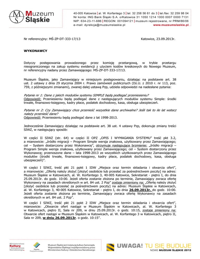 Nr referencyjny: MŚ-ZP-DT-333-17/13 Katowice, 23.09.2013r. WYKONAWCY Dotyczy postępowania prowadzonego przez komisję przetargową, w trybie przetargu nieograniczonego na zakup systemu ewidencji z użyciem kodów kreskowych do Nowego Muzeum, nr referencyjny nadany przez Zamawiającego: MŚ-ZP-DT-333-17/13. Muzeum Śląskie, jako Zamawiający w niniejszym postępowaniu, działając na podstawie art. 38 ust. 2 ustawy z dnia 29 stycznia 2004 r. Prawo zamówień publicznych (Dz.U. z 2010 r. nr 113, poz. 759, z późniejszymi zmianami), zwanej dalej ustawą Pzp, udziela odpowiedzi na nadesłane pytania: Pytanie nr 1: Dane z jakich modułów systemu SIMPLE będą podlegać przeniesieniu? Odpowiedź: Przeniesieniu będą podlegać dane z następujących modułów systemu Simple: środki trwałe, finansowo-księgowy, kadry płace, podatek dochodowy, kasa, obsługa ubezpieczeń. Pytanie nr 2: Czy Zamawiający chce przenieść wszystkie dane archiwalne? Jeśli tak to ile lat wstecz należy przenieść dane? Odpowiedź: Przeniesieniu będą podlegać dane z lat 1998-2013. Jednocześnie Zamawiający działając na podstawie art. 38 ust. 4 ustawy Pzp, dokonuje zmiany treści SIWZ, w następujący sposób: W części II SIWZ (str. 64) w części II OPZ „OPIS I WYMAGANIA SYSTEMU” treść pkt 3.2, a mianowicie: „źródło migracji – Program Simple wersja znakowa, użytkowany przez Zamawiającego; cel – System dostarczony przez Wykonawcę”, otrzymuje następujące brzmienie: „źródło migracji – Program Simple wersja znakowa, użytkowany przez Zamawiającego; cel – System dostarczony przez Wykonawcę; przenoszone dane – lata 1998-2013 ze wszystkich użytkowanych przez Zamawiającego modułów (środki trwałe, finansowo-księgowy, kadry płace, podatek dochodowy, kasa, obsługa ubezpieczeń)”. W części I SIWZ, treść pkt 21 ppkt 1 IDW „Miejsce oraz termin składania i otwarcia ofert”, a mianowicie: „Ofertę należy złożyć [złożyć osobiście lub przesłać za pośrednictwem poczty] na adres: Muzeum Śląskie w Katowicach, al. W. Korfantego 3, 40-005 Katowice, Sekretariat - piętro I, do dnia 25.09.2013r. do godz. 10:00. Jeżeli oferta zostanie złożona po terminie, Zamawiający zwraca ofertę Wykonawcy na zasadach określonych w art. 84 ust. 2 Pzp” zostaje zmieniony na: „Ofertę należy złożyć [złożyć osobiście lub przesłać za pośrednictwem poczty] na adres: Muzeum Śląskie w Katowicach, al. W. Korfantego 3, 40-005 Katowice, Sekretariat - piętro I, do dnia 26.09.2013r. do godz. 10:00. Jeżeli oferta zostanie złożona po terminie, Zamawiający zwraca ofertę Wykonawcy na zasadach określonych w art. 84 ust. 2 Pzp”. W części I SIWZ, treść pkt 21 ppkt 2 IDW „Miejsce oraz termin składania i otwarcia ofert”, mianowicie: „Otwarcie ofert nastąpi w Muzeum Śląskim w Katowicach, al. W. Korfantego 3 w Katowicach, piętro II, Sala nr 209, w dniu 25.09.2013r. o godz. 10:15, zostaje zmieniony na: Otwarcie ofert nastąpi w Muzeum Śląskim w Katowicach, al. W. Korfantego 3 w Katowicach, piętro II, Sala nr 209, w dniu 26.09.2013r. o godz. 10:15”. Udzielone powyżej wyjaśnienia oraz zmiany treści SIWZ są wiążące dla wszystkich Wykonawców i należy je uwzględnić przy sporządzaniu oferty. W związku z wprowadzonymi zmianami dotyczącymi zmiany terminu – zmianie ulega również treść Ogłoszenia o zamówieniu nr 376668 – 2013, z dnia 17.09.2013r. W dniu 23.09.2013r. zatwierdził: Dyrektor Muzeum Śląskiego w Katowicach – Dominik Abłamowicz
