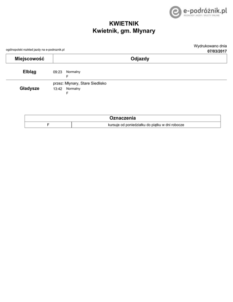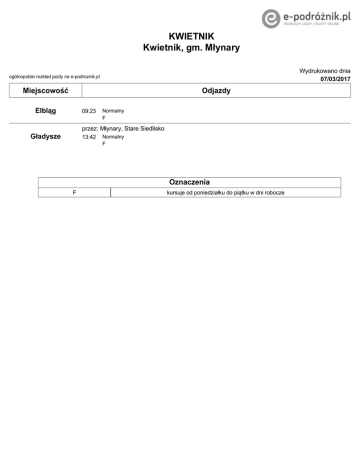 KWIETNIK Kwietnik, gm. Młynary Wydrukowano dnia 07/03/2017 ogólnopolski rozkład jazdy na e-podroznik.pl Miejscowość Odjazdy Elbląg 09:23 Normalny F przez: Młynary, Stare Siedlisko Gładysze 13:42 Normalny F Oznaczenia F kursuje od poniedziałku do piątku w dni robocze