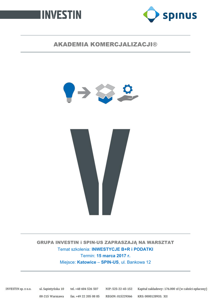 AKADEMIA KOMERCJALIZACJI® GRUPA INVESTIN i SPIN-US ZAPRASZAJĄ NA WARSZTAT Temat szkolenia: INWESTYCJE B+R i PODATKI Termin: 15 marca 2017 r. Miejsce: Katowice – SPIN-US, ul. Bankowa 12 INWESTYCJE B+R I PODATKI Inwestycje w wartości niematerialne i prawne w kontekście nakładów na B+R Wzajemne rozliczenia między podmiotami zaangażowanymi w komercjalizację Ulga na nowe technologie – praktyka, ryzyka i konsekwencje stosowania Termin 15 marca 2017 r., godz. 10:00 – 17:00 Miejsce Katowice, SPIN-US, ul. Bankowa 12 Zakres tematyczny 1. Inwestycje w wartości niematerialne i prawne w kontekście nakładów na B+R a) Wartości niematerialne i prawne b) Innowacje c) Bariery w projektach inwestycyjnych z obszaru B+R 2. Wzajemne rozliczenia między podmiotami zaangażowanymi w komercjalizację a) Co to jest komercjalizacja? b) Koszty utopione c) Czynniki sukcesu projektów B+R d) Przedsiębiorstwa akademickie: spin-off/spin out 3. Ulga na nowe technologie – praktyka, ryzyka i konsekwencje stosowania a) Instrumenty wspierania innowacji w Polsce b) Ulgi podatkowe c) Odpis na fundusz innowacyjności d) Przykłady dobrych praktyk w procesie komercjalizacji Certyfikat Po ukończeniu warsztatów uczestnicy otrzymują certyfikat, potwierdzający zdobyte kompetencje w obszarze komercjalizacji. Metodologia Zajęcia prowadzone są w grupach liczących minimalnie 15 a maksymalnie 20 osób i ukierunkowane są na budowanie relacji biznesowych. Wszystkie treści przekazywane są w oparciu o przykłady konkretnych projektów zaczerpniętych z doświadczenia trenera i Grupy INVESTIN. © 2017 INVESTIN Sp. z o.o. Wszystkie prawa zastrzeżone. 2 Trener Marek Zimoch – Inwestycje B+R i podatki Prawnik, finansista, trener i wykładowca. Absolwent Wydziału Prawa i Administracji Uniwersytetu Łódzkiego oraz Podyplomowego Studium Prawa Podatkowego na Wydziale Prawa i Administracji Uniwersytetu Łódzkiego, przedsiębiorca prowadzący własną działalność gospodarczą w zakresie doradztwa finansowego i gospodarczego pod firmą „MZ LEX Wsparcie Biznesu Marek Zimoch”. Specjalizuje się w następujących obszarach: optymalizacja kosztowopodatkowa, rachunkowość finansowa i zarządcza, zarządzanie rentownością, zarządzanie ryzykiem, kontroling, inżynieria finansowa. Partner Kancelarii Doradztwa Finansowego Finances For You. Szkoleniowiec i wykładowca w zakresie funkcjonowania rynku bankowego i ubezpieczeniowego, planowania finansowego, prowadzenia działalności gospodarczej, funduszy europejskich i innych form pozyskiwania kapitału inwestycyjnego. Wykładowca Wyższej Szkoły Bankowej w Poznaniu, na kierunkach „Studia Menedżerskie” oraz „Zarządzanie ryzykiem”. Członek Rady Łódzkiej Izby Przemysłowo-Handlowej. W 2015 r. wyróżniony Listem Gratulacyjnym Ministra Gospodarki RP. Posiada tytuł „Ambasadora CSR” sygnowany przez Ministerstwo Pracy i Polityki Społecznej RP. Posiada 11 lat doświadczenia trenerskiego zdobytego w ramach ponad 3000 godzin szkoleniowych. Odbiorcy Akademia Komercjalizacji® to program dedykowany następującym grupom osób, odpowiadającym za generowanie i/lub wdrażanie innowacji technologicznych: właściciele, kadra kierownicza, menedżerowie, specjaliści, pomysłodawcy. © 2017 INVESTIN Sp. z o.o. Wszystkie prawa zastrzeżone. 3 Grupa INVESTIN Grupa INVESTIN od ponad 15 lat rozwija i finansuje zaawansowane technologie, poprzez doradztwo biznesowe w obszarze globalnego rynku innowacji, programy akceleracji start-upów oraz inwestycje Venture Capital. SPIN-US Spółka SPIN-US w zakresie obsługi procesu komercjalizacji wiedzy i technologii, działając w kooperacji z naukowcami, brokerami oraz przedstawicielami biznesu, inicjuje wdrażanie innowacyjnych rozwiązań z wielu dziedzin i branż. Koszt uczestnictwa CENA PROMOCYJNA PRZY ZGŁOSZENIACH DO 27.02.2017: 599 PLN + 23% VAT CENA REGULARNA: 799 PLN + 23% VAT Istnieje możliwość uzyskania rabatu przy uczestnictwie kilku osób z tej samej firmy/instytucji. Cena obejmuje: uczestnictwo w zajęciach, materiały szkoleniowe, przerwy kawowe, lunch, certyfikat. Zgłoś się! O uczestnictwie w warsztatach decyduje kolejność zgłoszeń. Osoby zainteresowane udziałem prosimy o niezwłoczne przesłanie formularza zgłoszeniowego na adres [email protected]. Ostateczny termin przyjmowania zgłoszeń to 8 marca 2017 r. Zapraszamy do kontaktu: Katarzyna Michalska Menedżer ds. Rozwoju i Komunikacji [email protected] +48 606 245 499 © 2017 INVESTIN Sp. z o.o. Wszystkie prawa zastrzeżone. 4