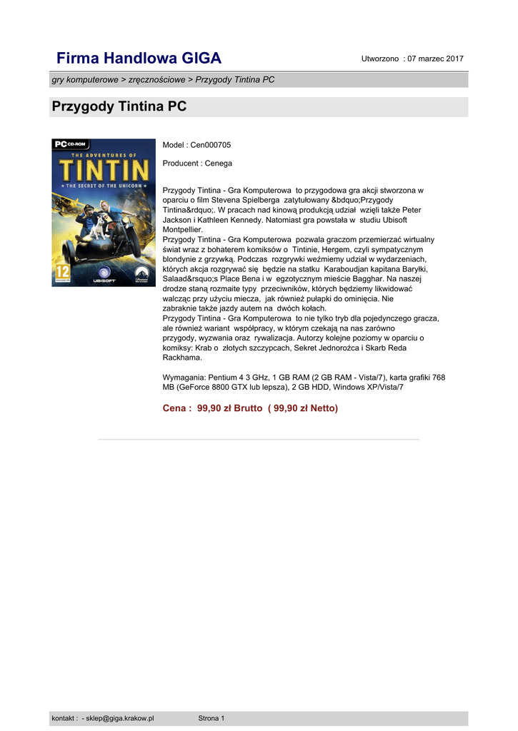 Firma Handlowa GIGA Utworzono : 07 marzec 2017 gry komputerowe > zręcznościowe > Przygody Tintina PC Przygody Tintina PC Model : Cen000705 Producent : Cenega Przygody Tintina - Gra Komputerowa to przygodowa gra akcji stworzona w oparciu o film Stevena Spielberga zatytułowany „Przygody Tintina”. W pracach nad kinową produkcją udział wzięli także Peter Jackson i Kathleen Kennedy. Natomiast gra powstała w studiu Ubisoft Montpellier. Przygody Tintina - Gra Komputerowa pozwala graczom przemierzać wirtualny świat wraz z bohaterem komiksów o Tintinie, Hergem, czyli sympatycznym blondynie z grzywką. Podczas rozgrywki weźmiemy udział w wydarzeniach, których akcja rozgrywać się będzie na statku Karaboudjan kapitana Baryłki, Salaad’s Place Bena i w egzotycznym mieście Bagghar. Na naszej drodze staną rozmaite typy przeciwników, których będziemy likwidować walcząc przy użyciu miecza, jak również pułapki do ominięcia. Nie zabraknie także jazdy autem na dwóch kołach. Przygody Tintina - Gra Komputerowa to nie tylko tryb dla pojedynczego gracza, ale również wariant współpracy, w którym czekają na nas zarówno przygody, wyzwania oraz rywalizacja. Autorzy kolejne poziomy w oparciu o komiksy: Krab o złotych szczypcach, Sekret Jednorożca i Skarb Reda Rackhama. Wymagania: Pentium 4 3 GHz, 1 GB RAM (2 GB RAM - Vista/7), karta grafiki 768 MB (GeForce 8800 GTX lub lepsza), 2 GB HDD, Windows XP/Vista/7 Cena : 99,90 zł Brutto ( 99,90 zł Netto) kontakt : - [email protected] Strona 1