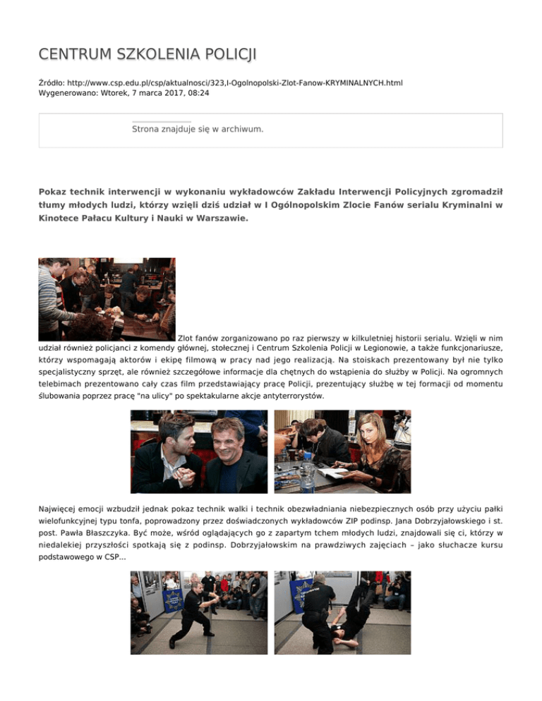 CENTRUM SZKOLENIA POLICJI Źródło: http://www.csp.edu.pl/csp/aktualnosci/323,I-Ogolnopolski-Zlot-Fanow-KRYMINALNYCH.html Wygenerowano: Wtorek, 7 marca 2017, 08:24 Strona znajduje się w archiwum. Pokaz technik interwencji w wykonaniu wykładowców Zakładu Interwencji Policyjnych zgromadził tłumy młodych ludzi, którzy wzięli dziś udział w I Ogólnopolskim Zlocie Fanów serialu Kryminalni w Kinotece Pałacu Kultury i Nauki w Warszawie. Zlot fanów zorganizowano po raz pierwszy w kilkuletniej historii serialu. Wzięli w nim udział również policjanci z komendy głównej, stołecznej i Centrum Szkolenia Policji w Legionowie, a także funkcjonariusze, którzy wspomagają aktorów i ekipę filmową w pracy nad jego realizacją. Na stoiskach prezentowany był nie tylko specjalistyczny sprzęt, ale również szczegółowe informacje dla chętnych do wstąpienia do służby w Policji. Na ogromnych telebimach prezentowano cały czas film przedstawiający pracę Policji, prezentujący służbę w tej formacji od momentu ślubowania poprzez pracę "na ulicy" po spektakularne akcje antyterrorystów. Najwięcej emocji wzbudził jednak pokaz technik walki i technik obezwładniania niebezpiecznych osób przy użyciu pałki wielofunkcyjnej typu tonfa, poprowadzony przez doświadczonych wykładowców ZIP podinsp. Jana Dobrzyjałowskiego i st. post. Pawła Błaszczyka. Być może, wśród oglądających go z zapartym tchem młodych ludzi, znajdowali się ci, którzy w niedalekiej przyszłości spotkają się z podinsp. Dobrzyjałowskim na prawdziwych zajęciach – jako słuchacze kursu podstawowego w CSP... Piotr Maciejczak, ZKS zdj. autor Ocena: 0/5 (0) Tweetnij